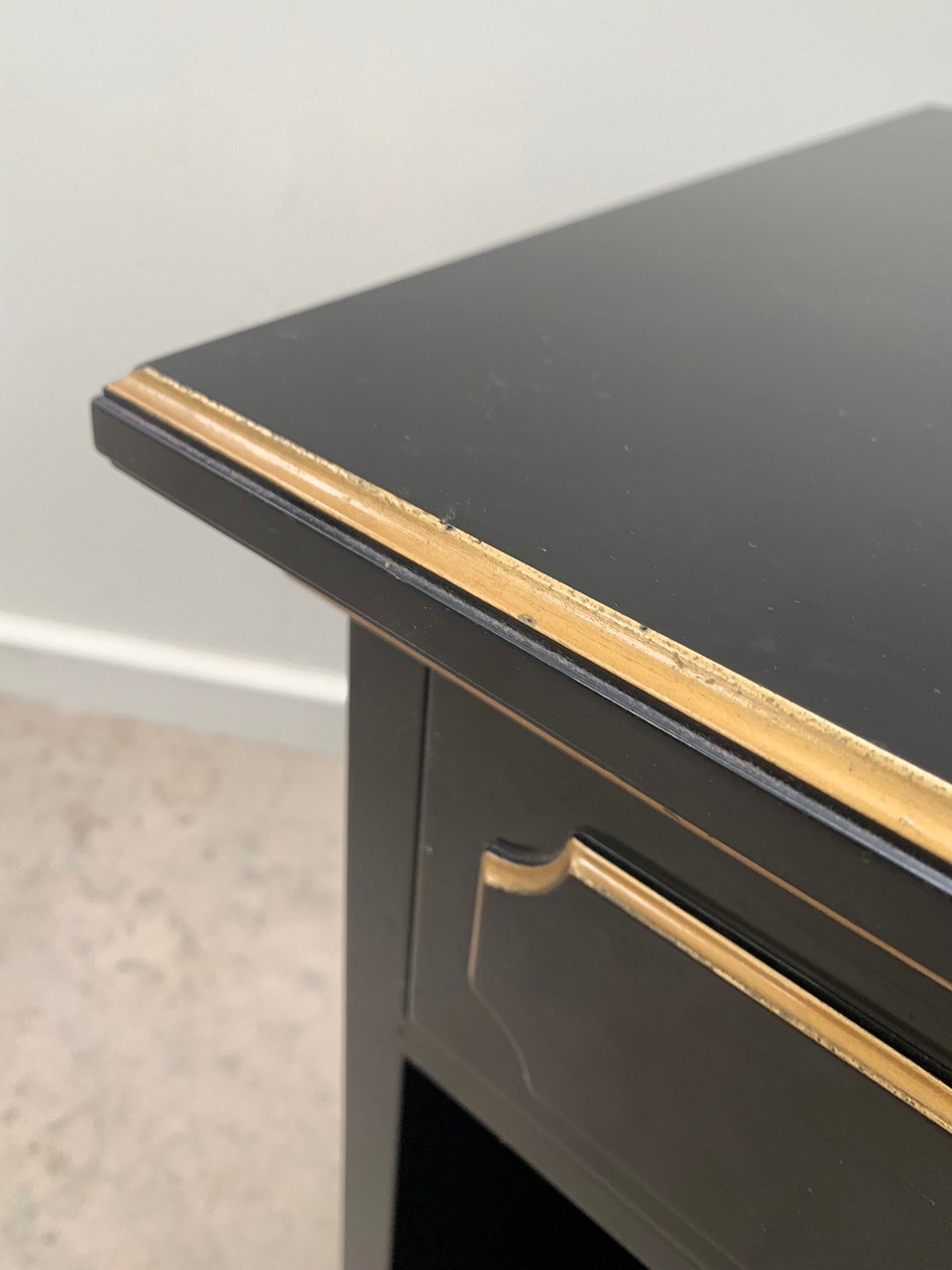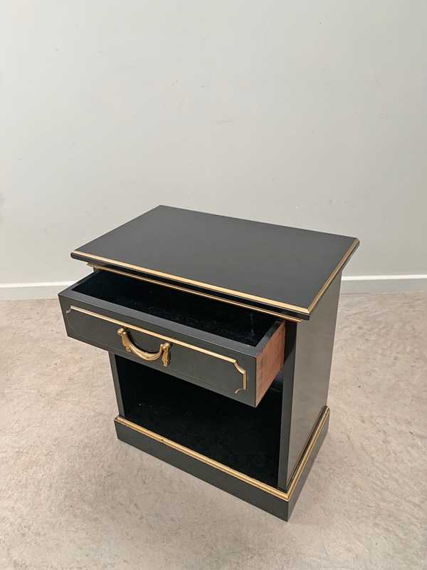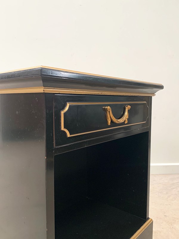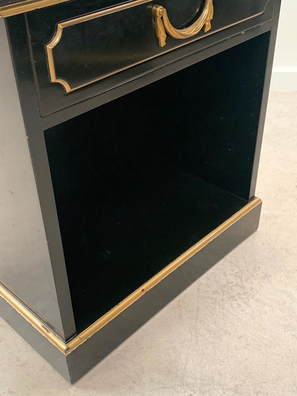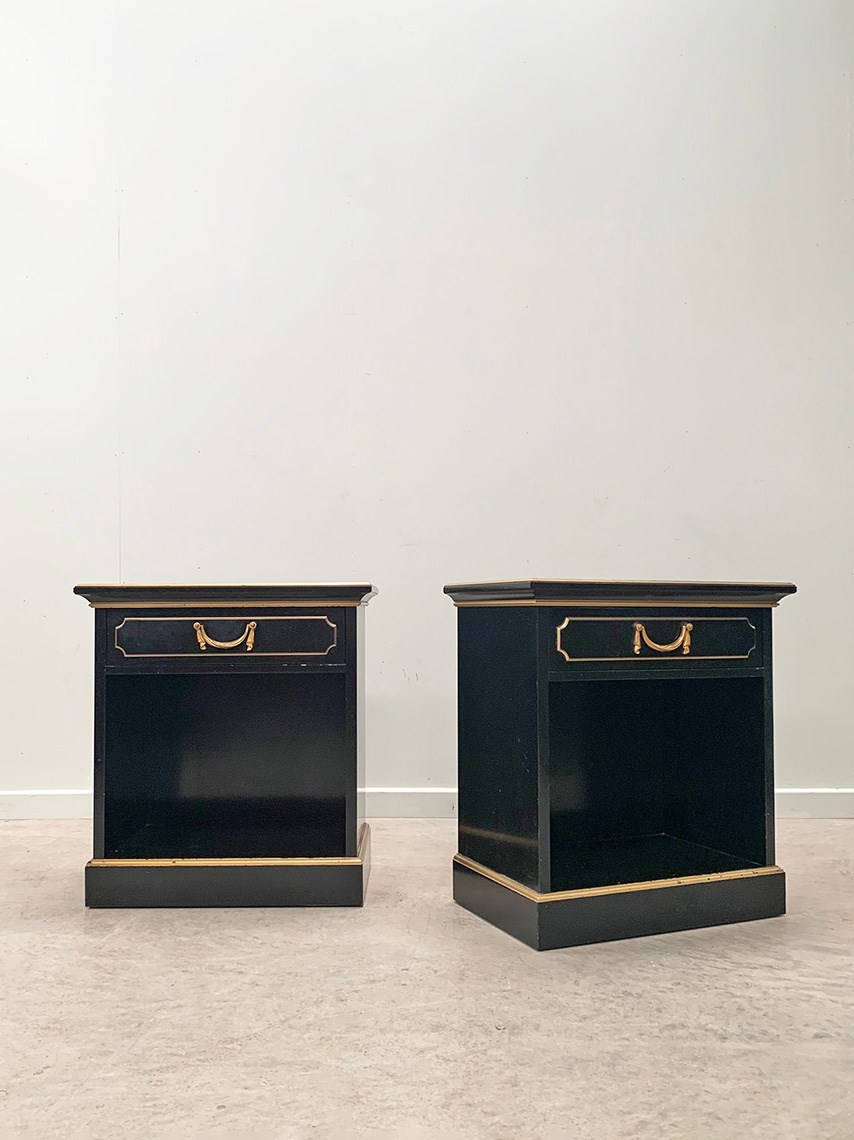 A striking pair of 1950s bedside cabinets by renowned French designer, Maurice Hirsch; the name is signed on the back. Varnished black, with brass details, they each have a drawer and a large storage compartment below. There are some small scuffs to the varnish, which we can re-colour. They have remained in overall very good condition. Sourced from a house in Limoges, Central France. W50.5cm x H58.5cm x D (top) 28cm / (bottom) 30.5cm Delivery: please send us an enquiry with your delivery postcode & we shall obtain a quote from our courier for you. These are available to view in our York showroom, YO32 9SU.