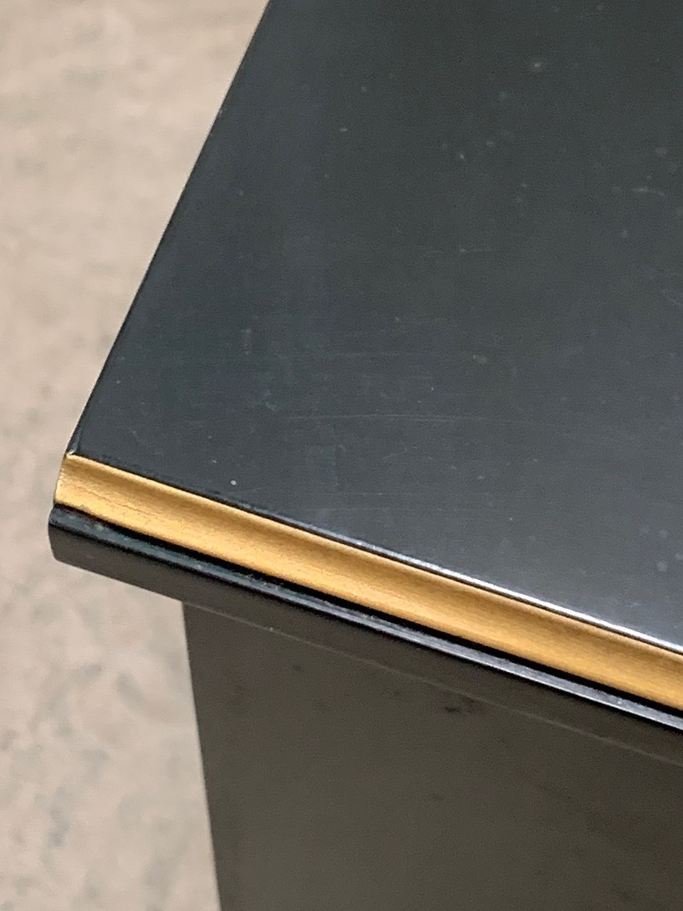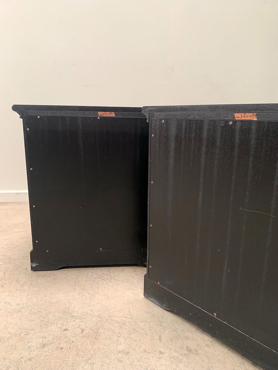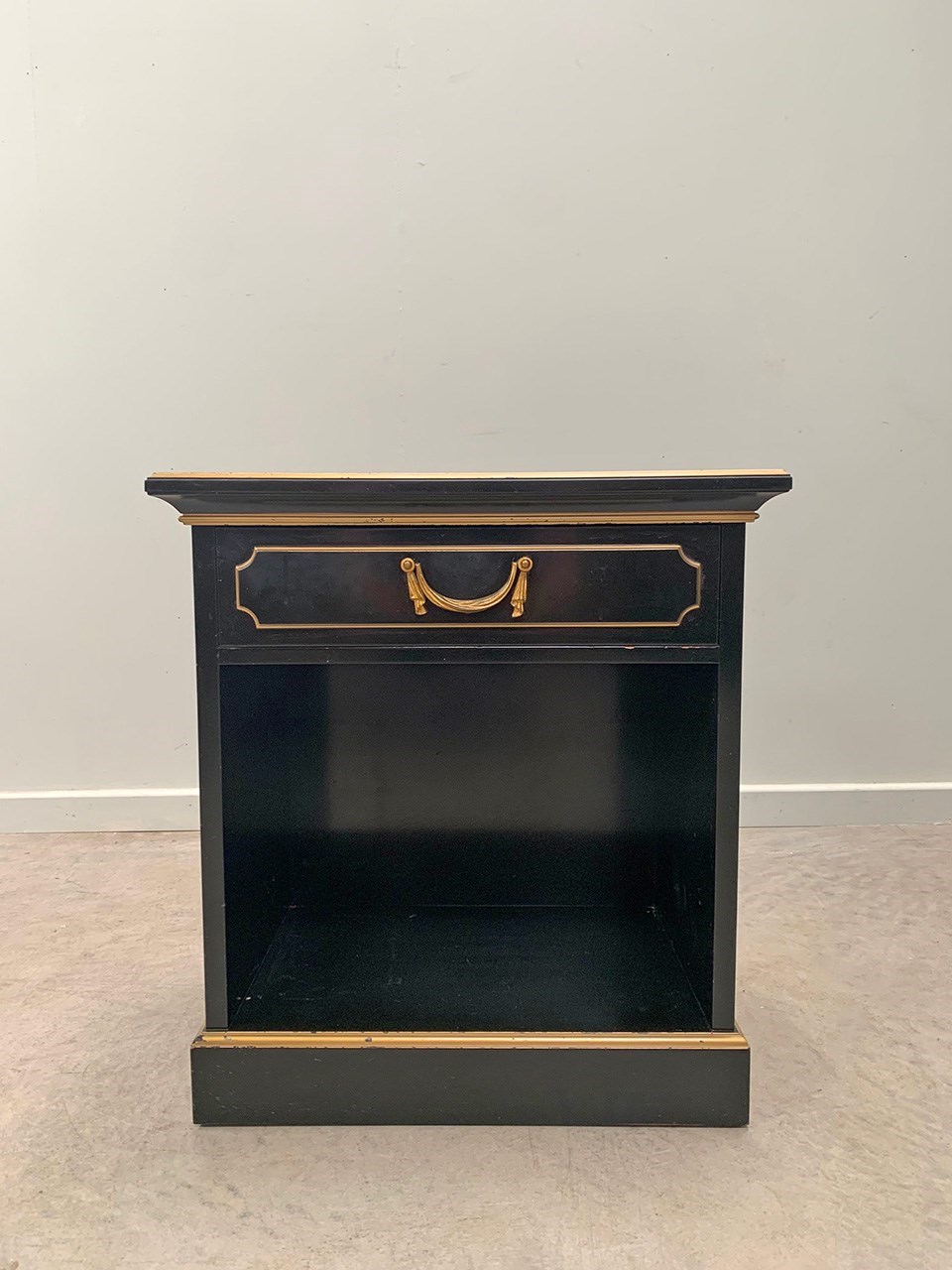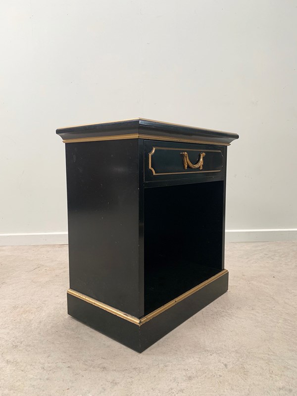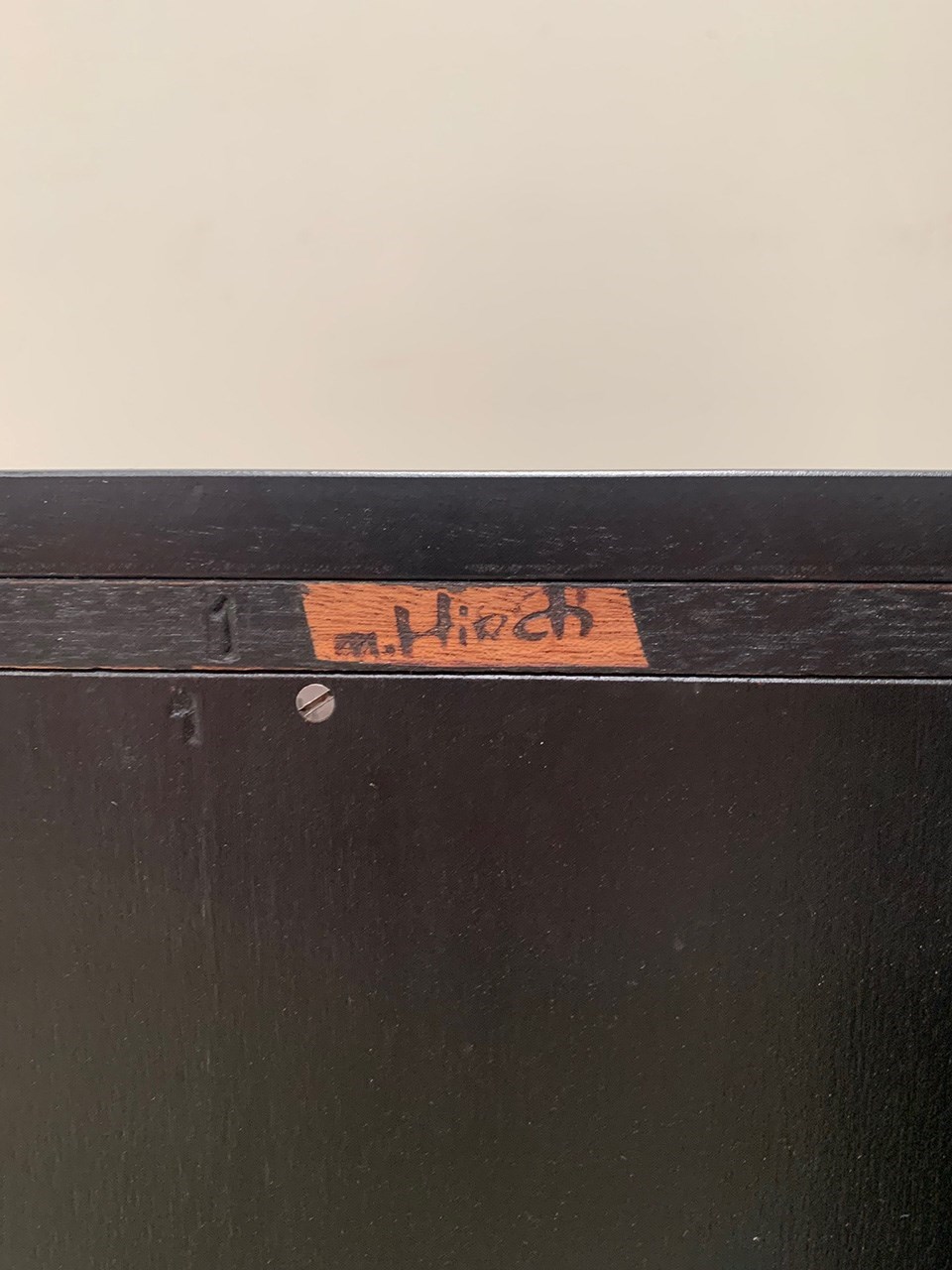 A striking pair of 1950s bedside cabinets by renowned French designer, Maurice Hirsch; the name is signed on the back. Varnished black, with brass details, they each have a drawer and a large storage compartment below. There are some small scuffs to the varnish, which we can re-colour. They have remained in overall very good condition. Sourced from a house in Limoges, Central France. W50.5cm x H58.5cm x D (top) 28cm / (bottom) 30.5cm Delivery: please send us an enquiry with your delivery postcode & we shall obtain a quote from our courier for you. These are available to view in our York showroom, YO32 9SU.