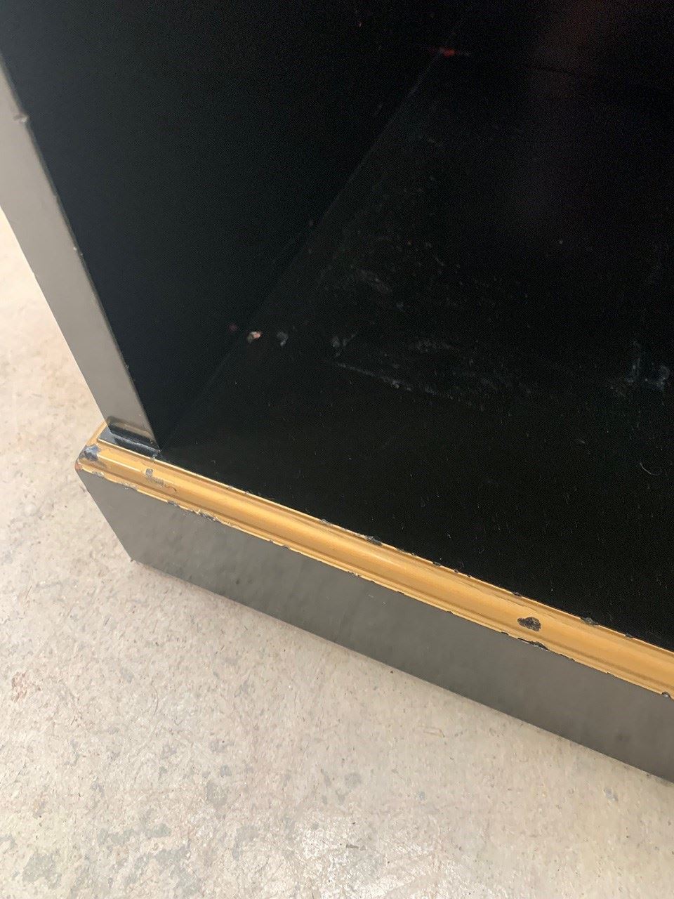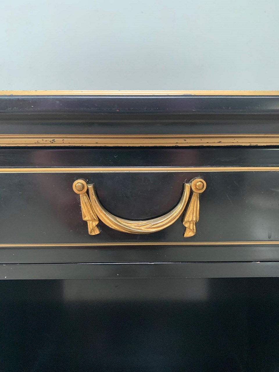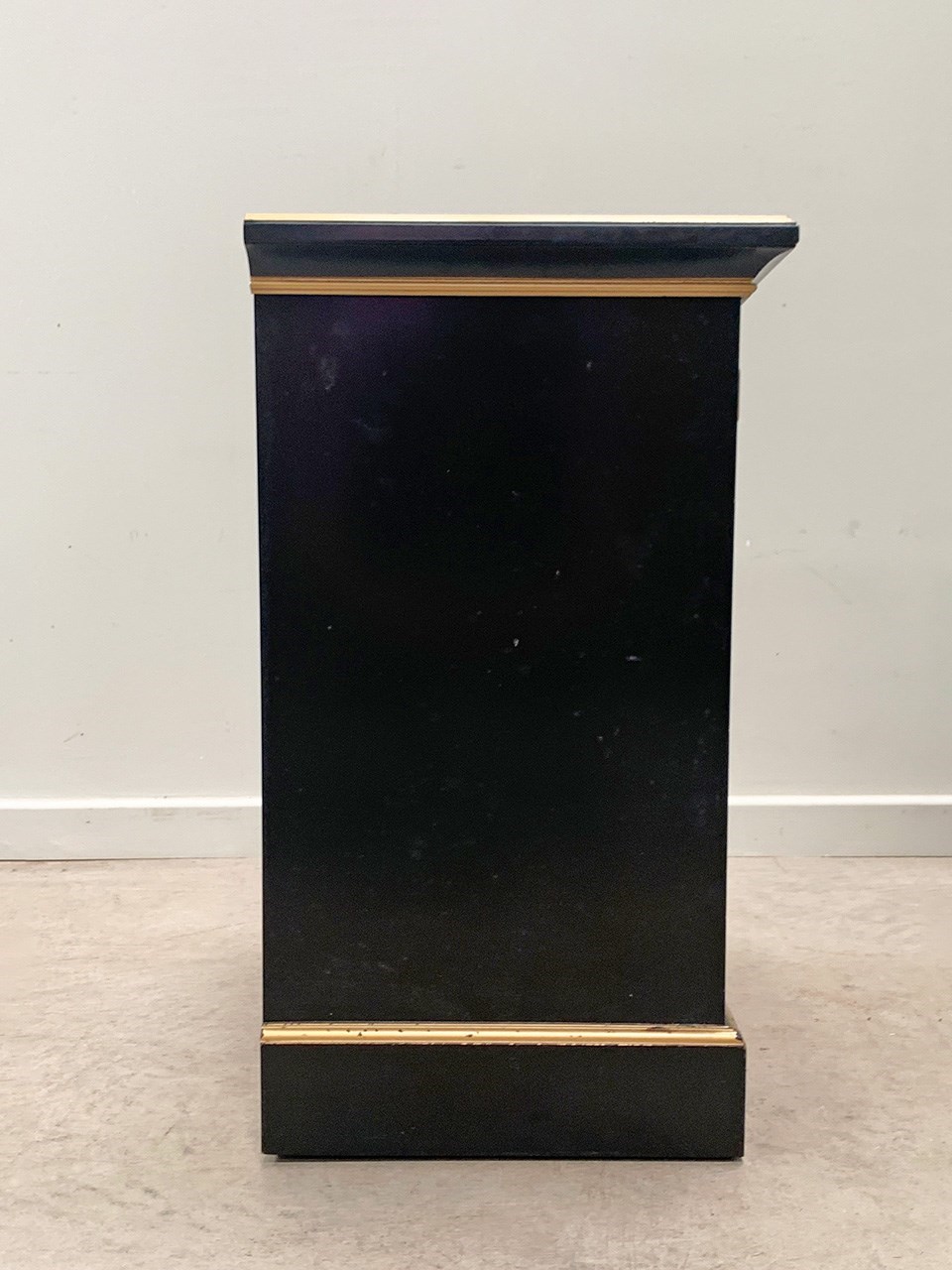 A striking pair of 1950s bedside cabinets by renowned French designer, Maurice Hirsch; the name is signed on the back. Varnished black, with brass details, they each have a drawer and a large storage compartment below. There are some small scuffs to the varnish, which we can re-colour. They have remained in overall very good condition. Sourced from a house in Limoges, Central France. W50.5cm x H58.5cm x D (top) 28cm / (bottom) 30.5cm Delivery: please send us an enquiry with your delivery postcode & we shall obtain a quote from our courier for you. These are available to view in our York showroom, YO32 9SU.