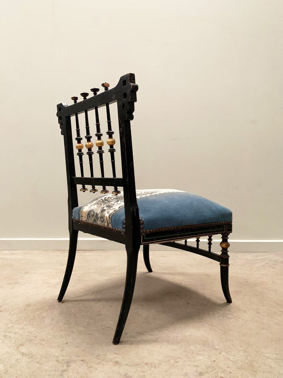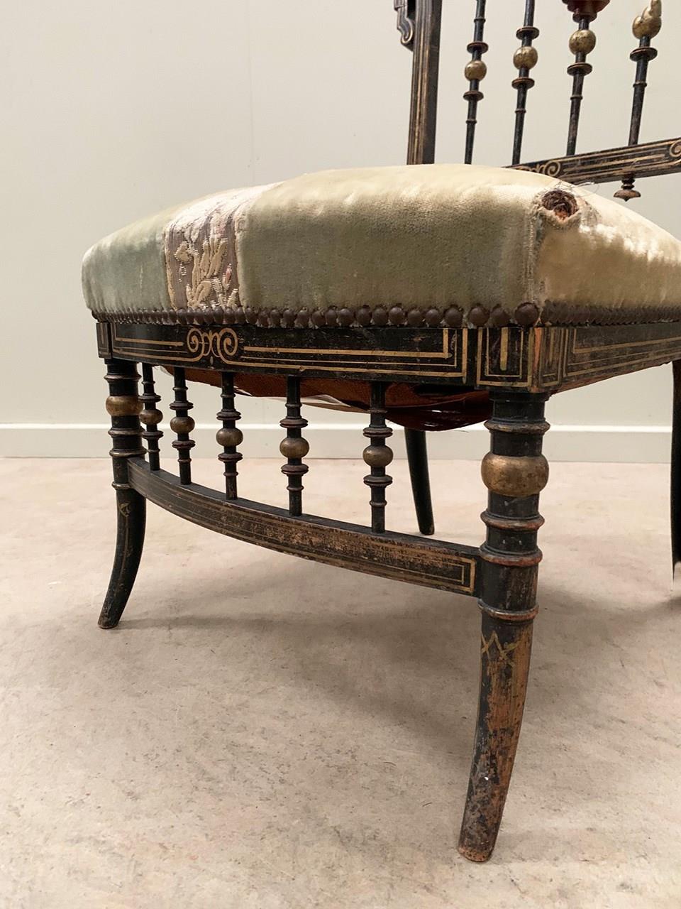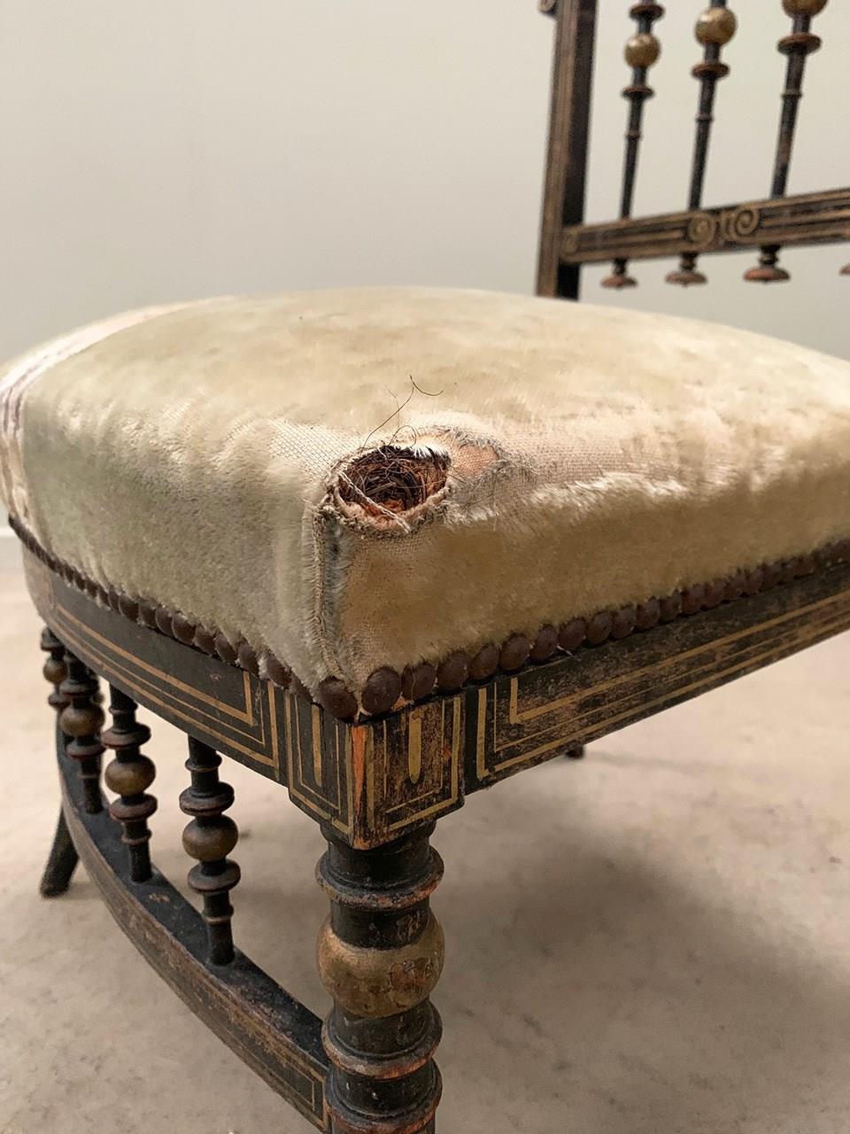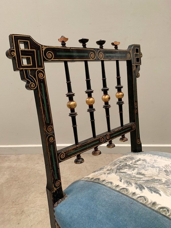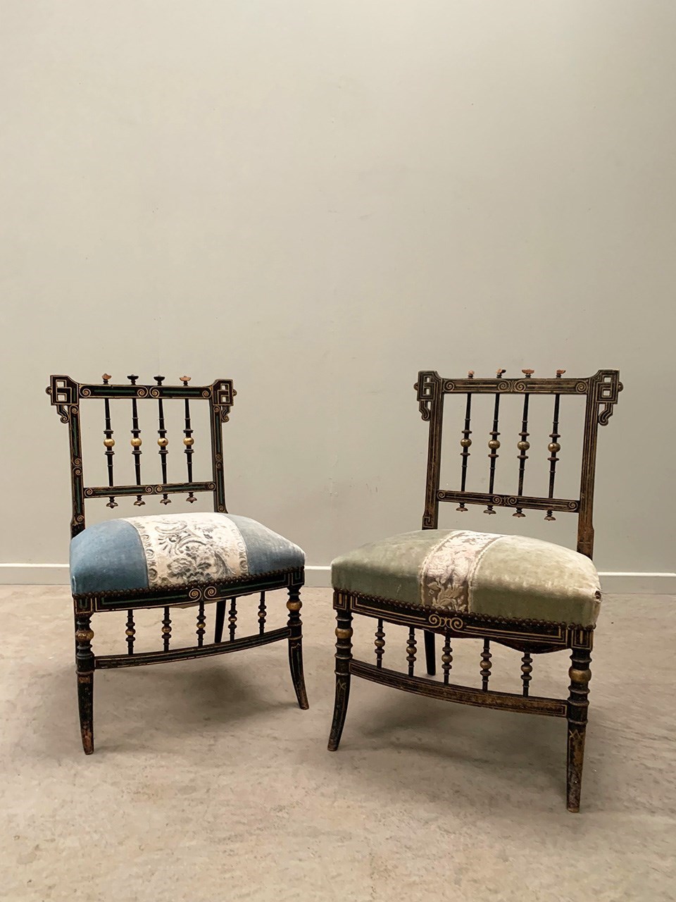 A near identical pair of Napoleon III salon chairs, with an ebonised frame, colourful patterns and gilded detailing throughout, and sabre legs. The colours are slightly faded on one of the chairs (right). Sourced from Nevers, Loire Valley. Each chair has four finials fixed to the top edge of the backrest, however there is visible damage. All other spindles are complete and in very good condition. With sprung seats, the upholstery is lightly worn in places, but remains usable. We can quote to re-upholster, as well as replace the finials; please ask. Priced and sold as a pair. Left: W46cm x H (seat) 38cm / (back) 68cm x D48cm Right: W46cm x H (seat) 38cm / (back) 70.5cm x D48cm Delivery: please send us an enquiry with your delivery postcode & we shall obtain a quote from our courier for you. These are available to view in our York showroom, YO32 9SU.