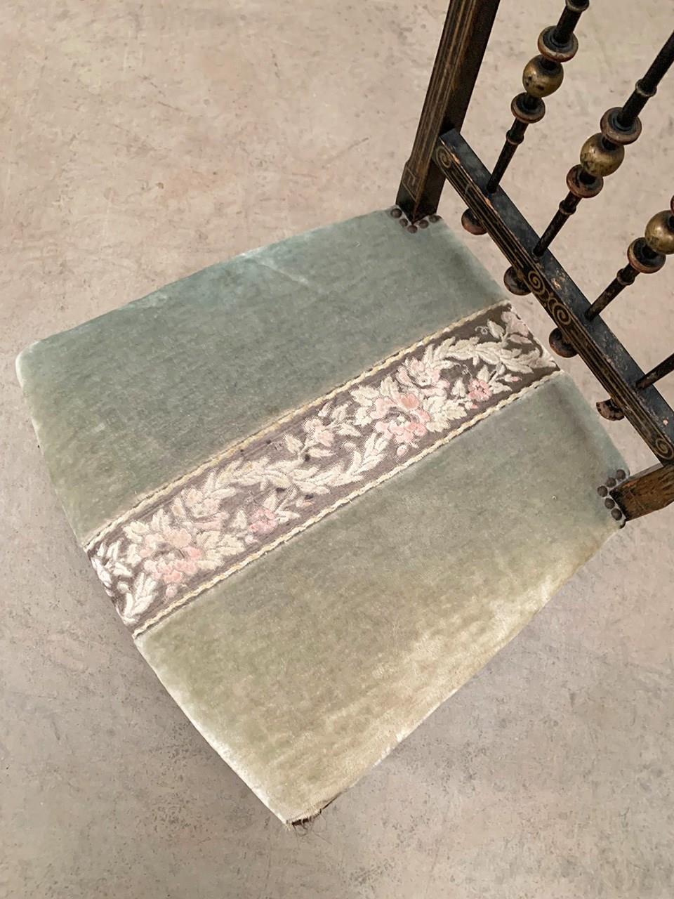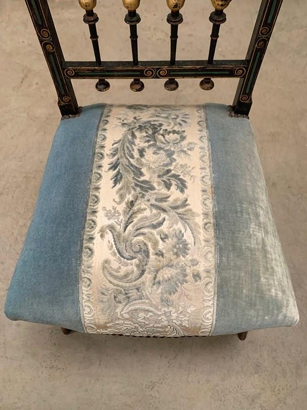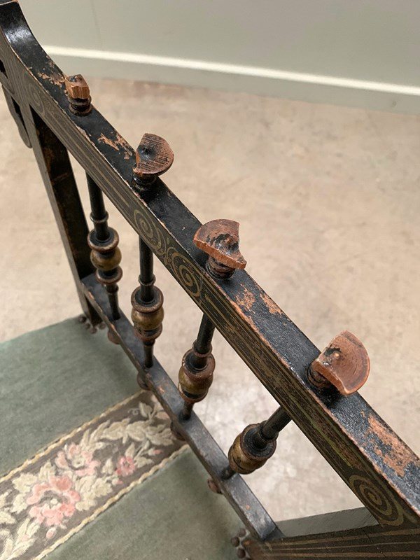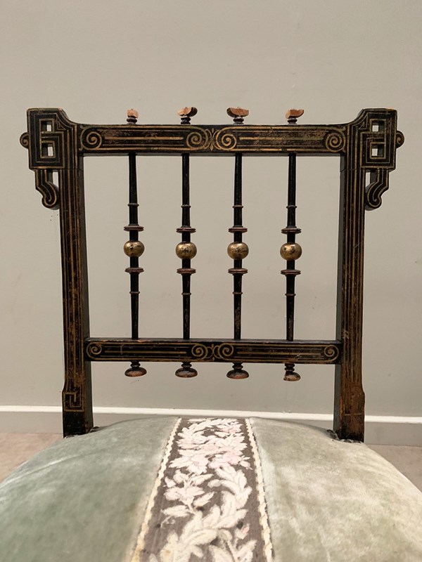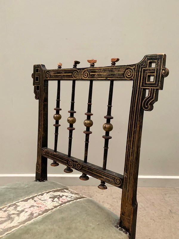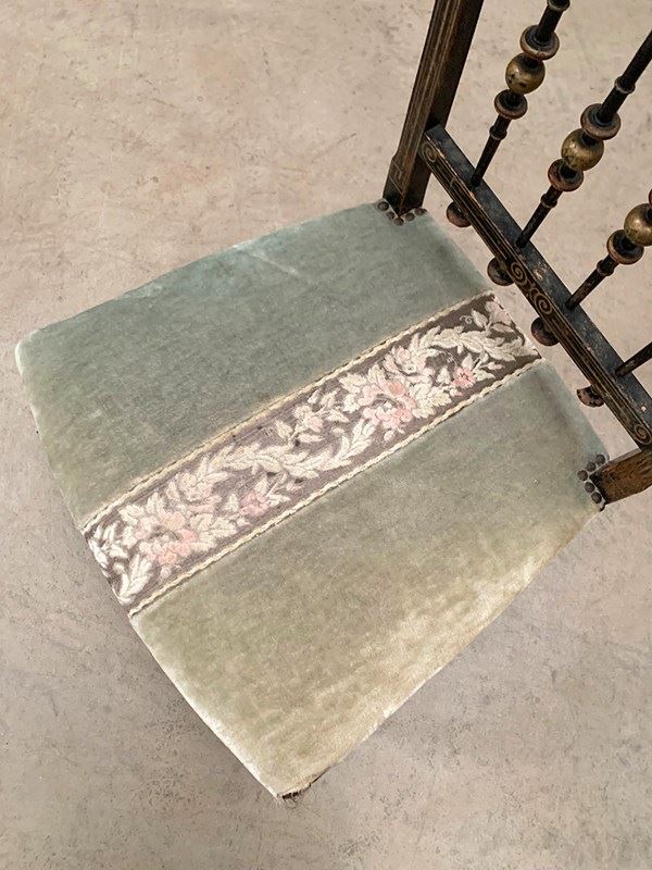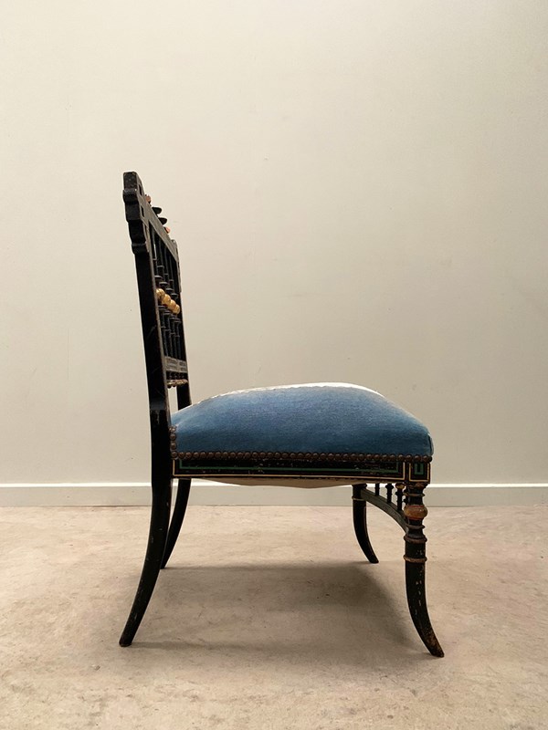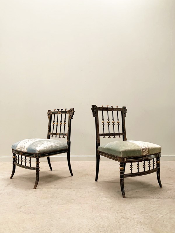 A near identical pair of Napoleon III salon chairs, with an ebonised frame, colourful patterns and gilded detailing throughout, and sabre legs. The colours are slightly faded on one of the chairs (right). Sourced from Nevers, Loire Valley. Each chair has four finials fixed to the top edge of the backrest, however there is visible damage. All other spindles are complete and in very good condition. With sprung seats, the upholstery is lightly worn in places, but remains usable. We can quote to re-upholster, as well as replace the finials; please ask. Priced and sold as a pair. Left: W46cm x H (seat) 38cm / (back) 68cm x D48cm Right: W46cm x H (seat) 38cm / (back) 70.5cm x D48cm Delivery: please send us an enquiry with your delivery postcode & we shall obtain a quote from our courier for you. These are available to view in our York showroom, YO32 9SU.