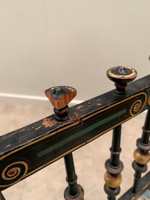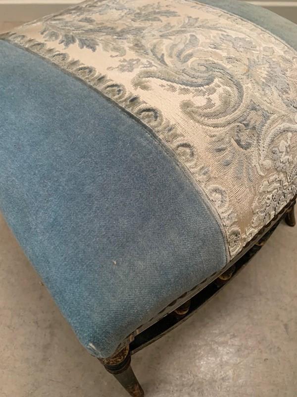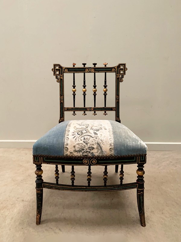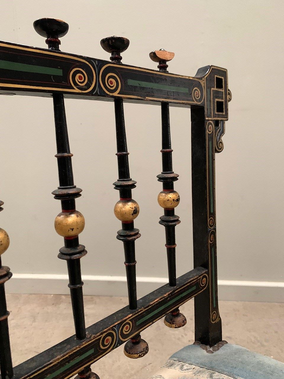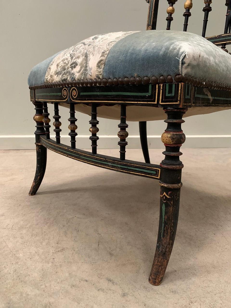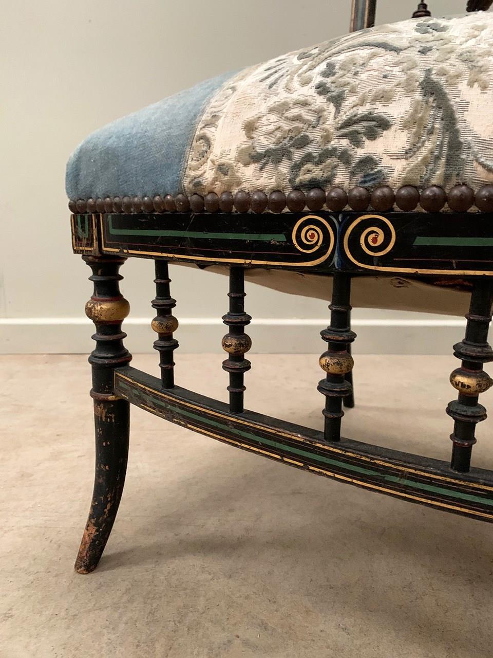 A near identical pair of Napoleon III salon chairs, with an ebonised frame, colourful patterns and gilded detailing throughout, and sabre legs. The colours are slightly faded on one of the chairs (right). Sourced from Nevers, Loire Valley. Each chair has four finials fixed to the top edge of the backrest, however there is visible damage. All other spindles are complete and in very good condition. With sprung seats, the upholstery is lightly worn in places, but remains usable. We can quote to re-upholster, as well as replace the finials; please ask. Priced and sold as a pair. Left: W46cm x H (seat) 38cm / (back) 68cm x D48cm Right: W46cm x H (seat) 38cm / (back) 70.5cm x D48cm Delivery: please send us an enquiry with your delivery postcode & we shall obtain a quote from our courier for you. These are available to view in our York showroom, YO32 9SU.