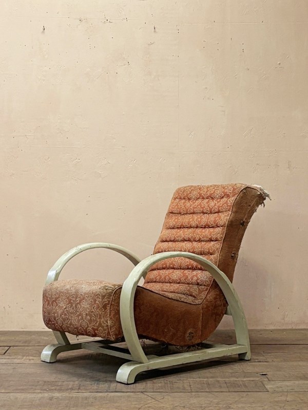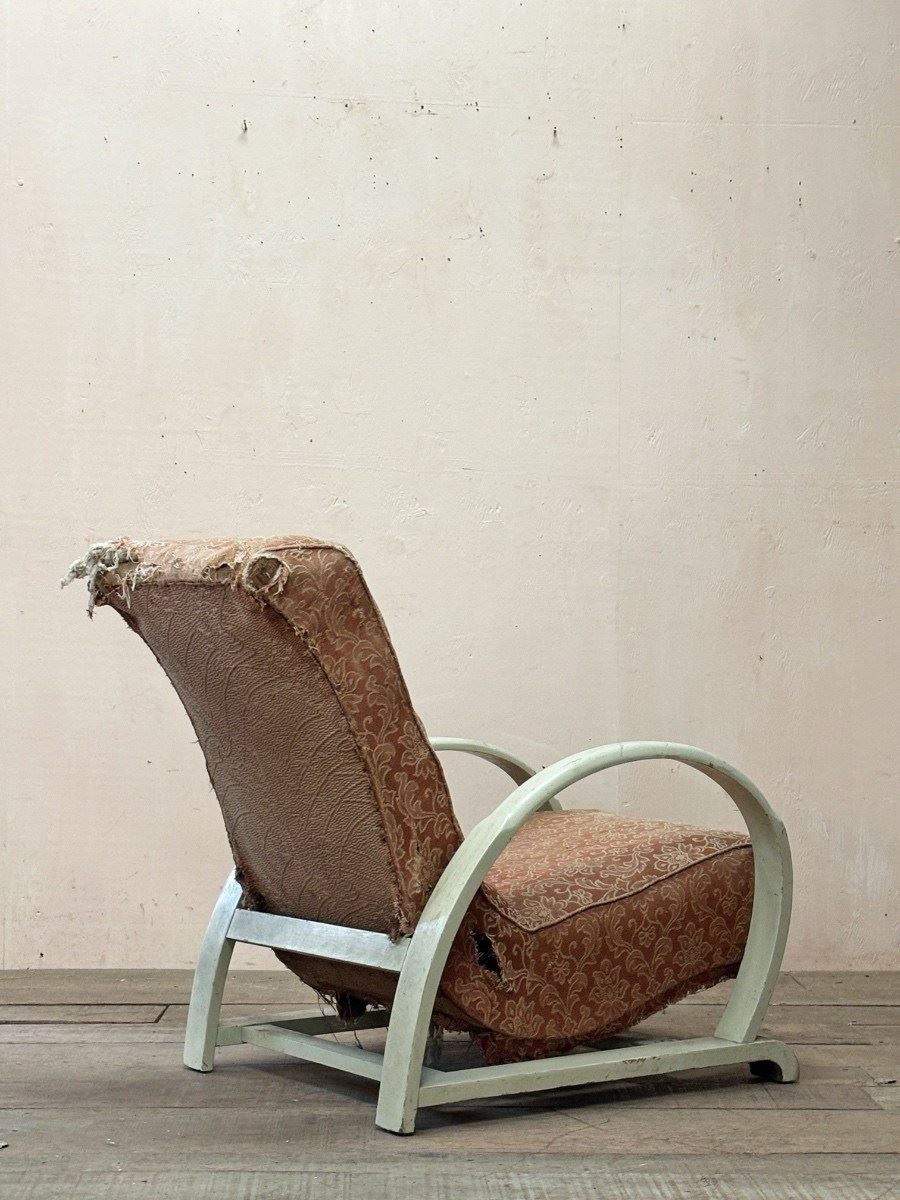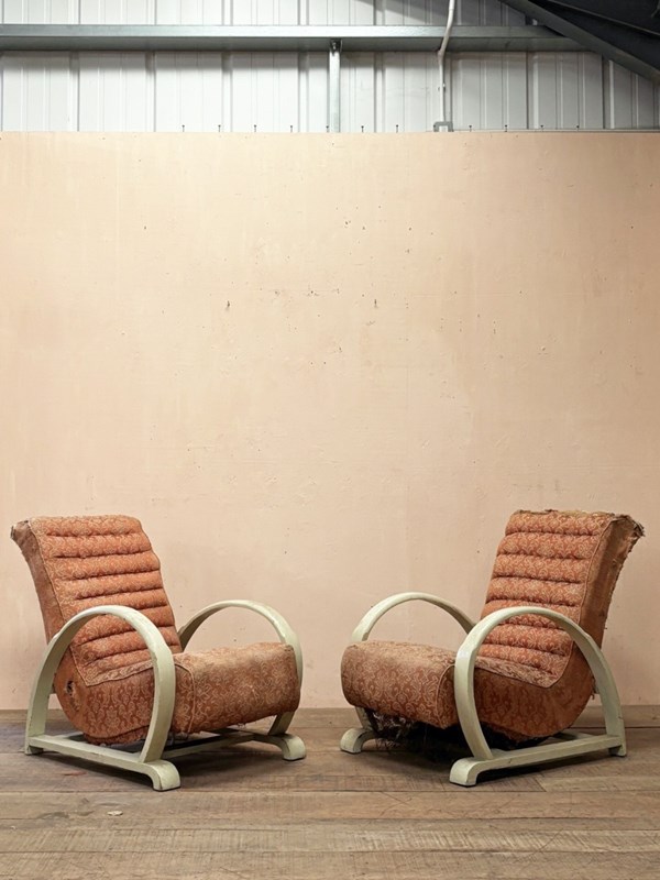Pair of 1930-40’s armchairs with looped, bentwood arms on a stretcher base, retaining their original paint and for re-upholstery.