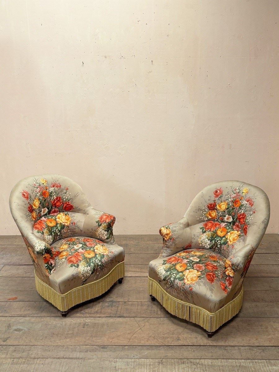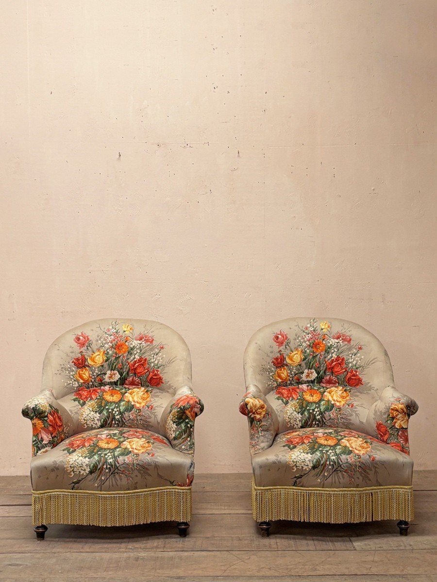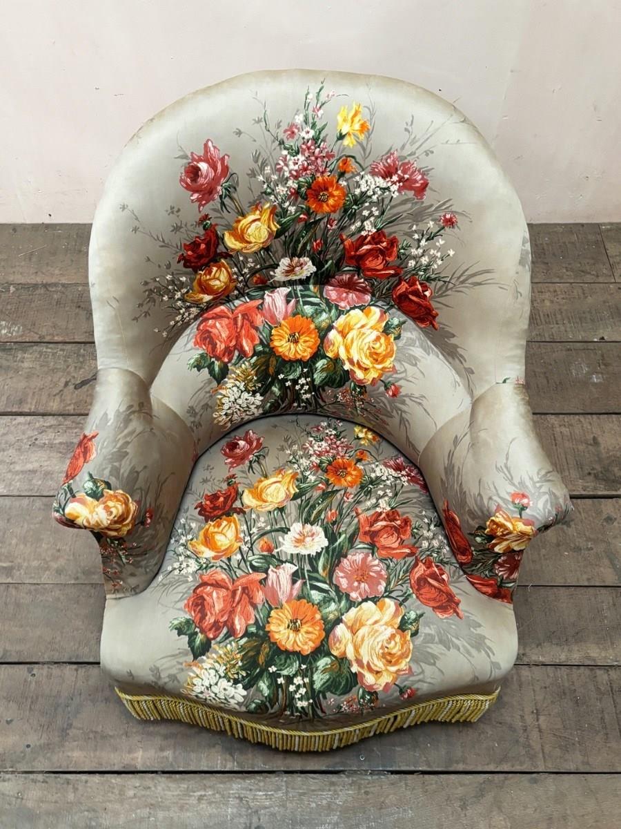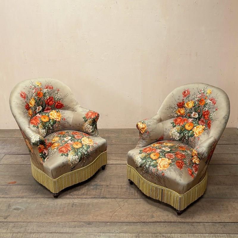 Pair of mid 19th century tub armchairs in excellent condition retaining their original printed floral silk upholstery and fringed skirts.