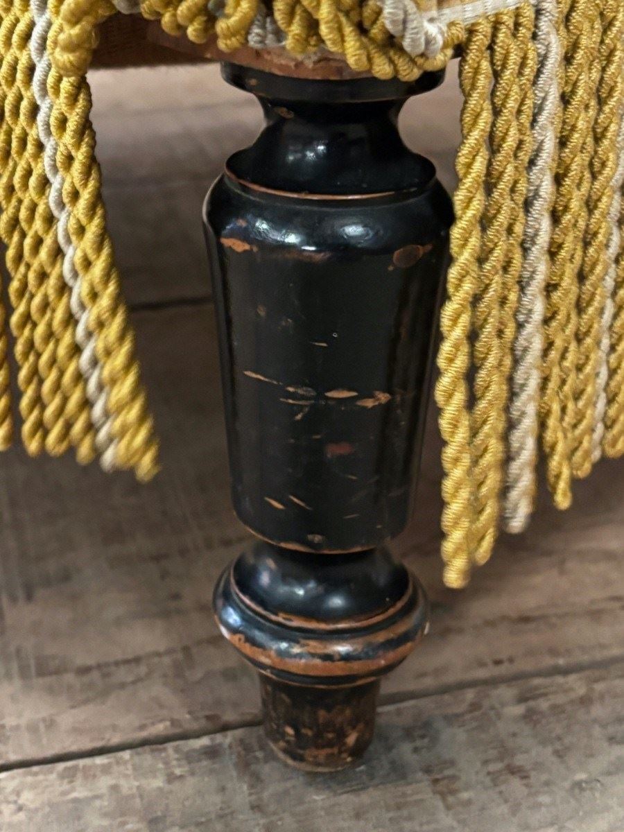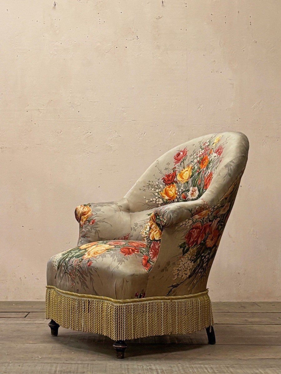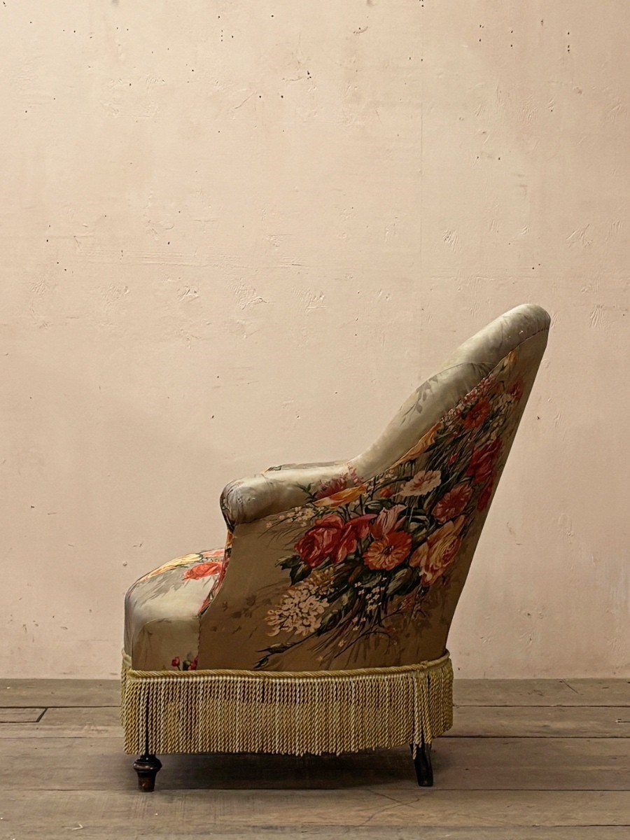 Pair of mid 19th century tub armchairs in excellent condition retaining their original printed floral silk upholstery and fringed skirts.