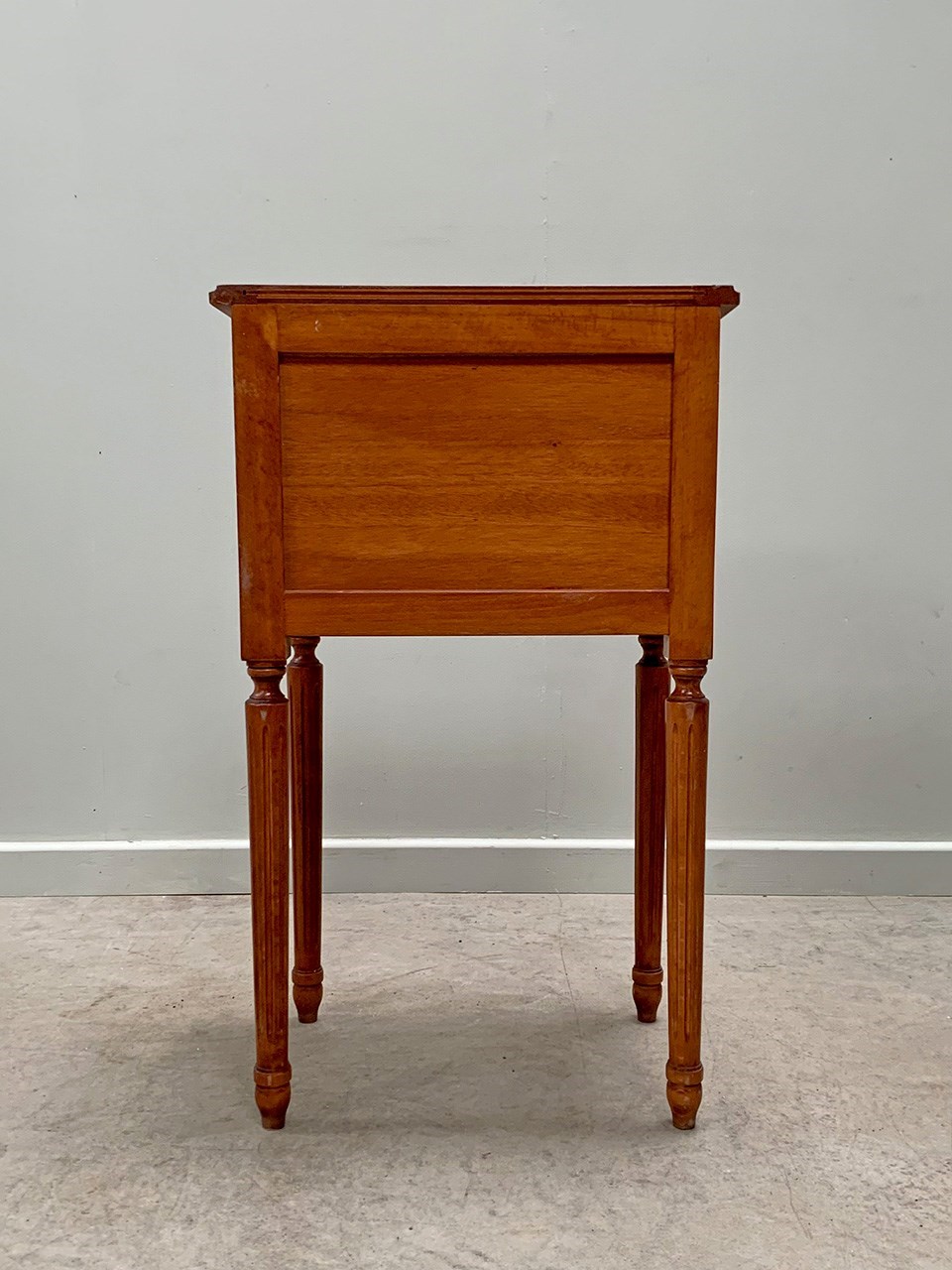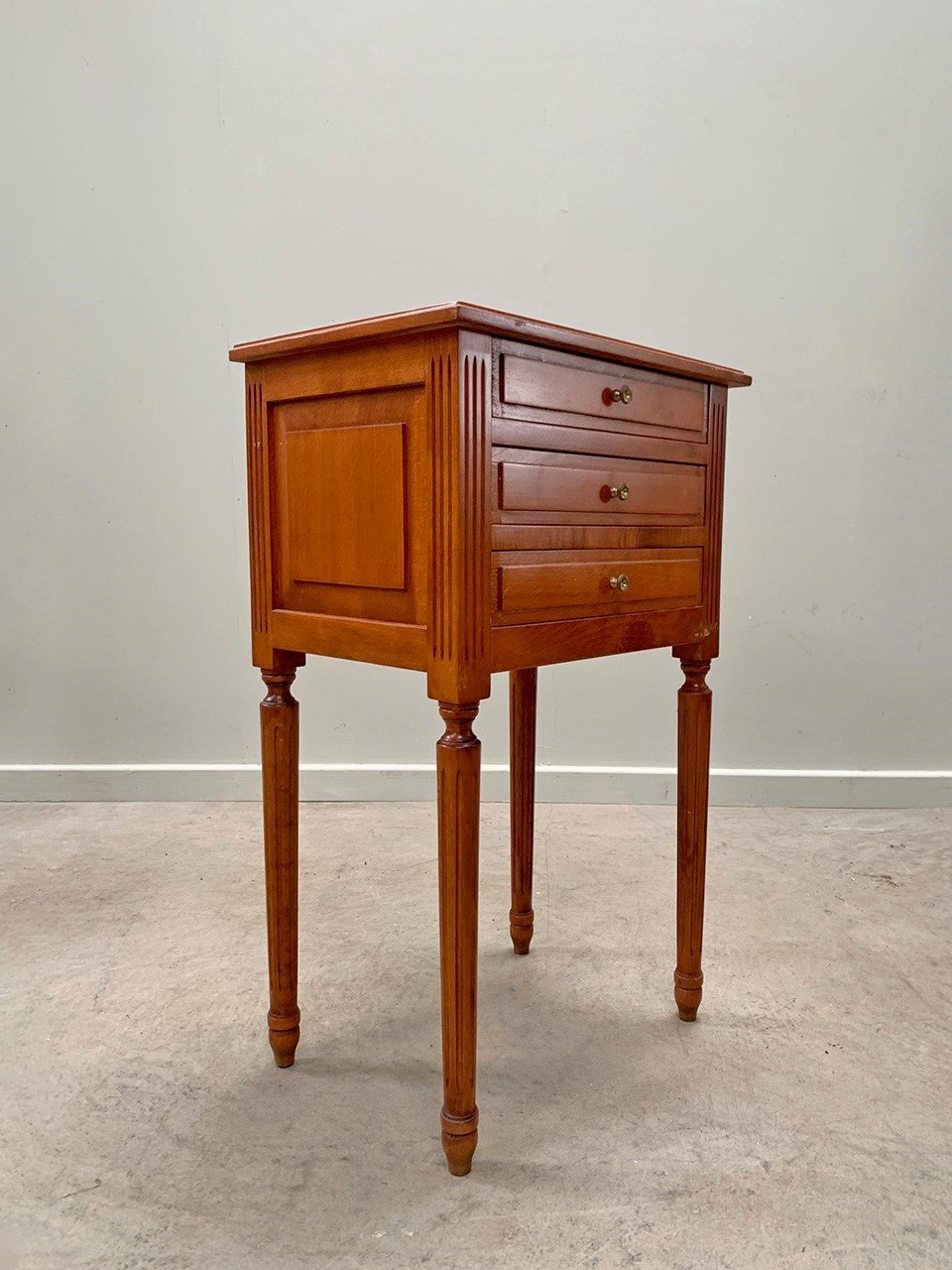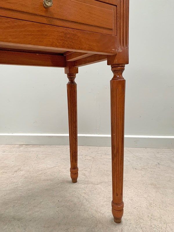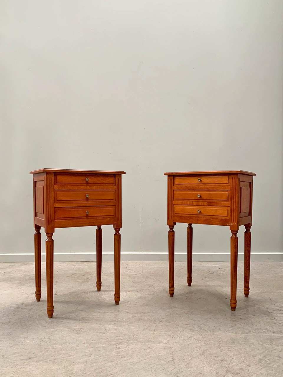 Neat pair of bedsides each with three drawers and on fluted legs.