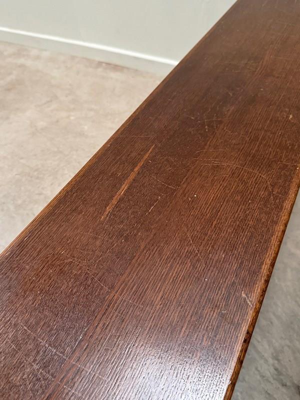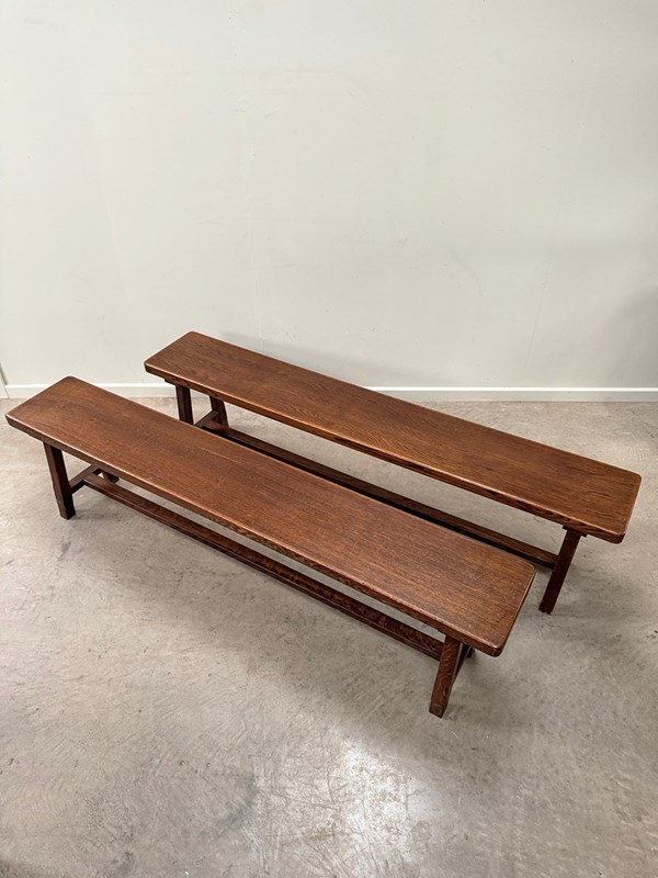 Two solid and generously sized oak benches which are heavy and are in sturdy condition.