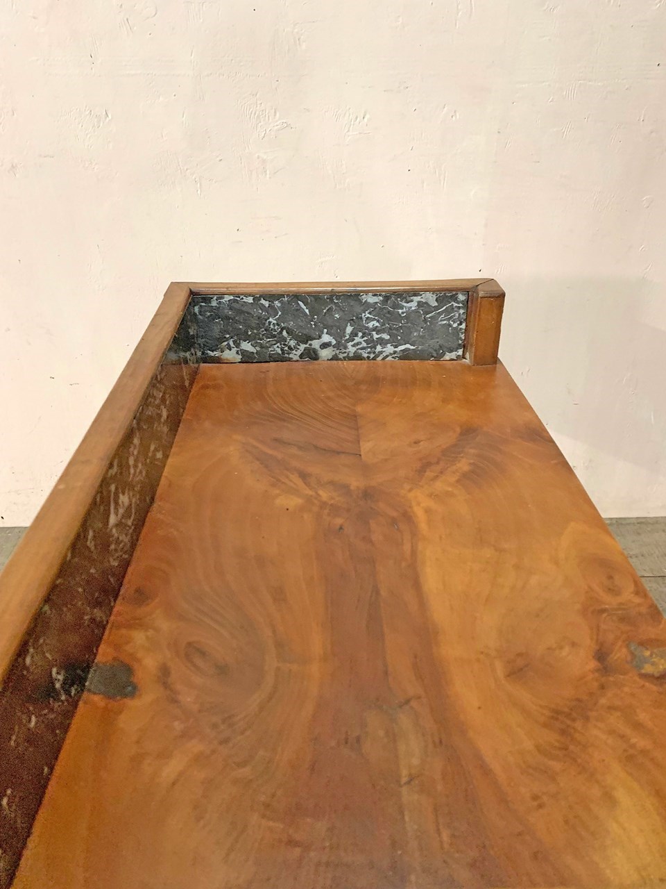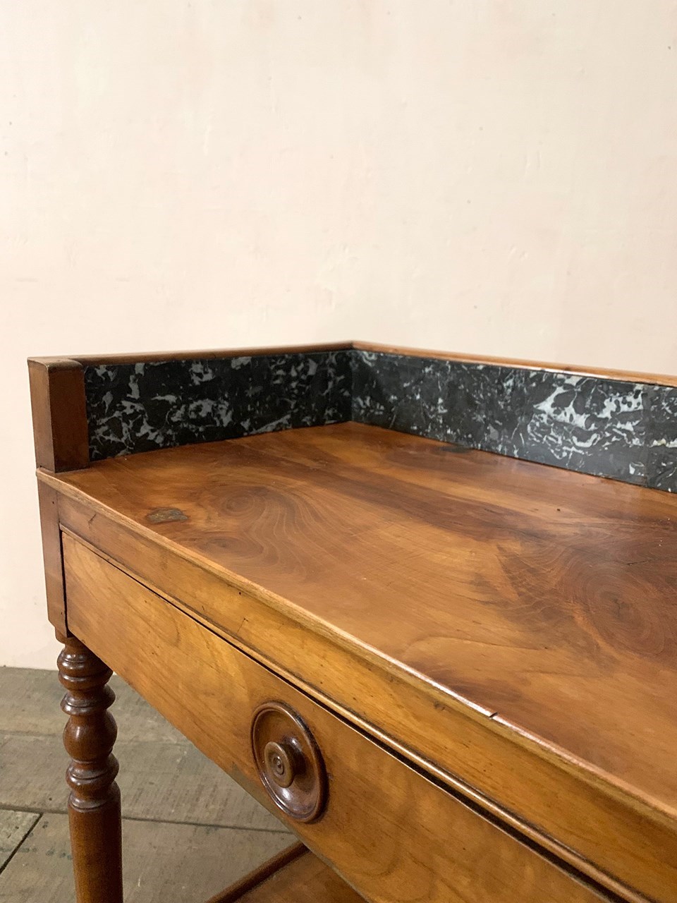 The washstand has a dark grey veined marble upright (which has had an historic repair to the back), a wide front drawer and a lower shelf.