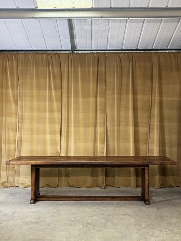 This refectory base table has a narrow footprint, allowing seating all round, with legs set in at the ends, providing space for a chair at both head and foot of the table.