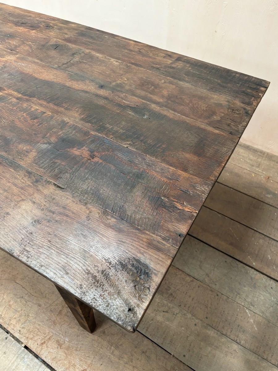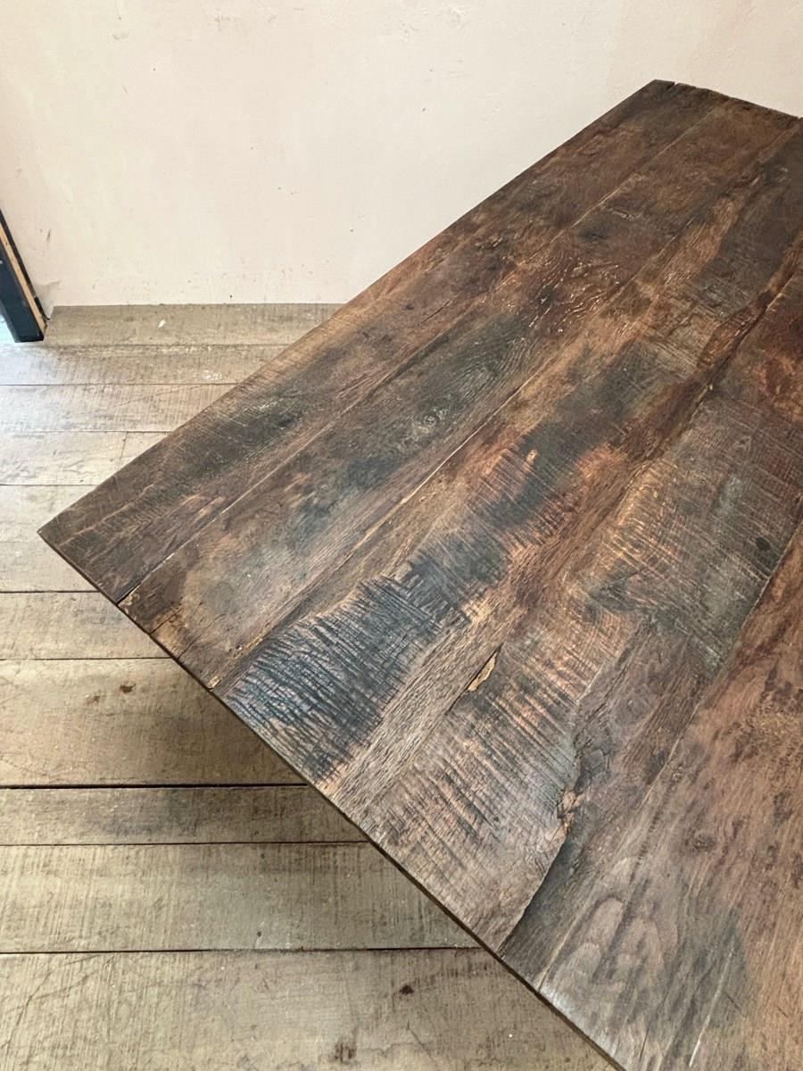 6 seater dining table made entirely from reclaimed materials, featuring a beautiful rustic top of ancient pit sawn (hand cut) oak boards.
