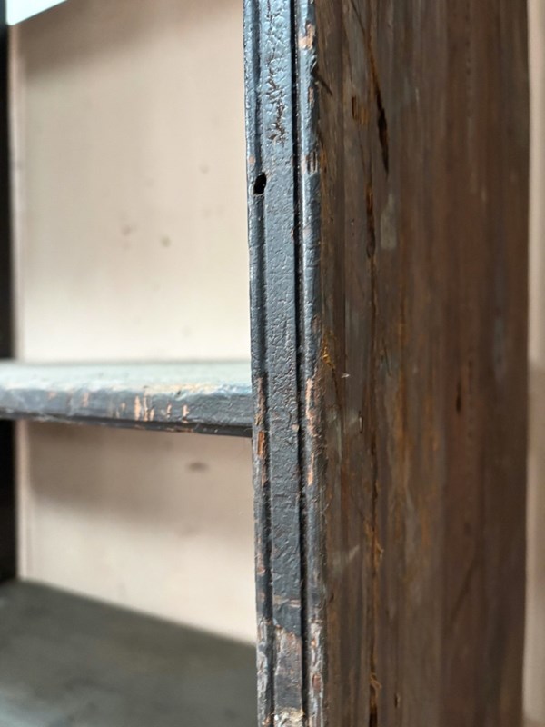 Late 19th century pine shop fitting with architectural, pedimented top and original brown glazed, cracked lacquer.