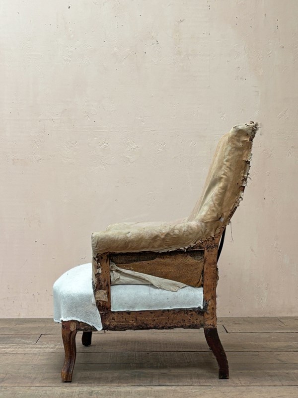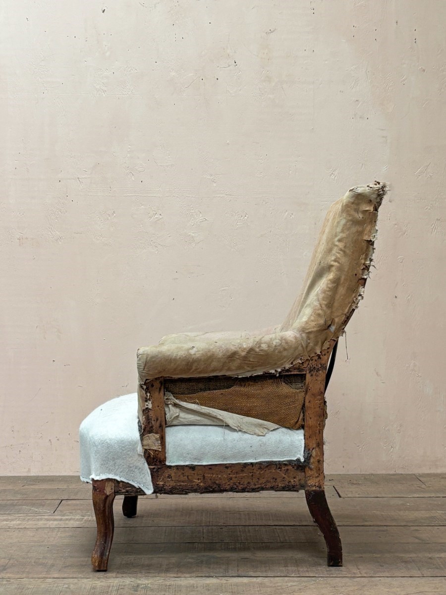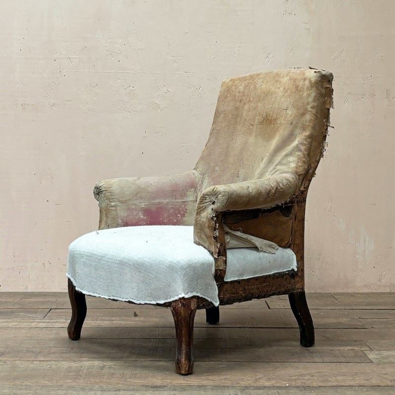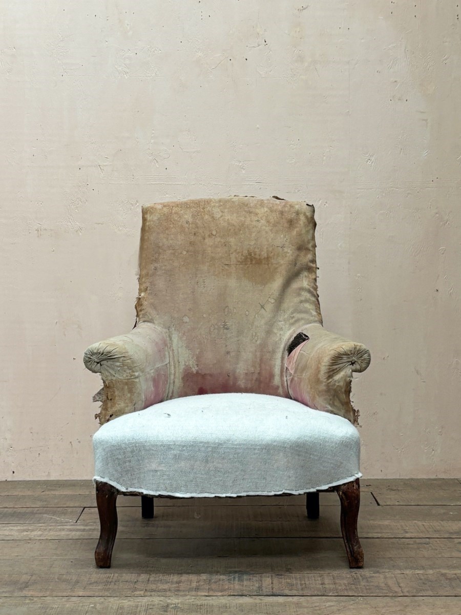 We have restored the frame and put a new seat in, the armchair is now ready for its top cover.