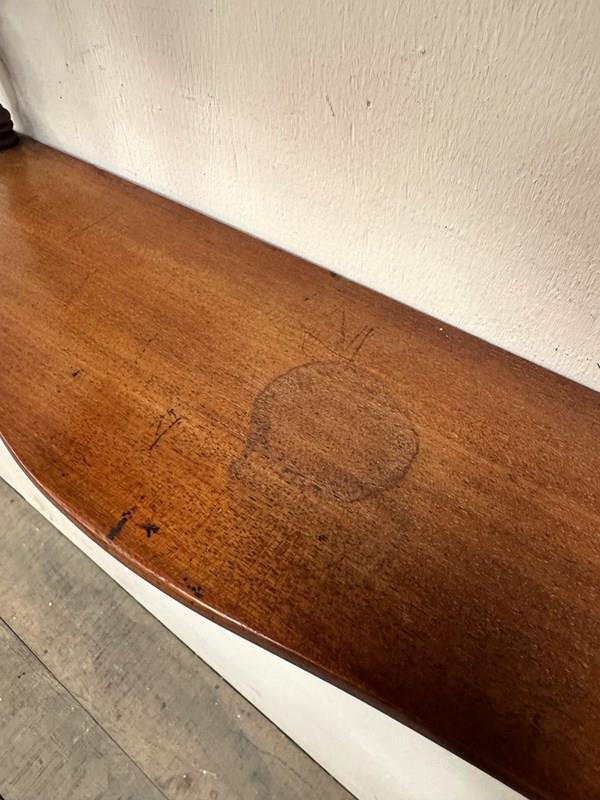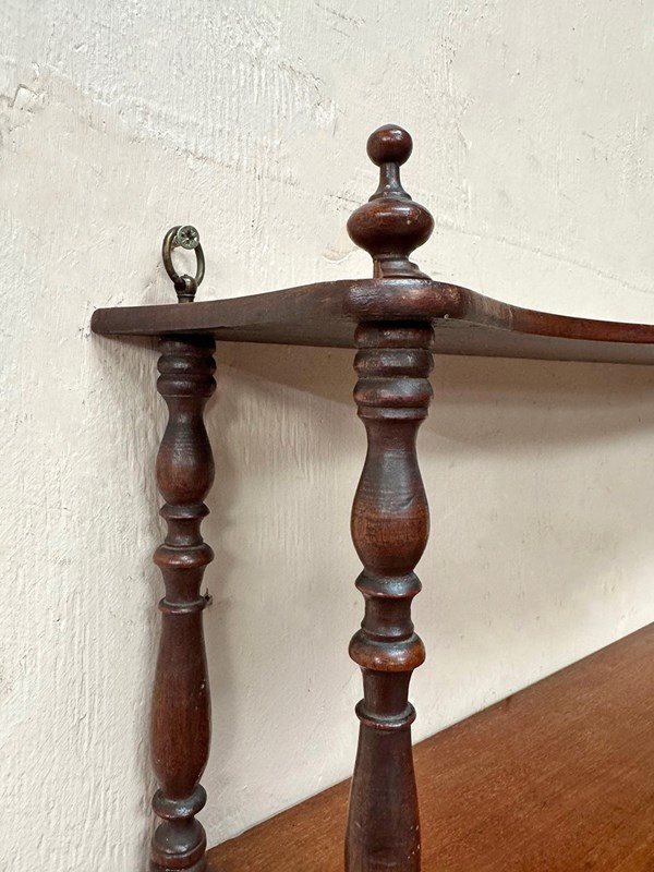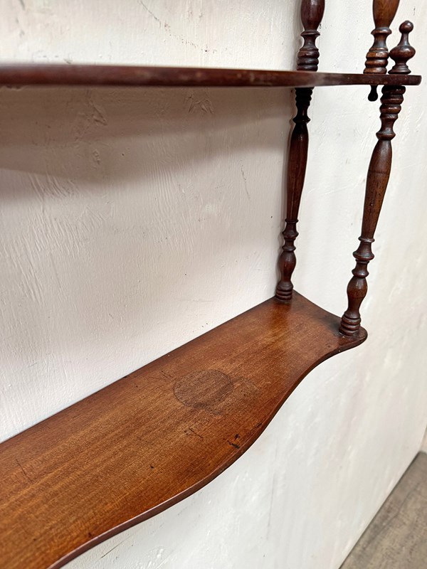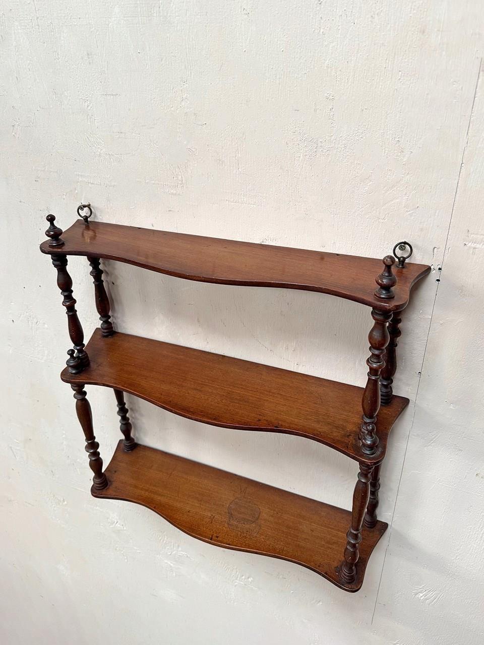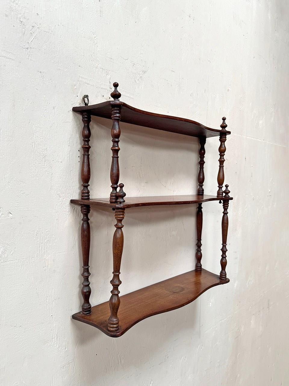 There are 3 shaped shelves and turned uprights. The shelves have been waxed.