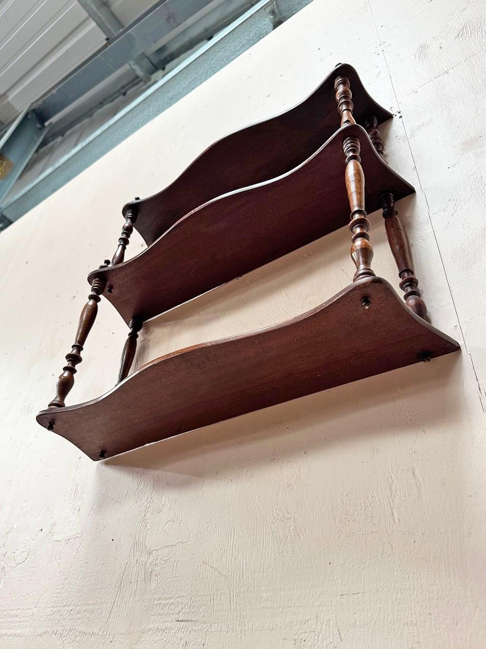 Small set of sturdy spindle shelves which have two brass loops for wall mounting.