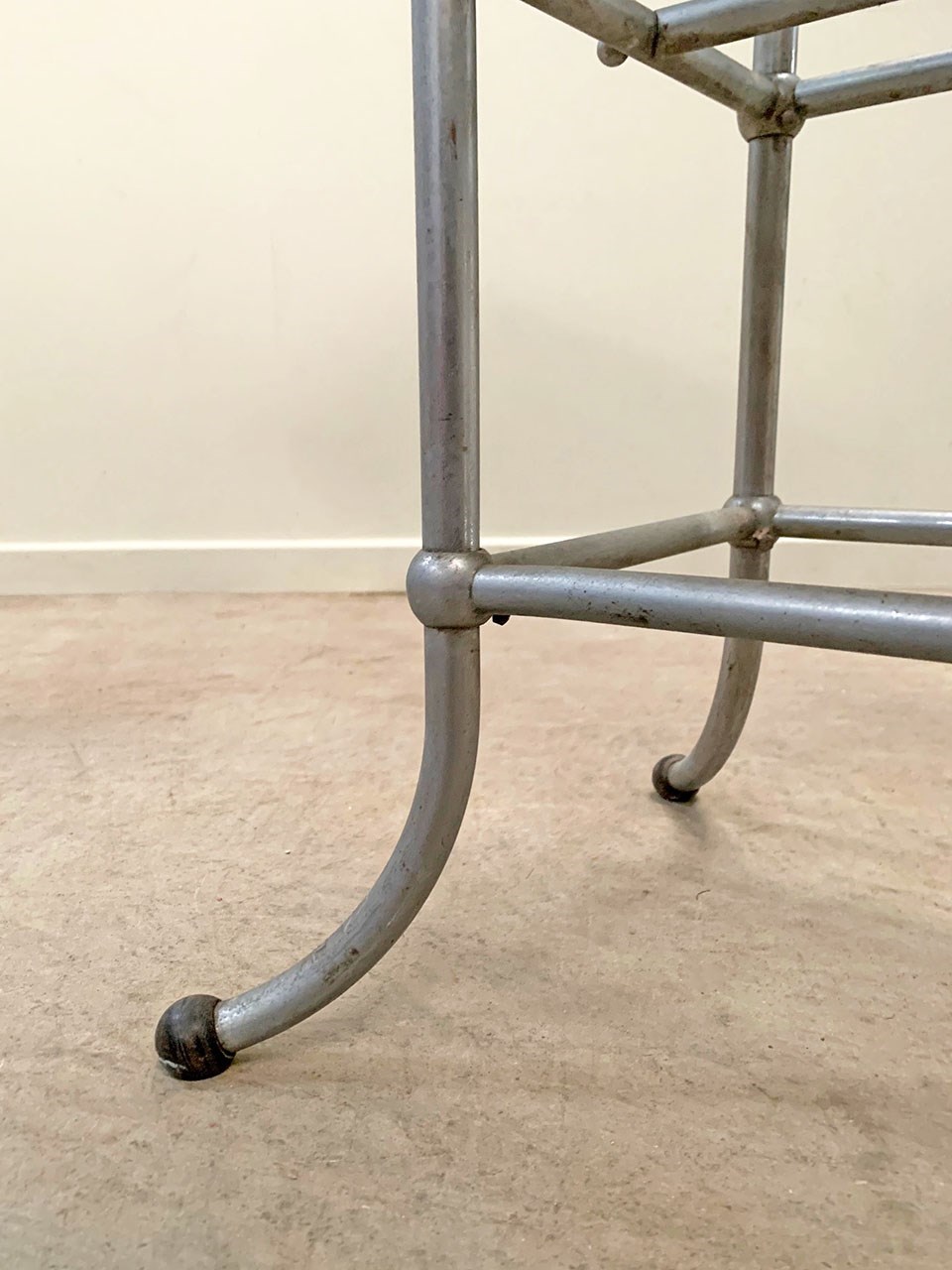 Set on curved sweeping feet, with a chrome base and metal top, showing signs of rust.