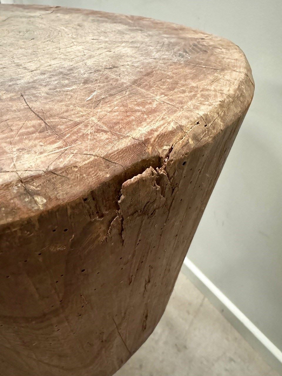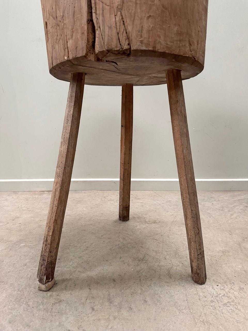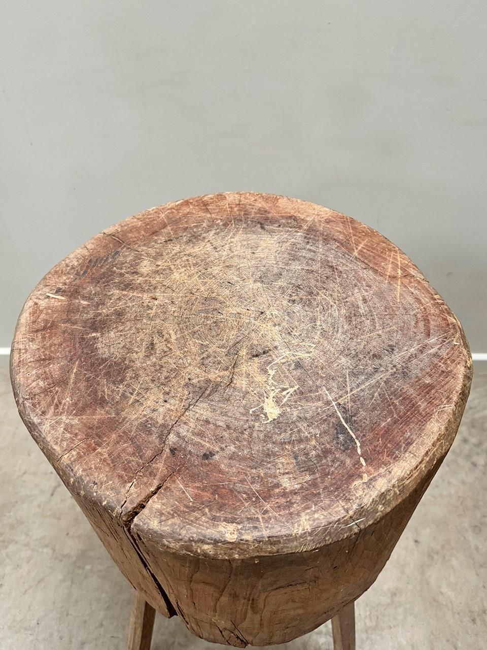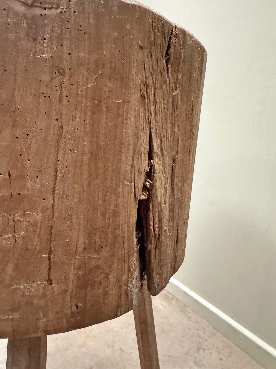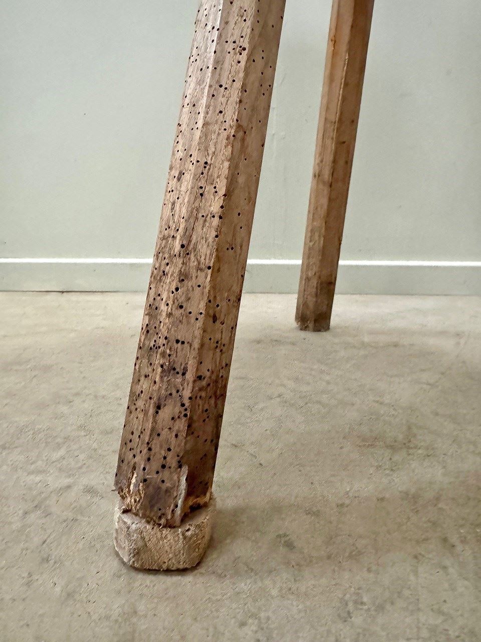 A thick set butcher's block table on almost stick like legs, one has been boosted up with a felt pad.