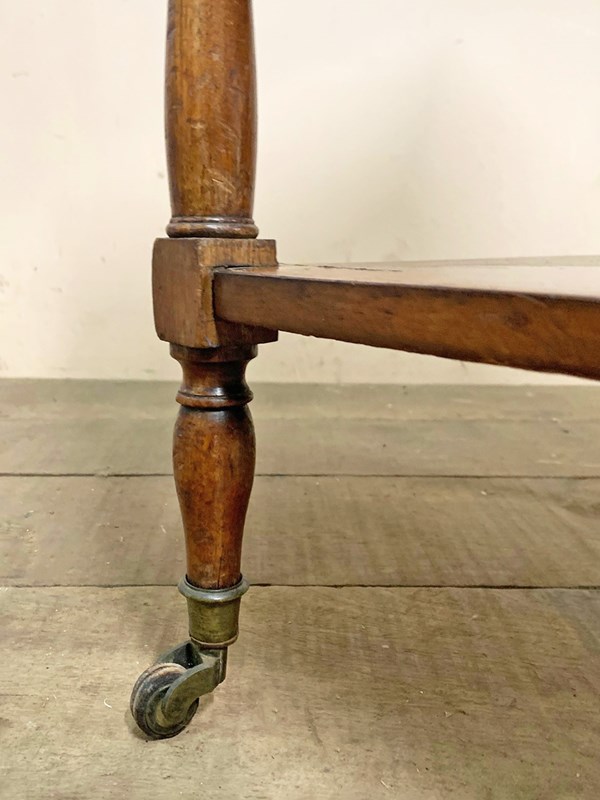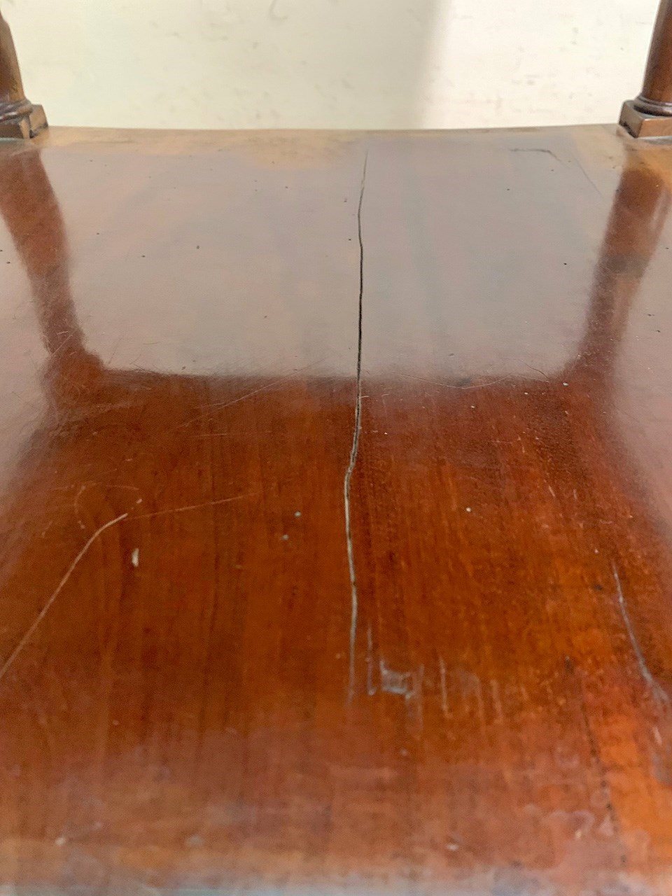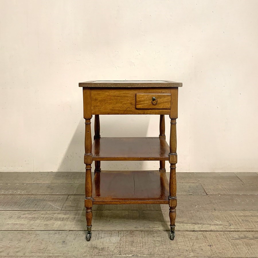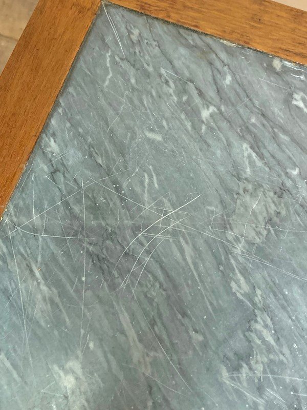 In used condition; the marble top has light scratches and the shelves have some splits.