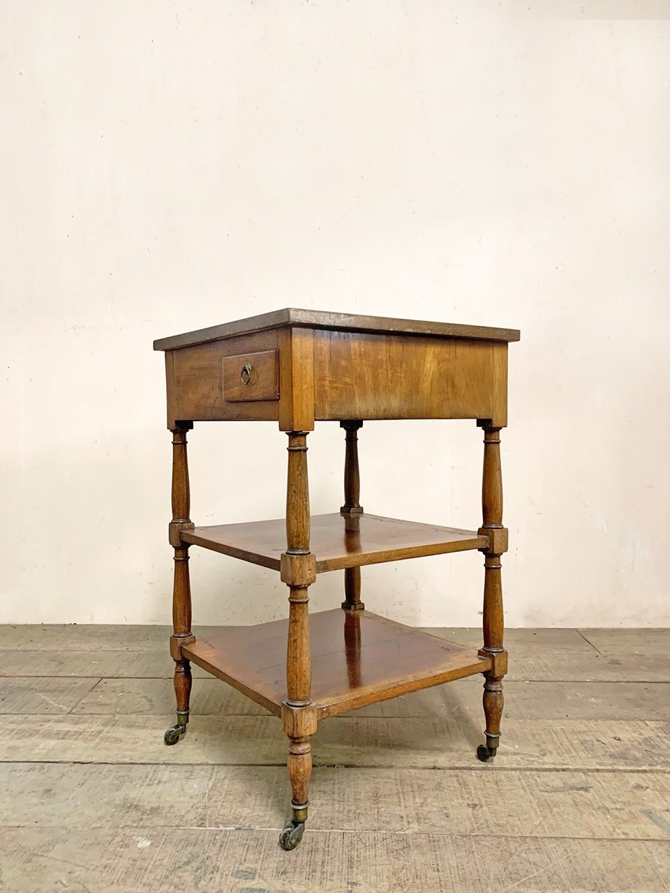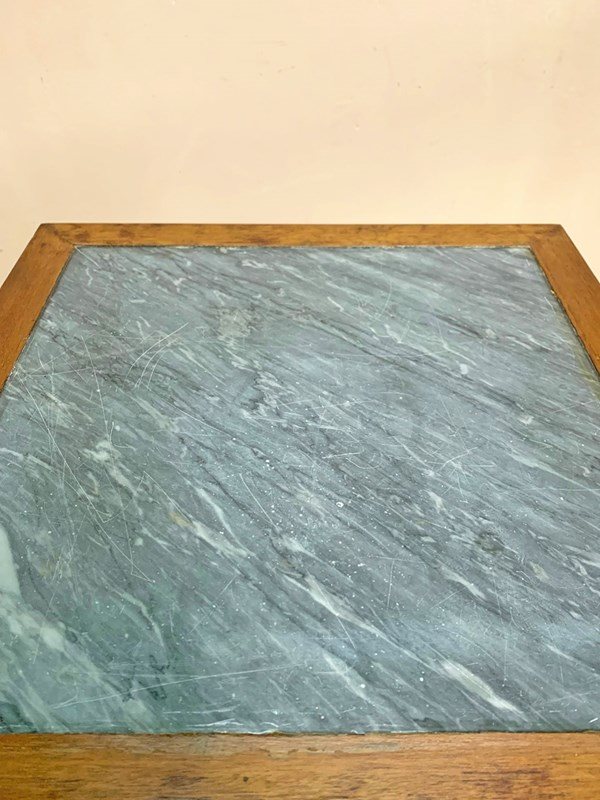 Grey marble top wine table in walnut, with a small single drawer for storing bottle openers and corks.