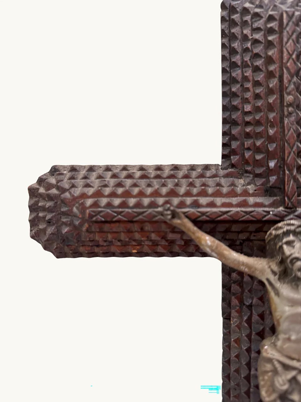 A very rare tramp art crucifix, which is believed to have been made by prisoners.