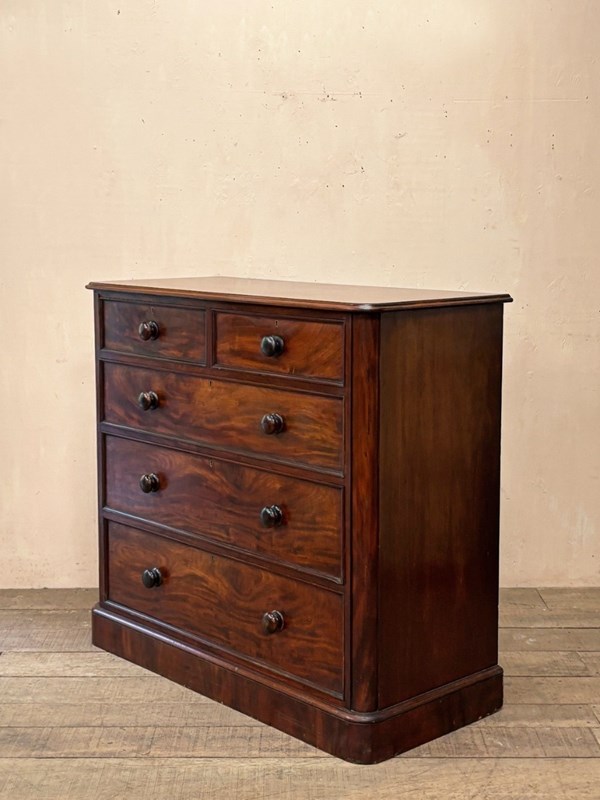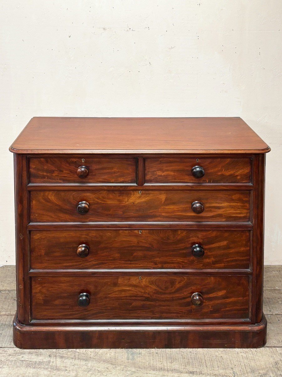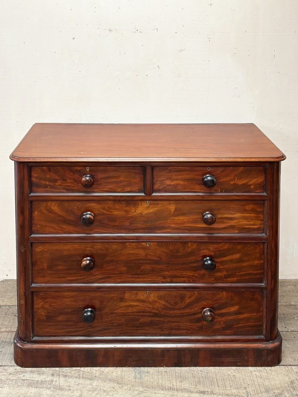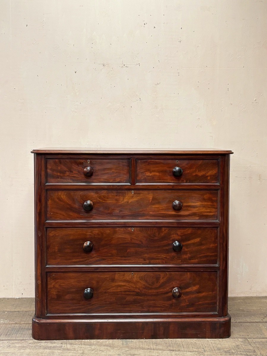 Very good quality solid mahogany 5 drawer chest on plinth base.