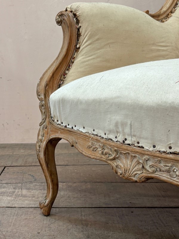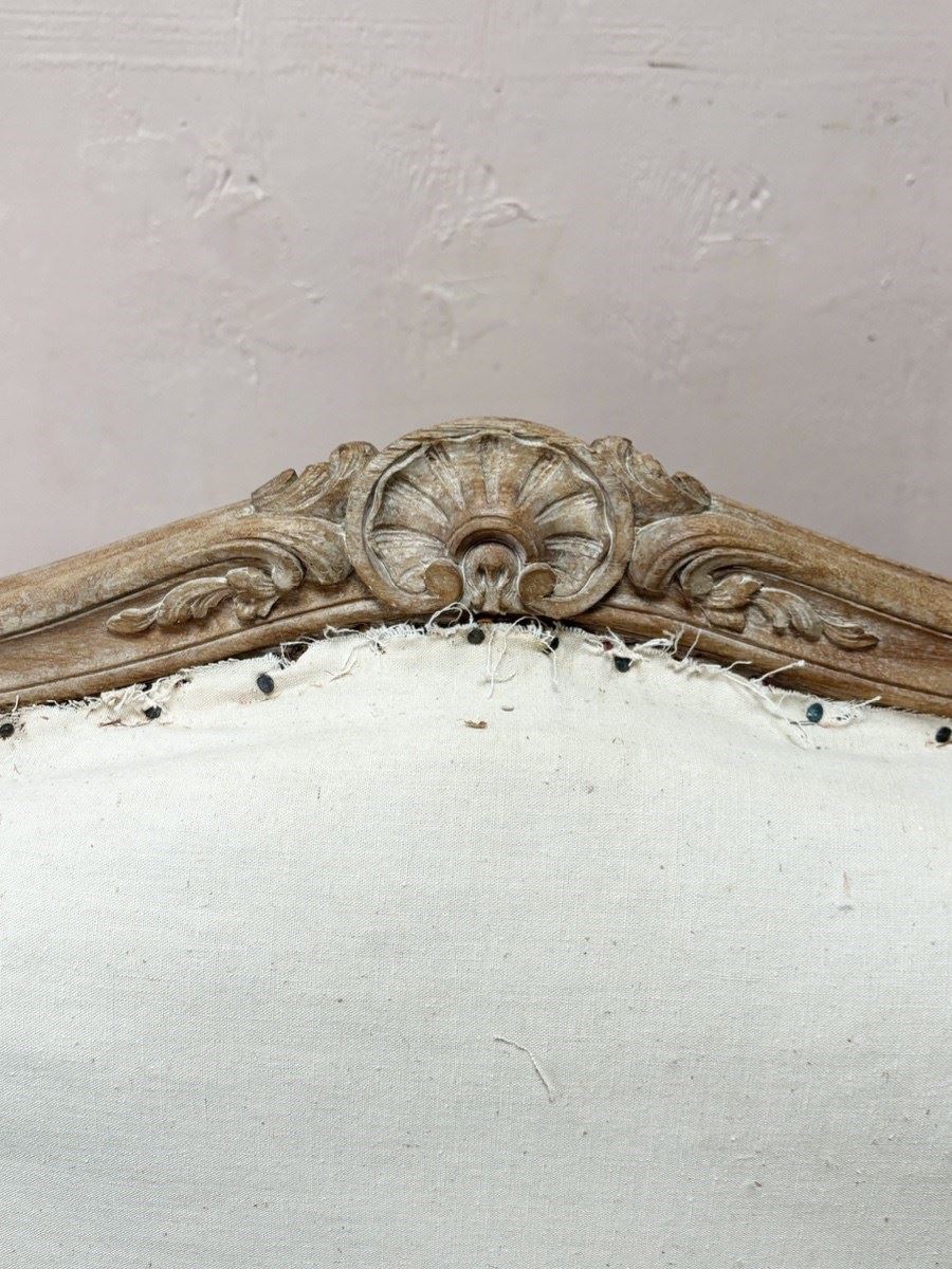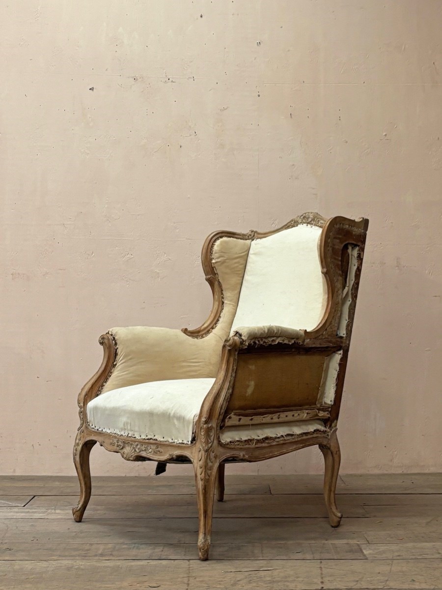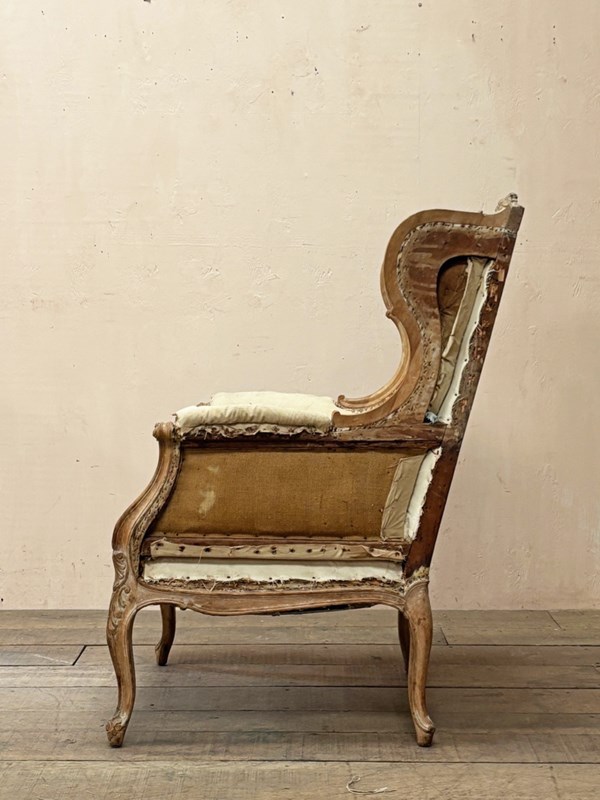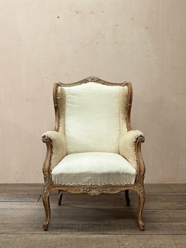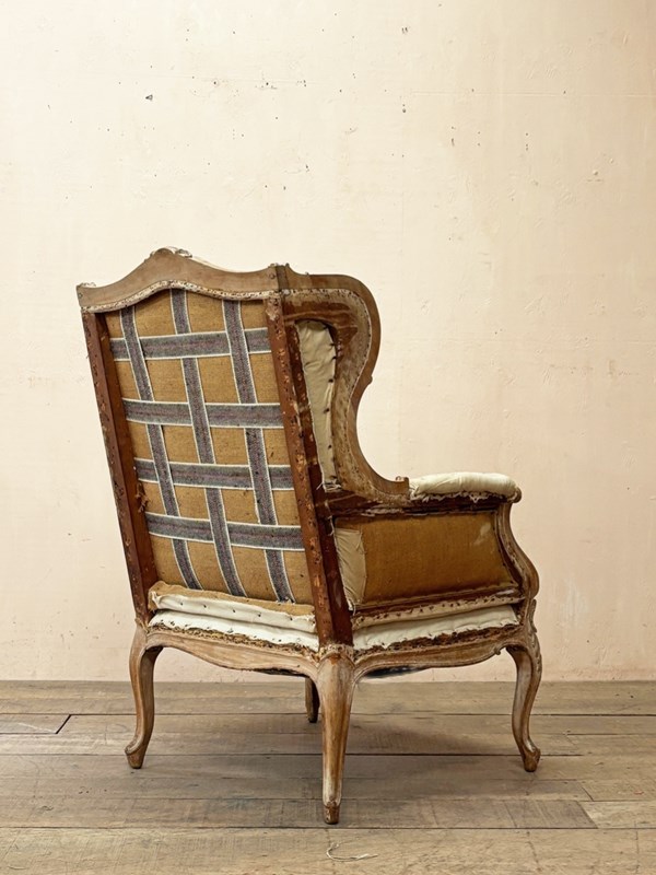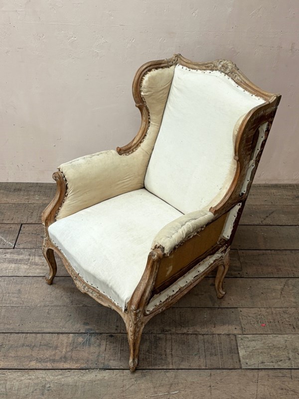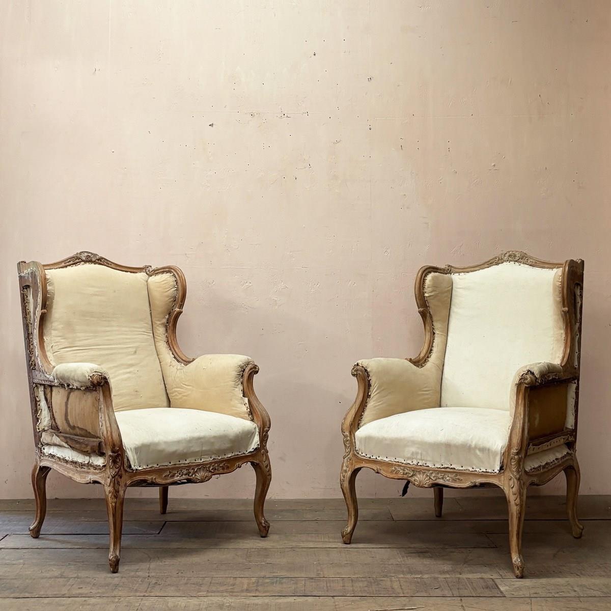 Pair of bleached walnut wing armchairs c.1900, standing on 4 cabriole legs, stripped and ready for top covers.