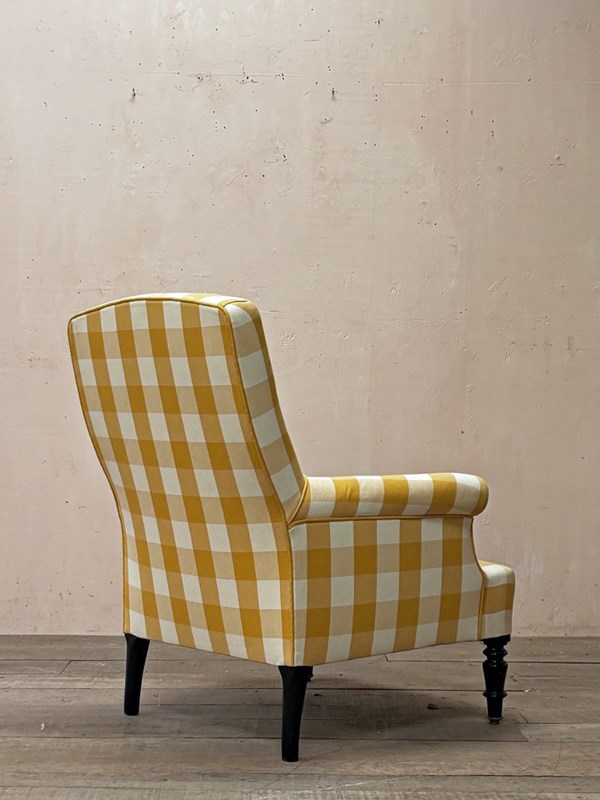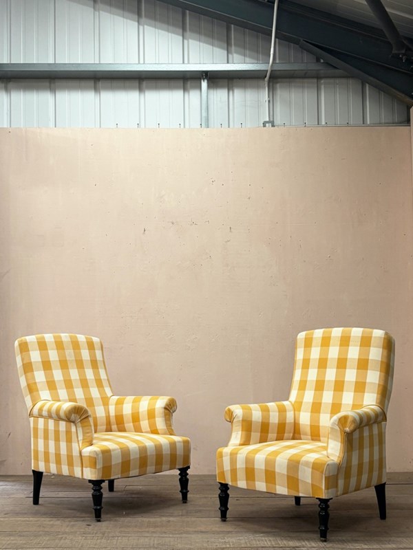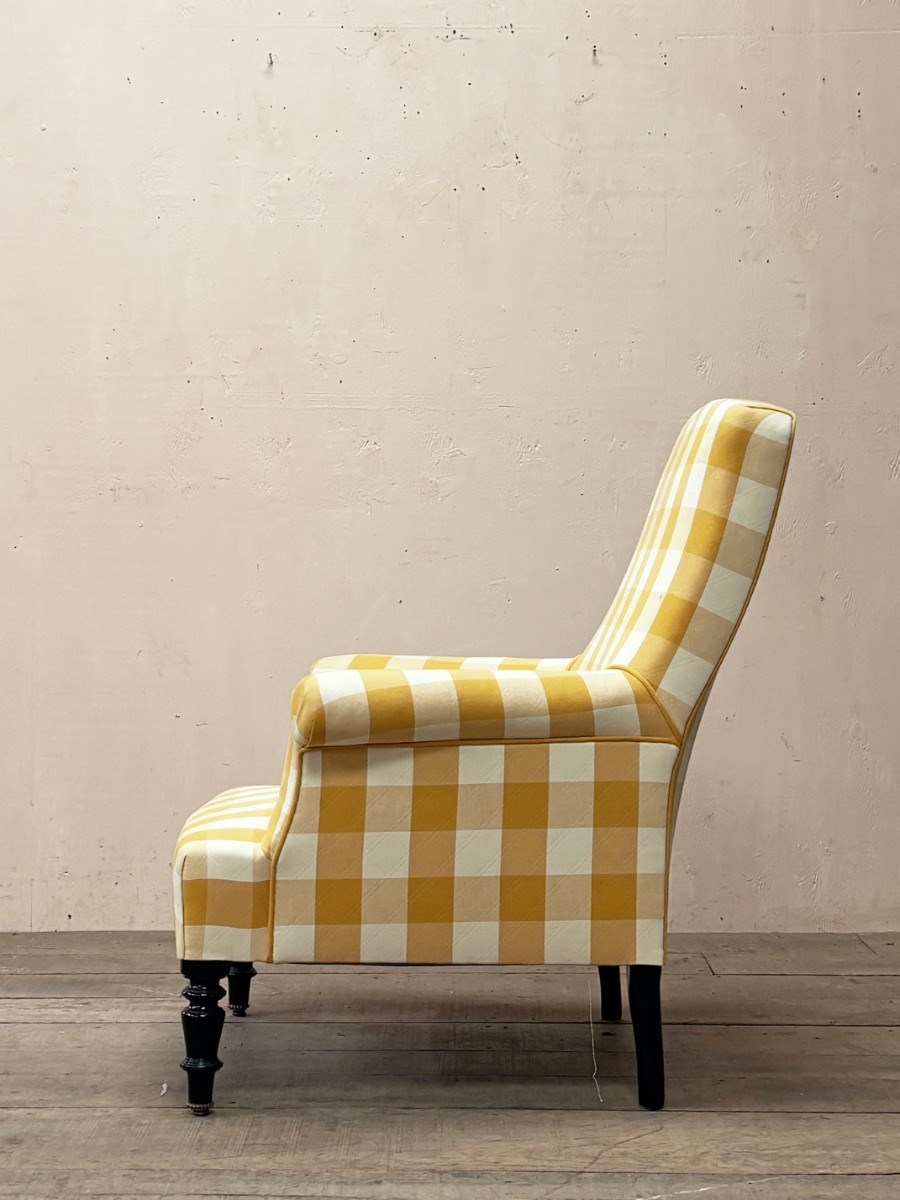 Pair of very clean mid 19th century armchairs on turned ebonised legs, recently upholstered in a cheery yellow checked cotton, which will be steam cleaned if bought as seen.