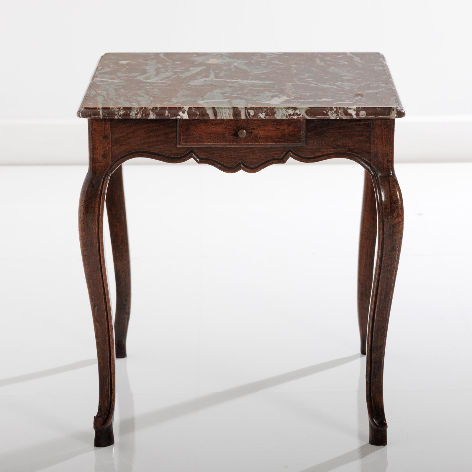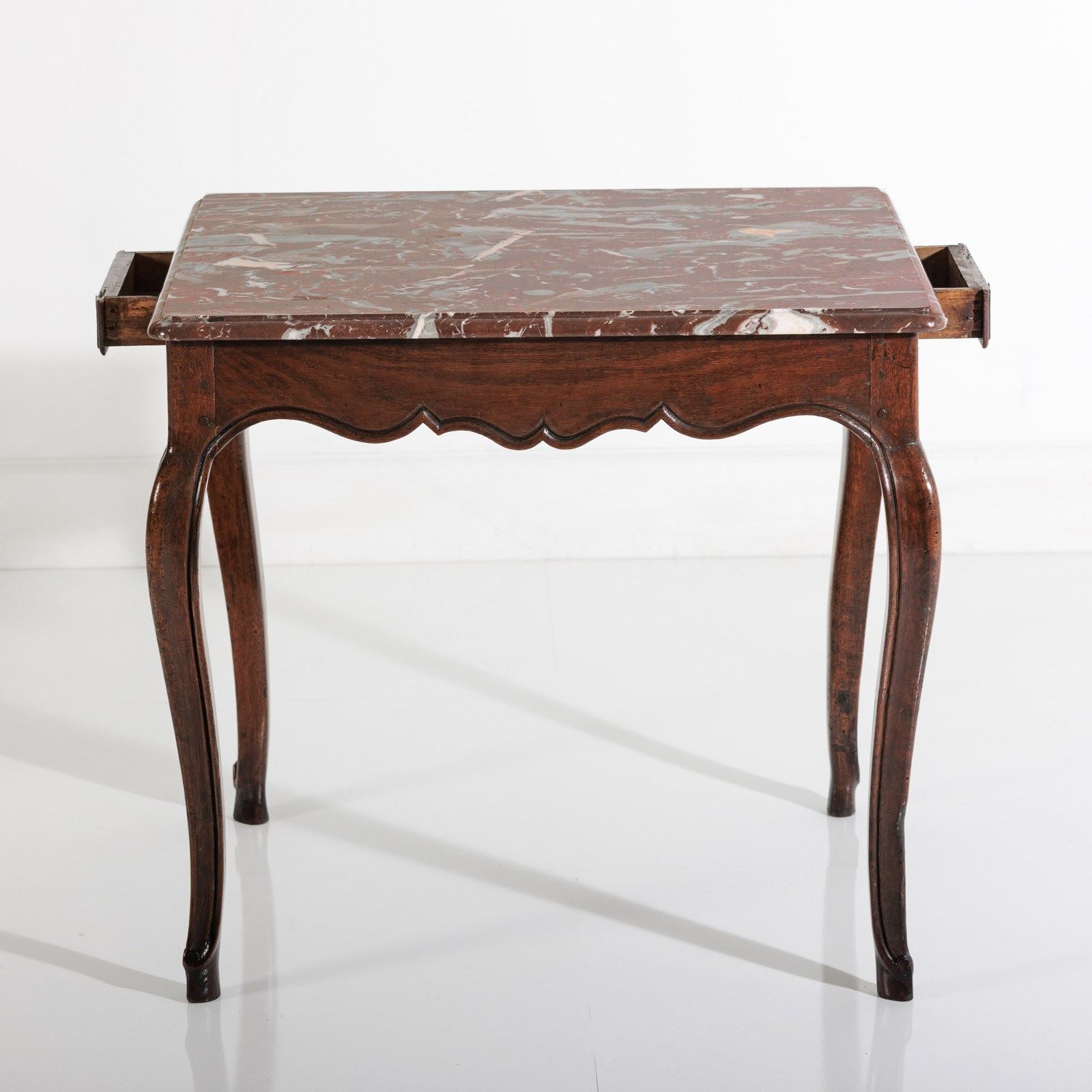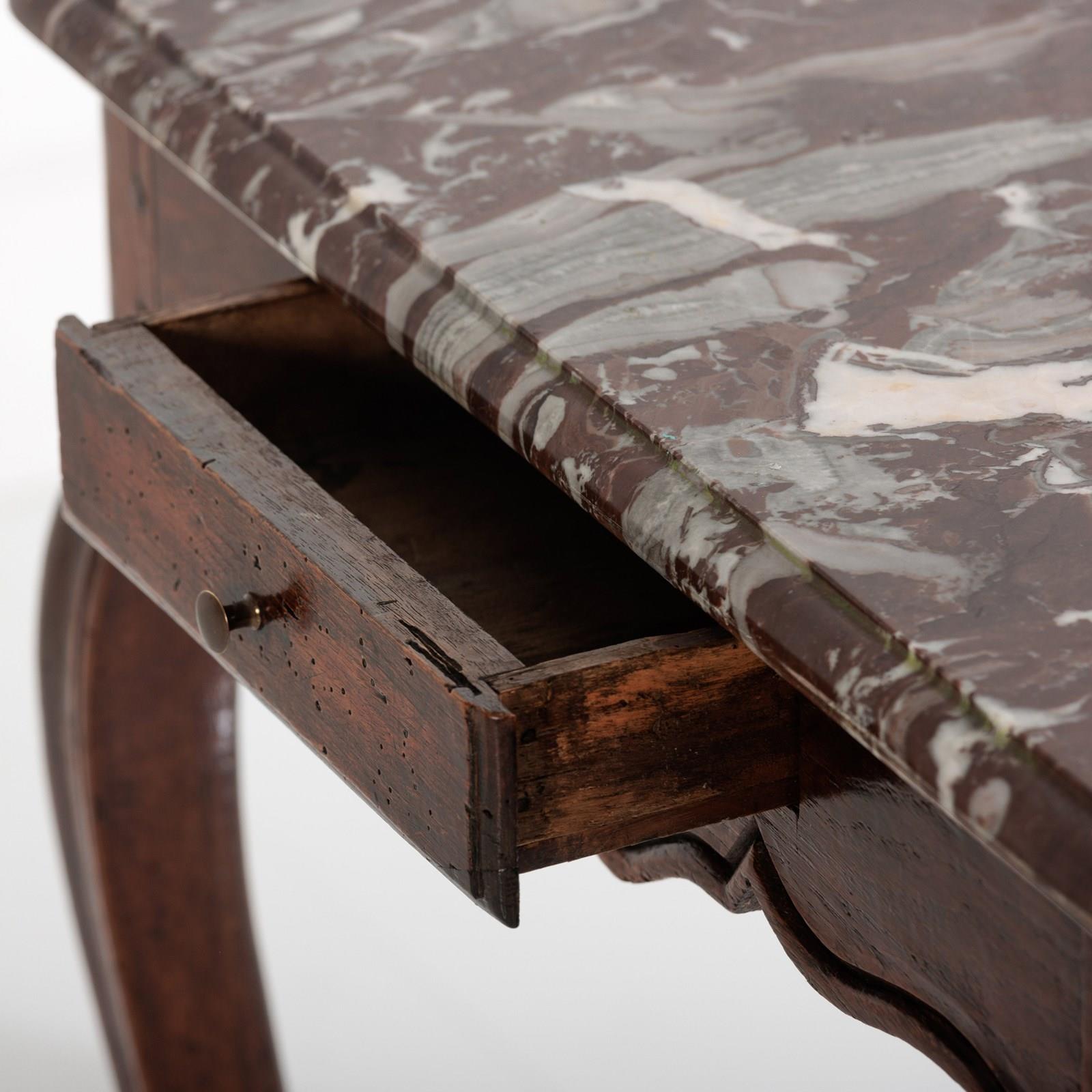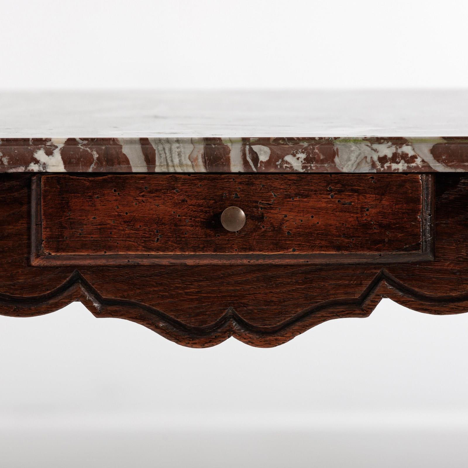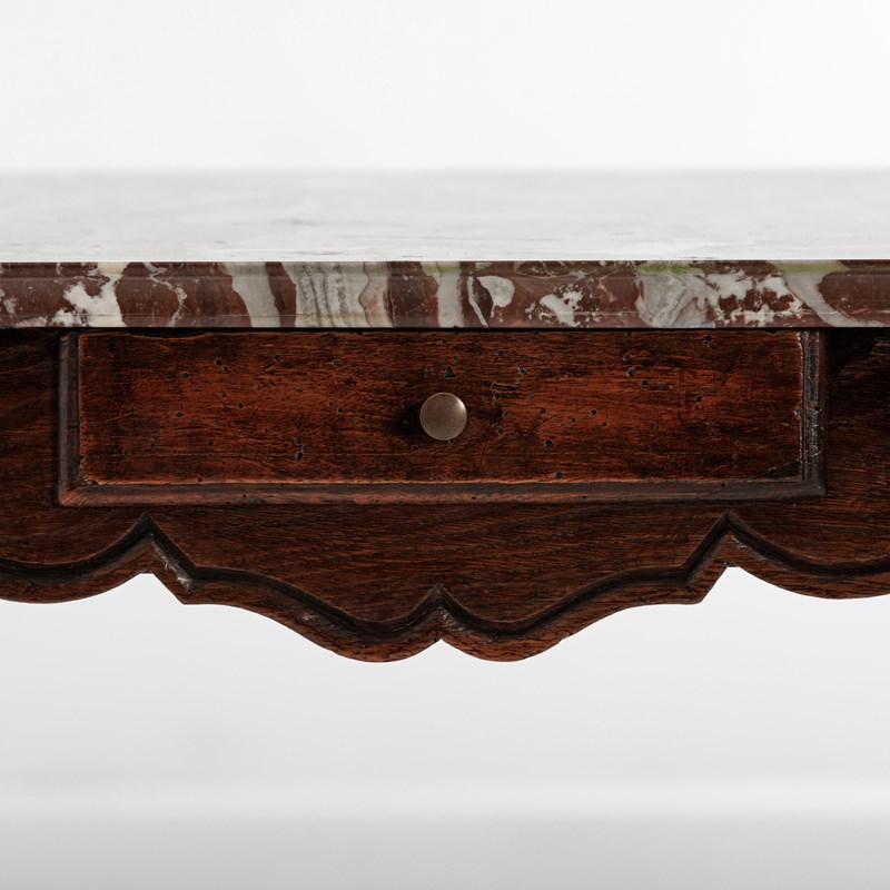 Late 18th Century Centre or console Table. Associated Rosso Levanto Marble top (Late 20th Century) with Dupont edge finish. Small Drawer to each narrow end. Wear commensurate with age. excellent patina. France Circa 1780. Later Marble.