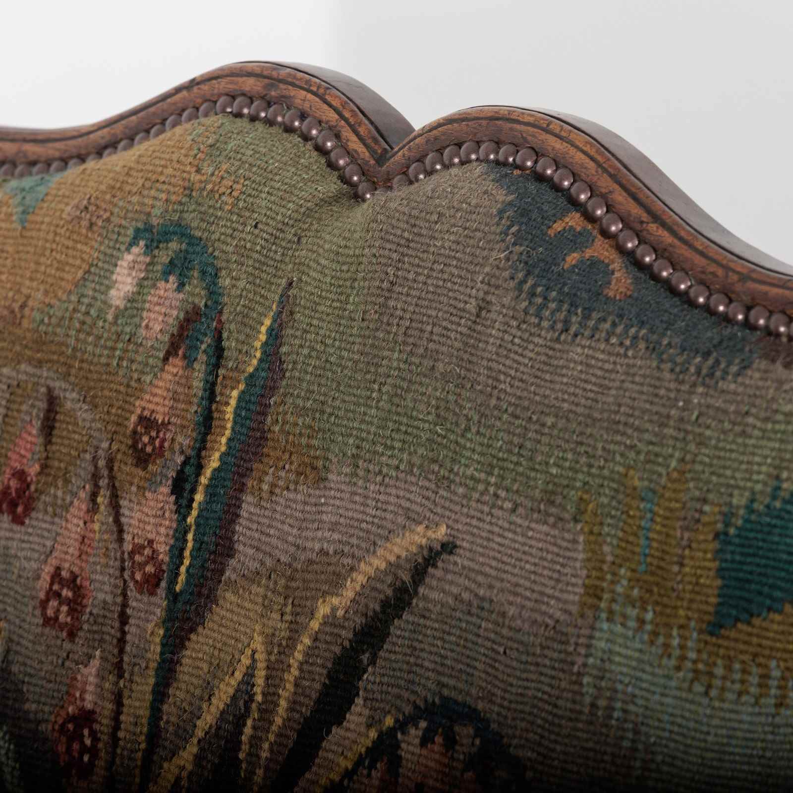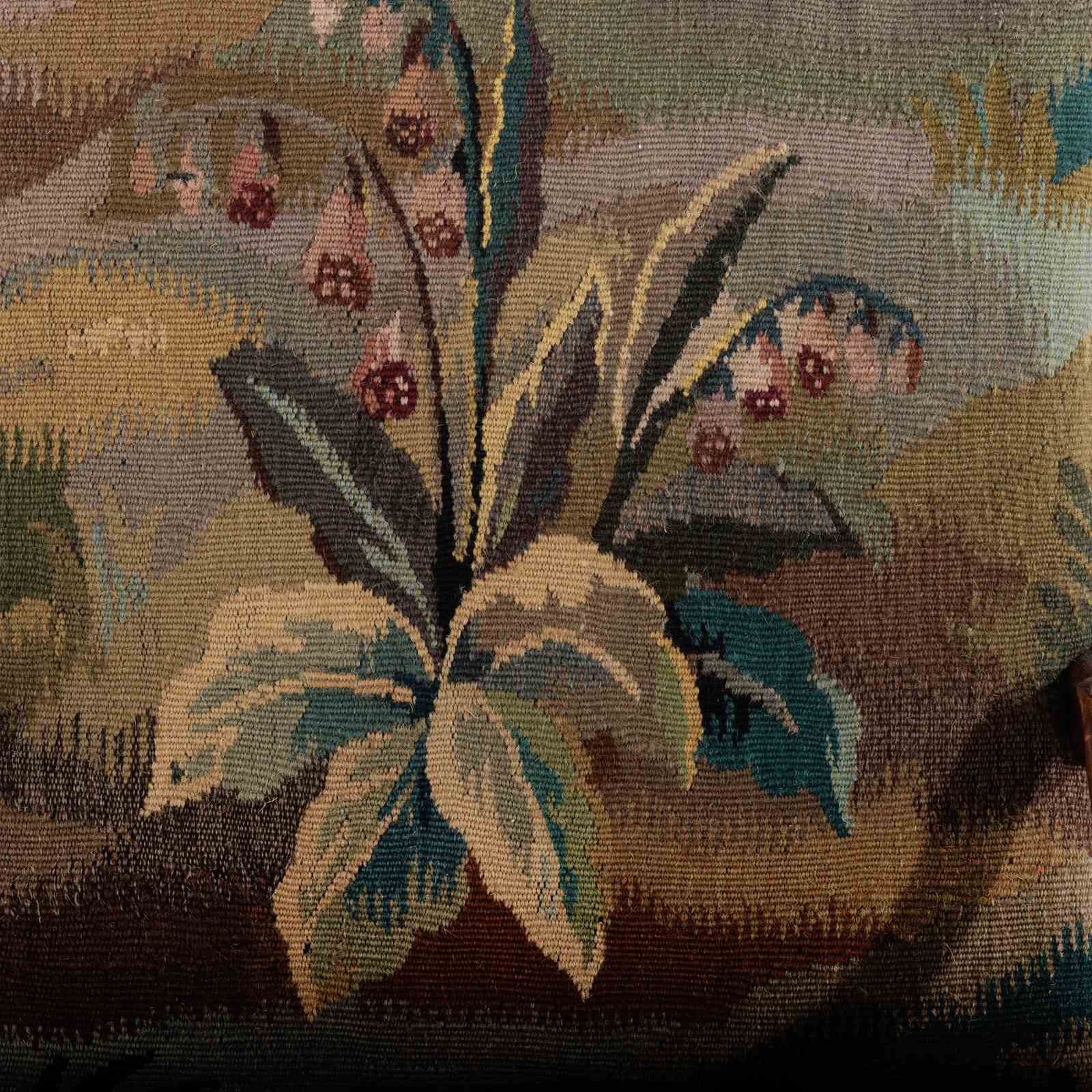 18th Century Walnut open armchair. Reupholstered in 19th Century Tapestry featuring Wild Strawberry Plants. Excellent Patination. France, Circa 1780. 47cm seat height.