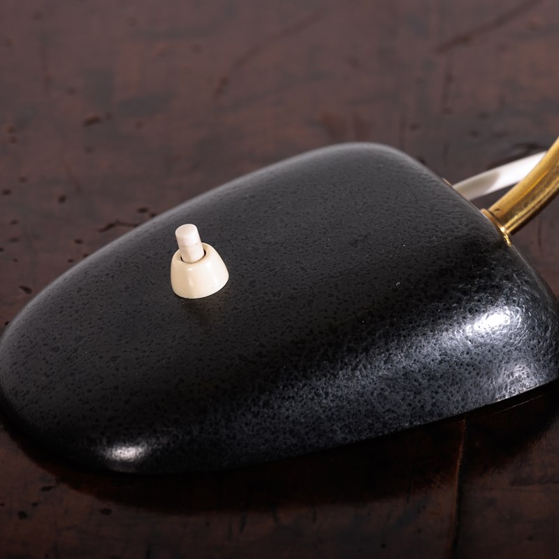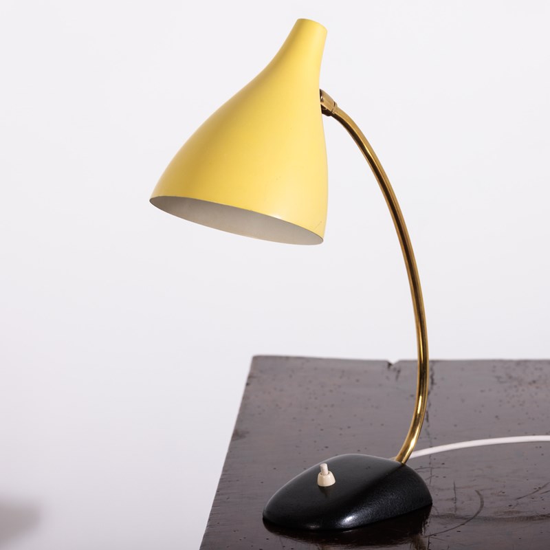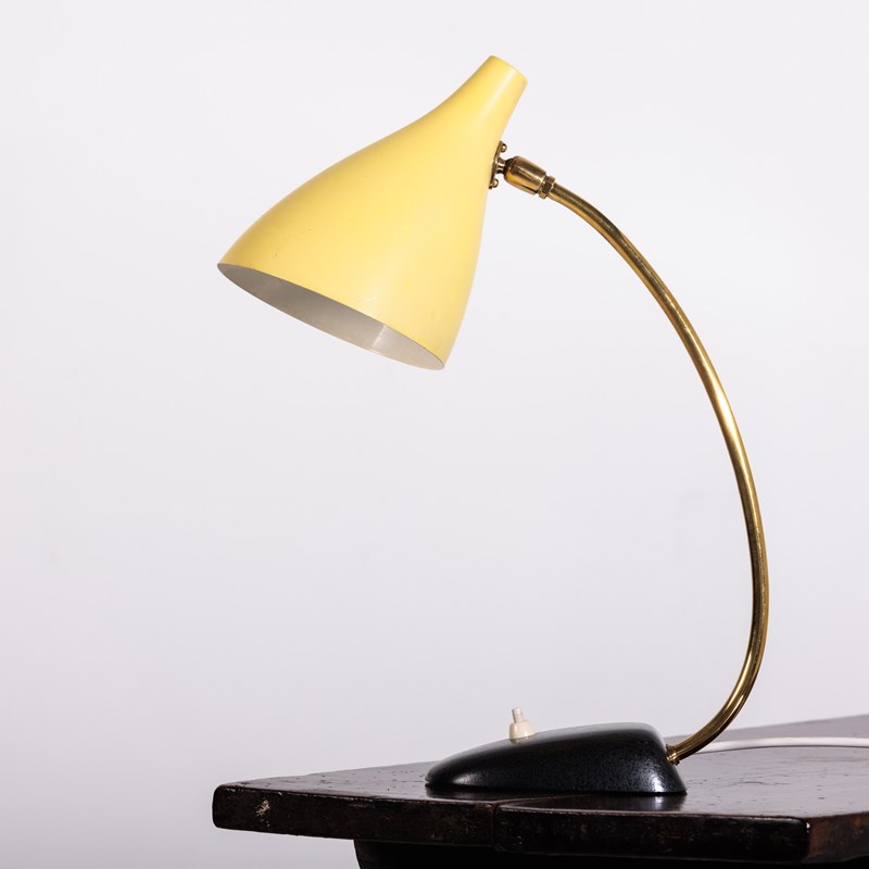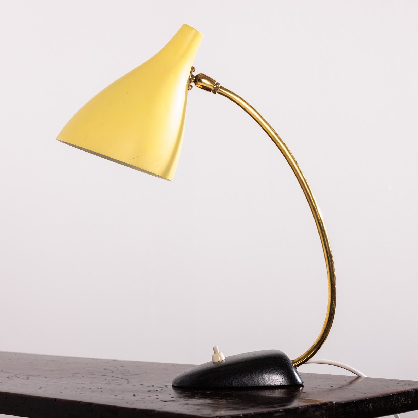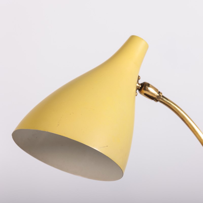 Bauhaus table or desk lamp by Gecos (est 1847). Completely original, excellent pale yellow colourway shade. Sculptural brass arm. Restored and PAT tested Circa 1960. E27 bulb