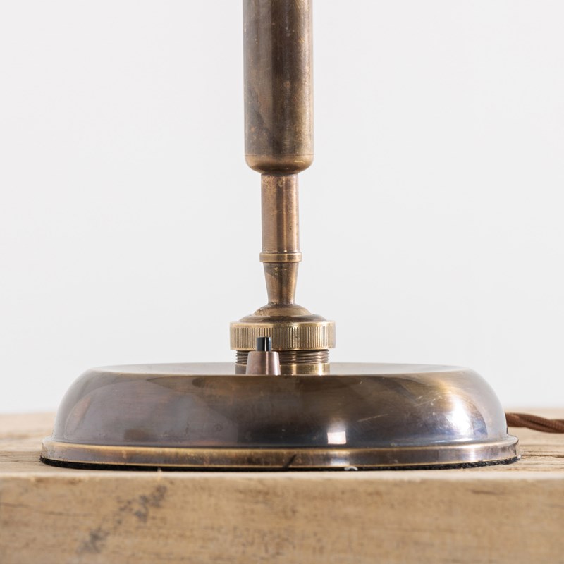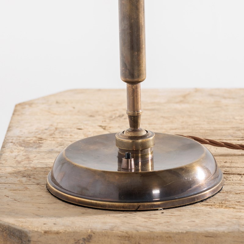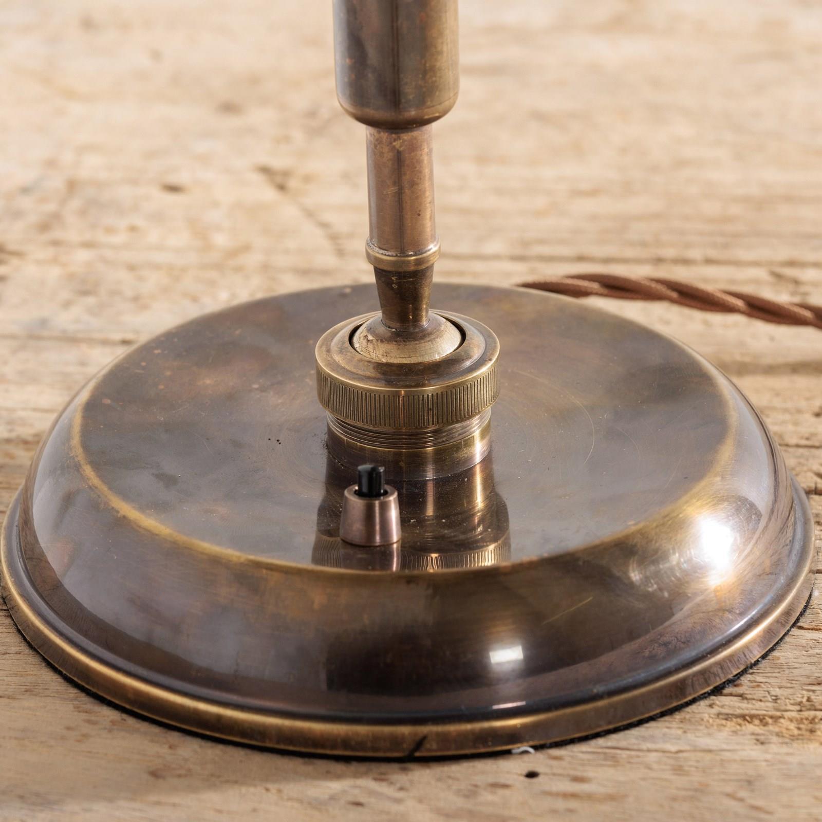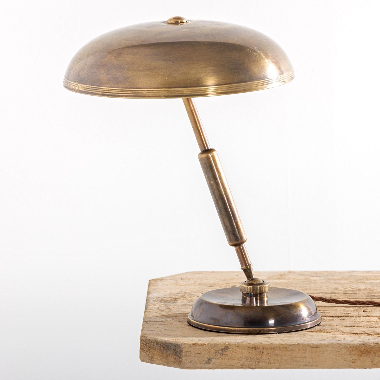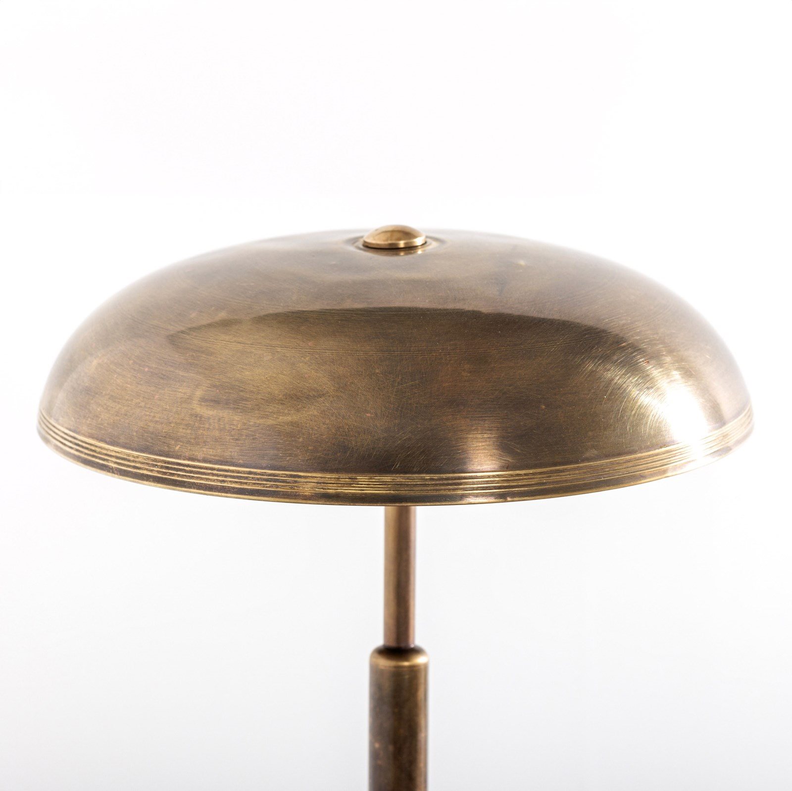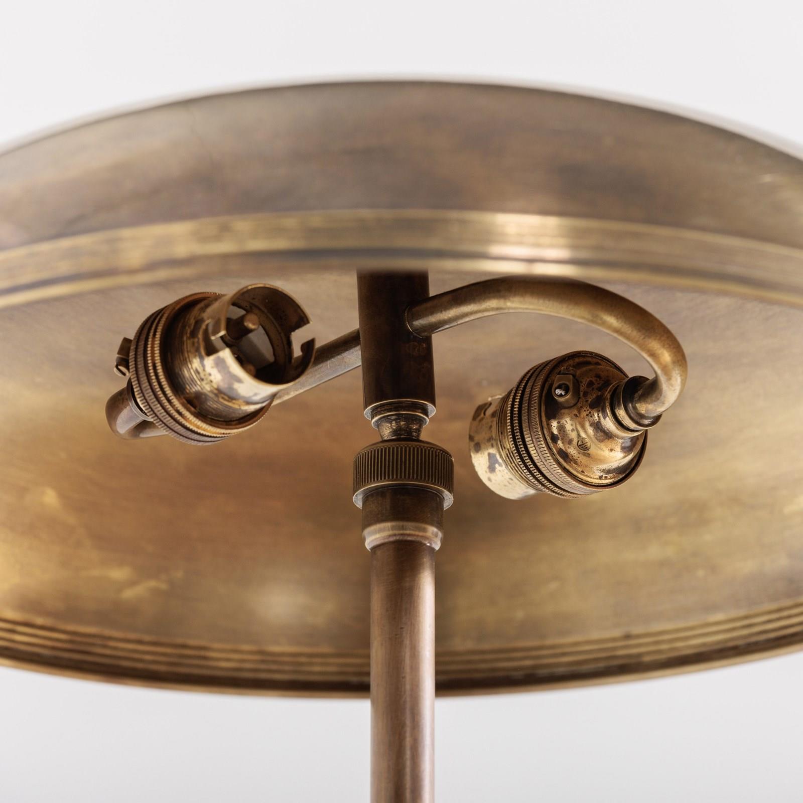 Elegant lamp designed by the architect Giovanni Michelucci and made in 1940 by Lariolux. It is a striking example of the Italian architect's mastery of form and material. The warm aged patina of the brass surface exudes a rich character. Michelucci, known for blending organic shapes with modernist principles. The lamp has clearly been made with both function and artistry in mind and embodies Michelucci's ability to transform everyday items into enduring works of design. It is 360 degrees adjustable thanks to the ingenious ball joint at its base, with a simple screw mechanism to fix it in place. This example has a double bulb holder under the shade. Rewired with antique style flex and PAT tested. Italy.