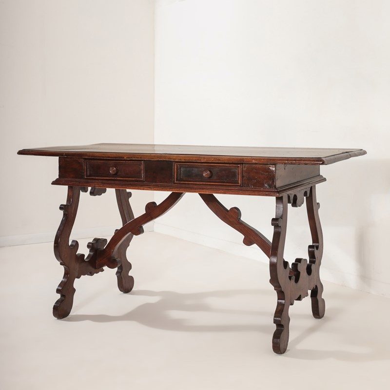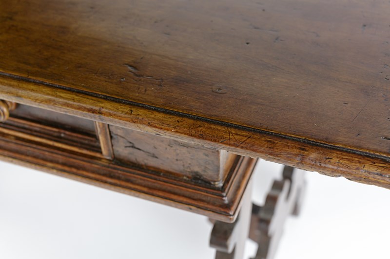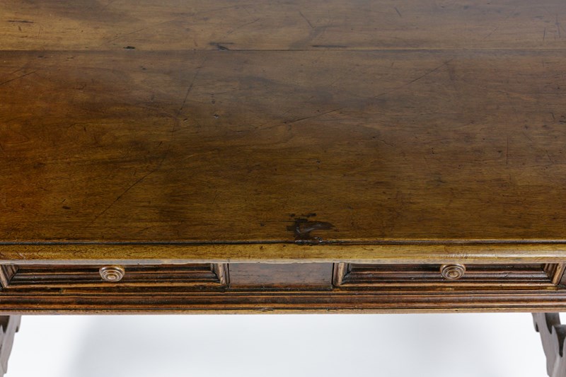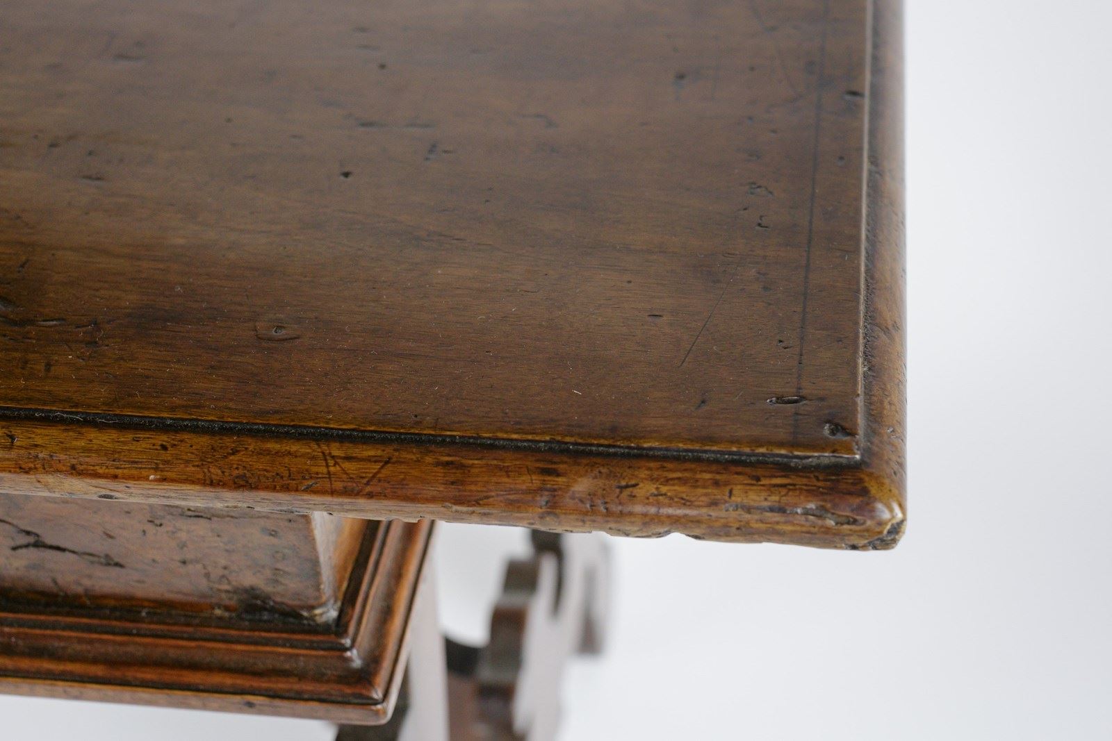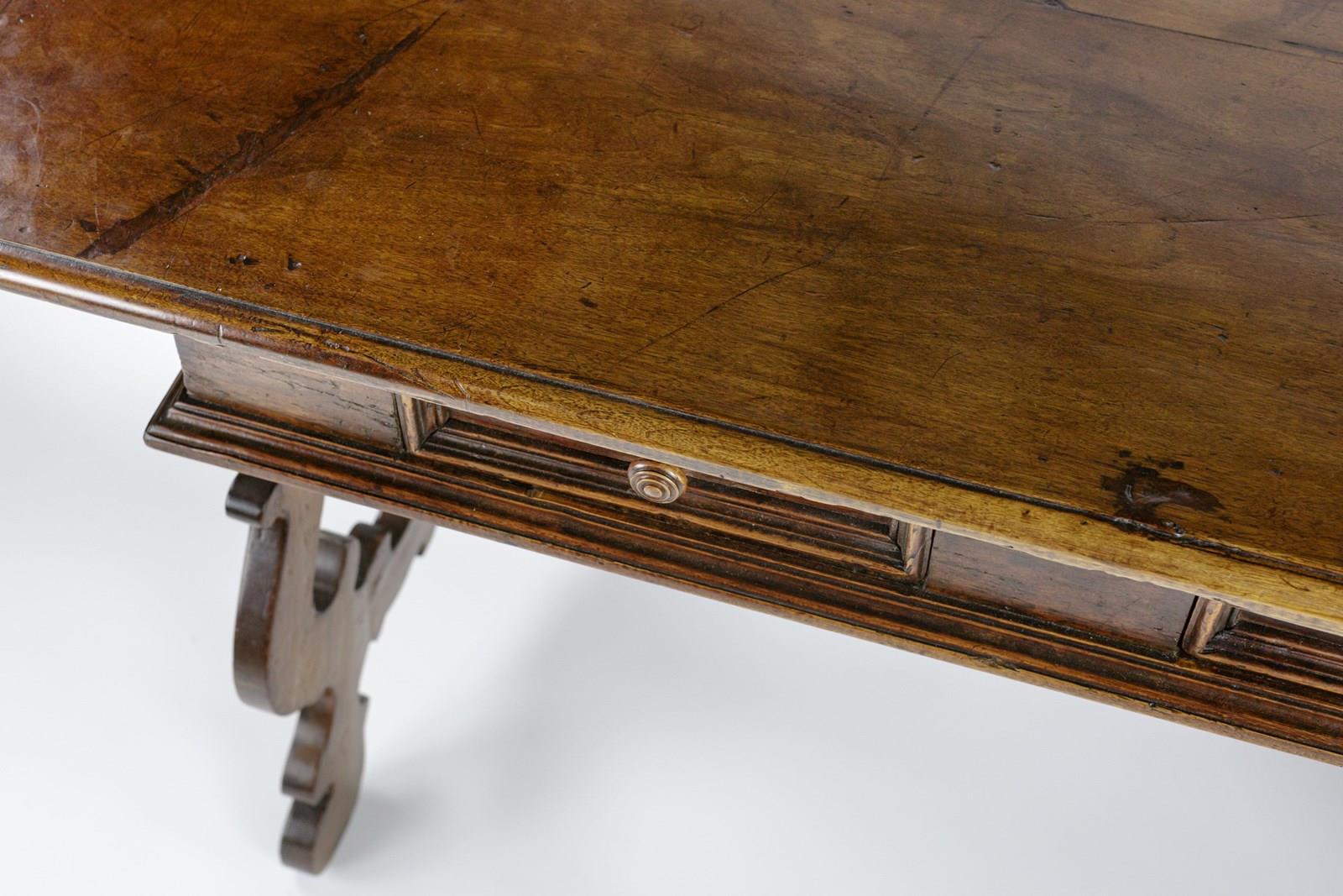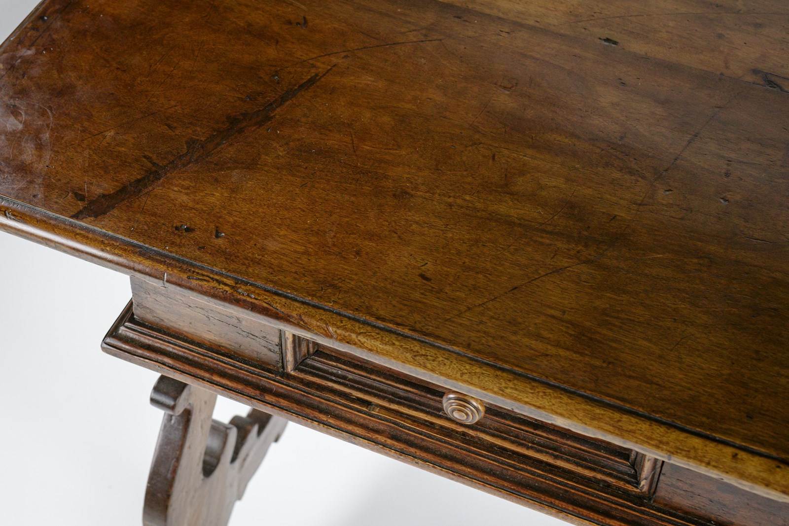 Impressive Italian Walnut Desk or Console This finely constructed desk, dating to the early 19th Century, exemplifies the restrain elegance of Italian craftsmanship of the period. Executed in walnut the moulded rectangular top is supported by a frieze incorporating two useful drawers. The desk rests upon sculpturally carved trestle legs joined by a shapely stretcher, lending structural integrity and visual harmony. The walnut, as expected, has developed a warm patination consistent with its age and use. Two Drawers. Excellent patina. Walnut. Italy Circa 1820.