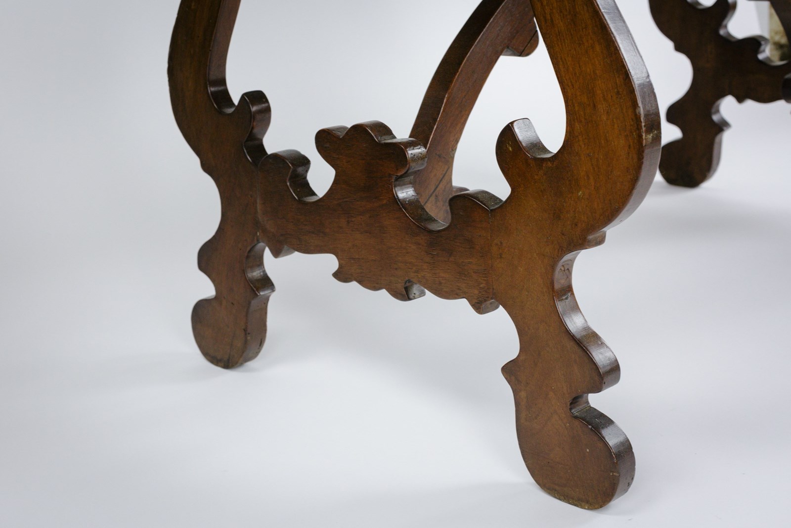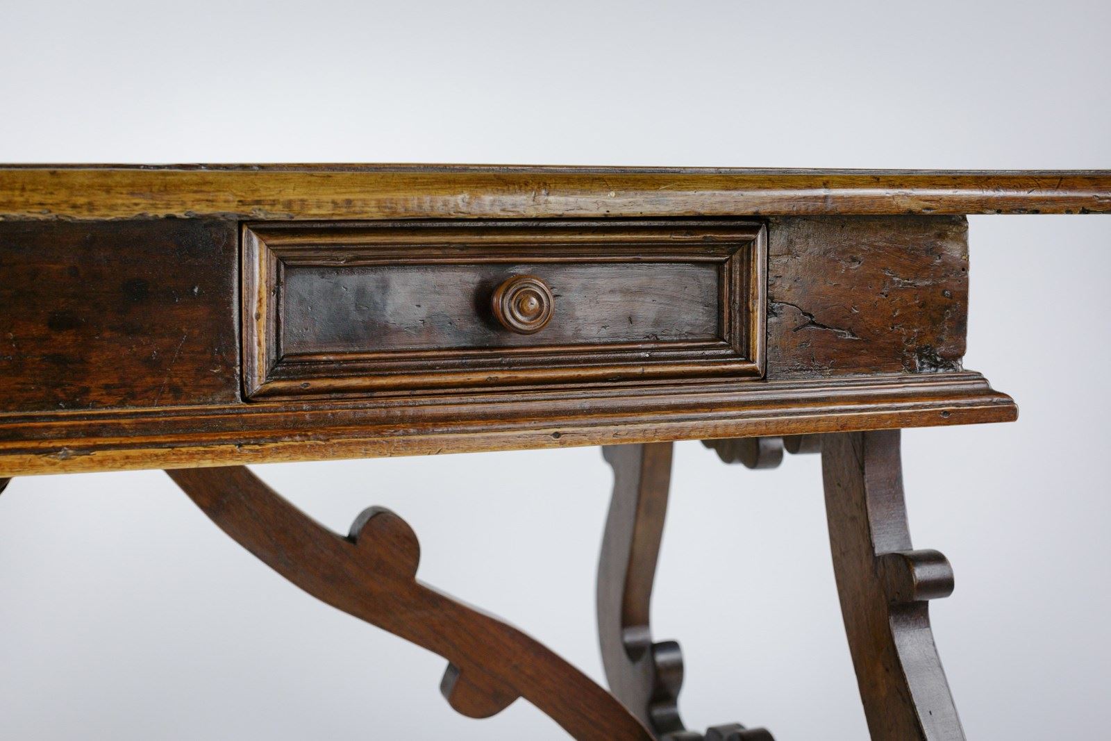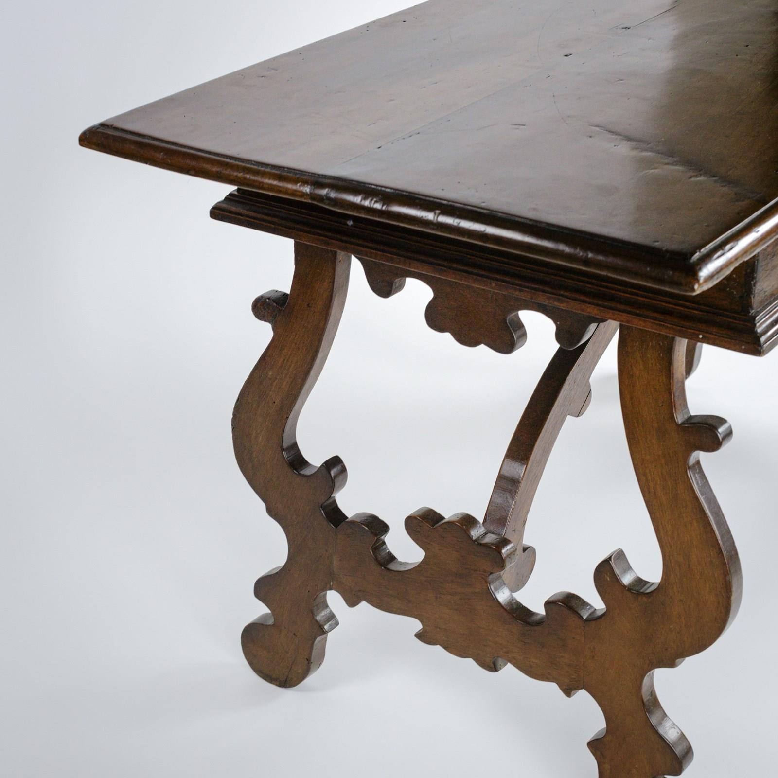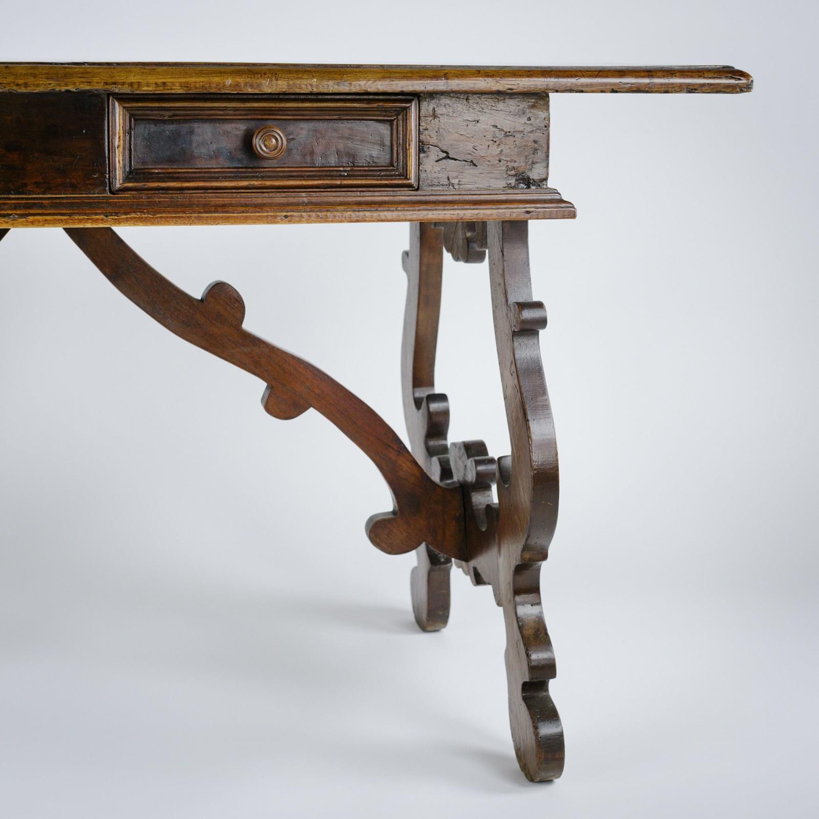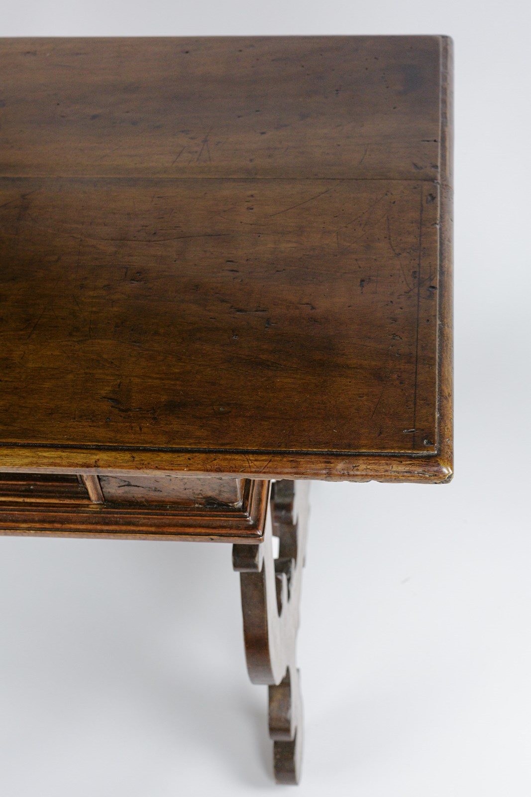 Impressive Italian Walnut Desk or Console This finely constructed desk, dating to the early 19th Century, exemplifies the restrain elegance of Italian craftsmanship of the period. Executed in walnut the moulded rectangular top is supported by a frieze incorporating two useful drawers. The desk rests upon sculpturally carved trestle legs joined by a shapely stretcher, lending structural integrity and visual harmony. The walnut, as expected, has developed a warm patination consistent with its age and use. Two Drawers. Excellent patina. Walnut. Italy Circa 1820.