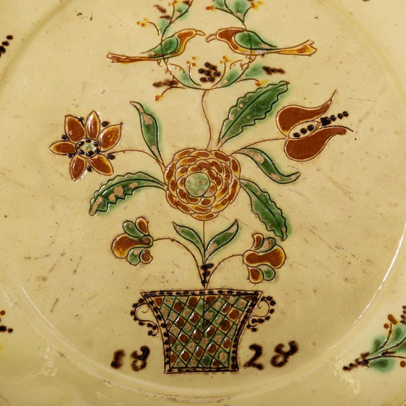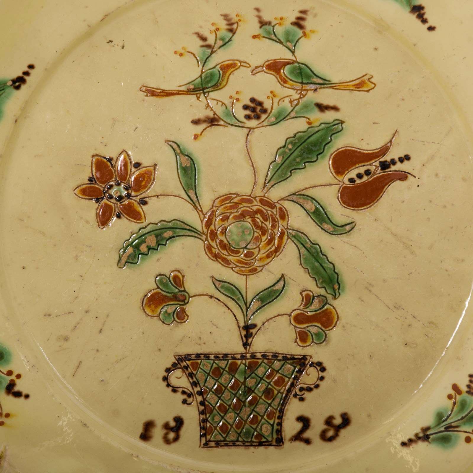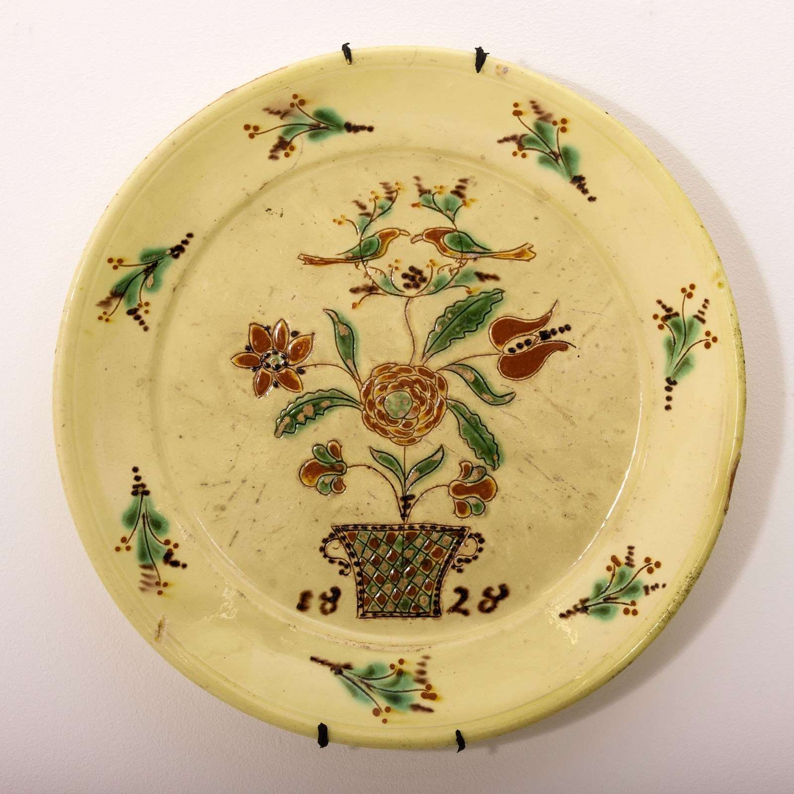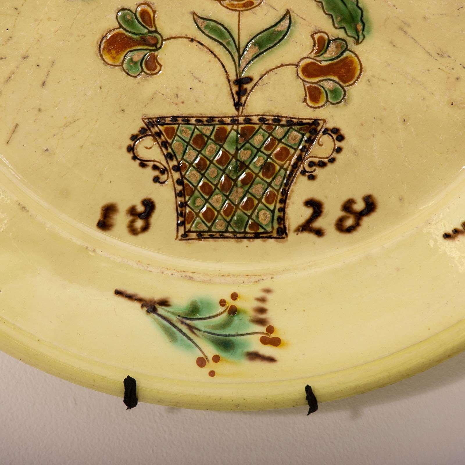 Early 19th-Century French Slipware Sgraffito Marriage Plate, Dated 1828 A charming and highly symbolic early 19th-century French slipware sgraffito marriage plate, decorated on a traditional yellow ground and dated 1828. Attributed to France, probably Sorrus. The plate depicts a joyous celebratory scene bordered with incised floral sprays or boutonnieres. At its center is a twin-handled urn filled with flowers, including a rose and a tulip-powerful symbols in floriography. The rose represents love, passion, and devotion, while the tulip signifies perfect or unconditional love and deep commitment. Above, nestled in the branches, are a pair of tourtereaux or lovebirds, emblematic of lifelong partnership, fidelity, and tenderness, inspired by their well-known bonding behaviors of pairing, preening, and affection. Rich in romantic symbolism and folk artistry, this plate is a beautiful and evocative example of early 19th-century French marriage ceramics and would make a compelling addition to any collection of folk art, slipware, or historic matrimonial objects.