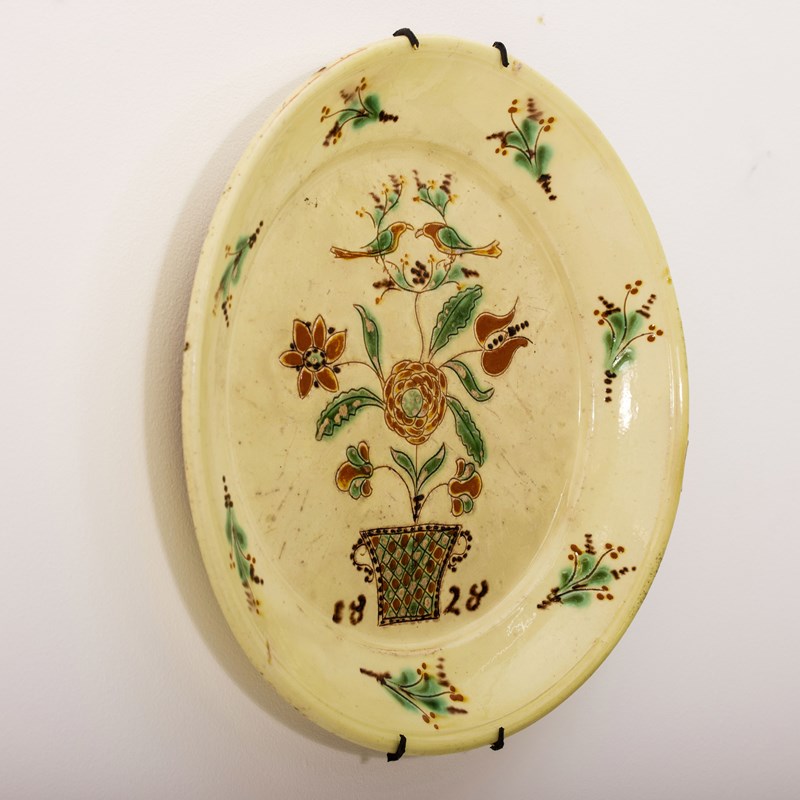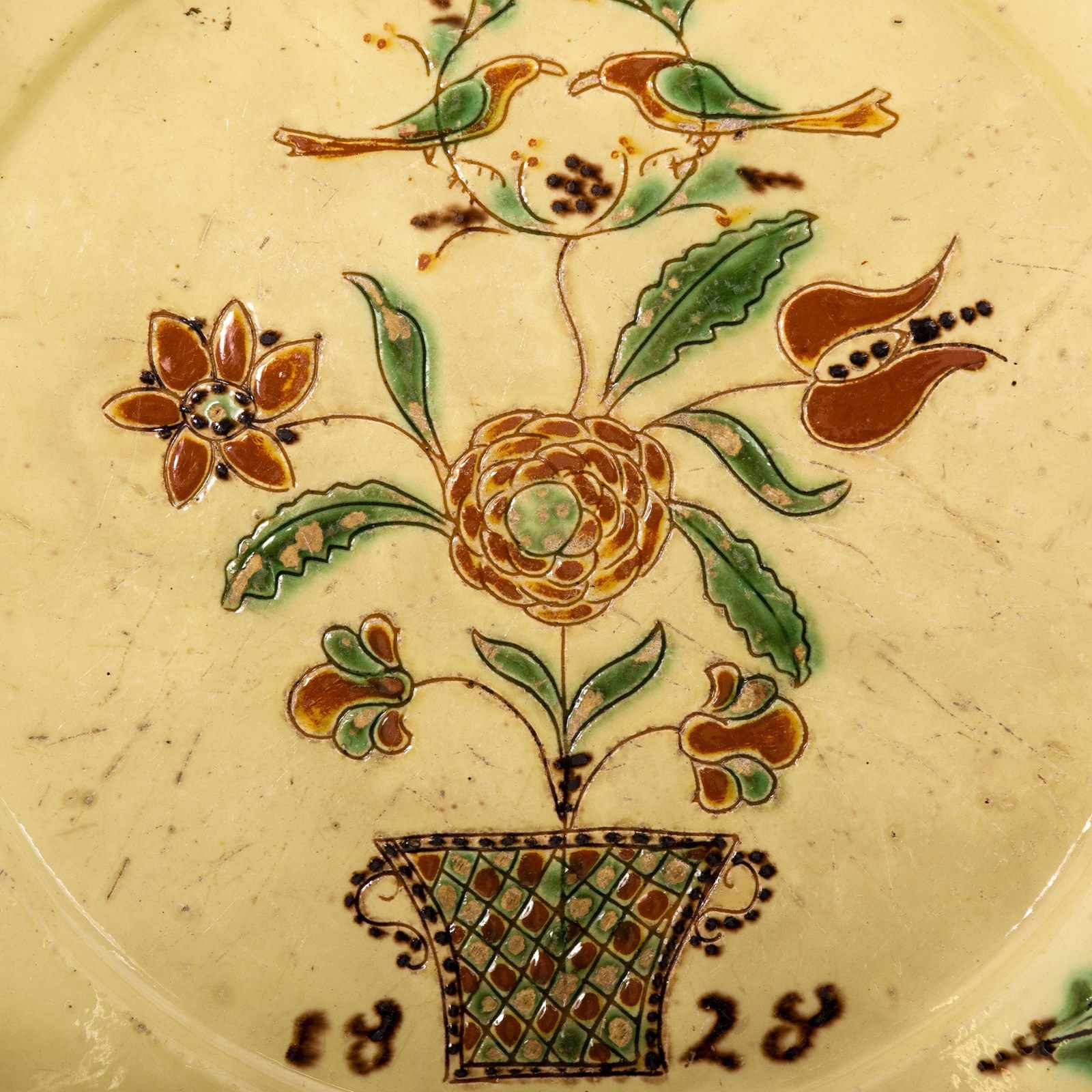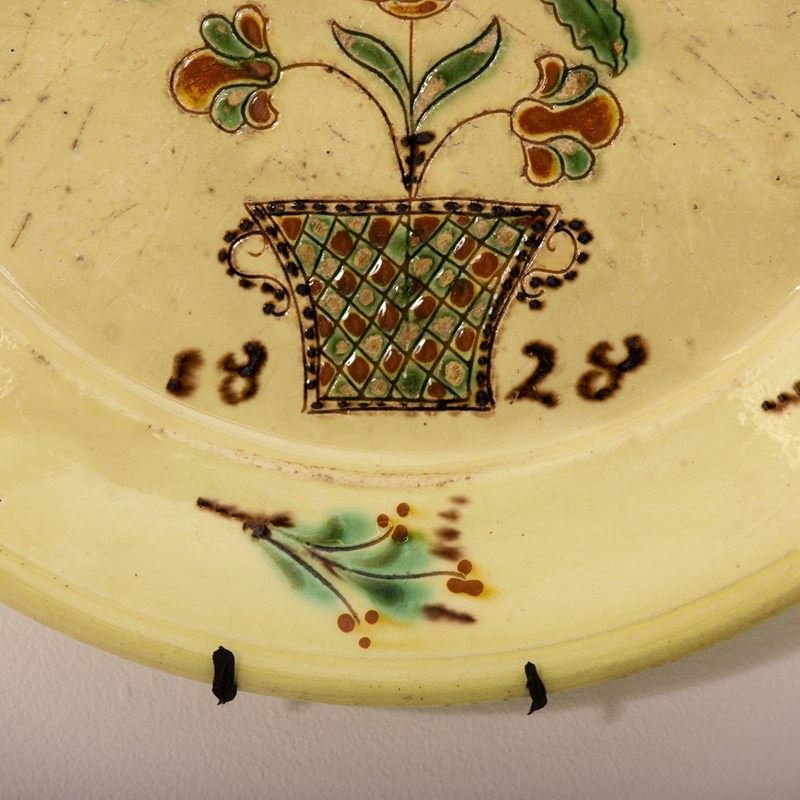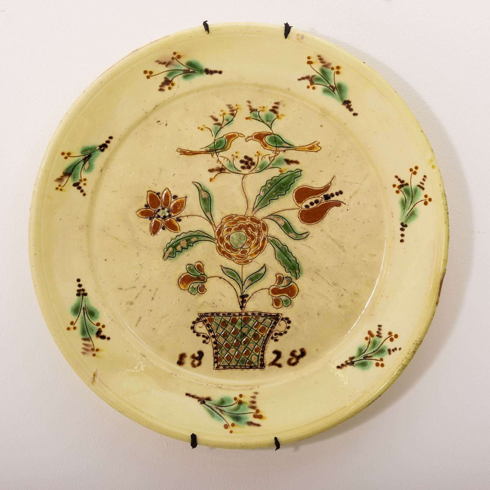 Early 19th-Century French Slipware Sgraffito Marriage Plate, Dated 1828 A charming and highly symbolic early 19th-century French slipware sgraffito marriage plate, decorated on a traditional yellow ground and dated 1828. Attributed to France, probably Sorrus. The plate depicts a joyous celebratory scene bordered with incised floral sprays or boutonnieres. At its center is a twin-handled urn filled with flowers, including a rose and a tulip-powerful symbols in floriography. The rose represents love, passion, and devotion, while the tulip signifies perfect or unconditional love and deep commitment. Above, nestled in the branches, are a pair of tourtereaux or lovebirds, emblematic of lifelong partnership, fidelity, and tenderness, inspired by their well-known bonding behaviors of pairing, preening, and affection. Rich in romantic symbolism and folk artistry, this plate is a beautiful and evocative example of early 19th-century French marriage ceramics and would make a compelling addition to any collection of folk art, slipware, or historic matrimonial objects.