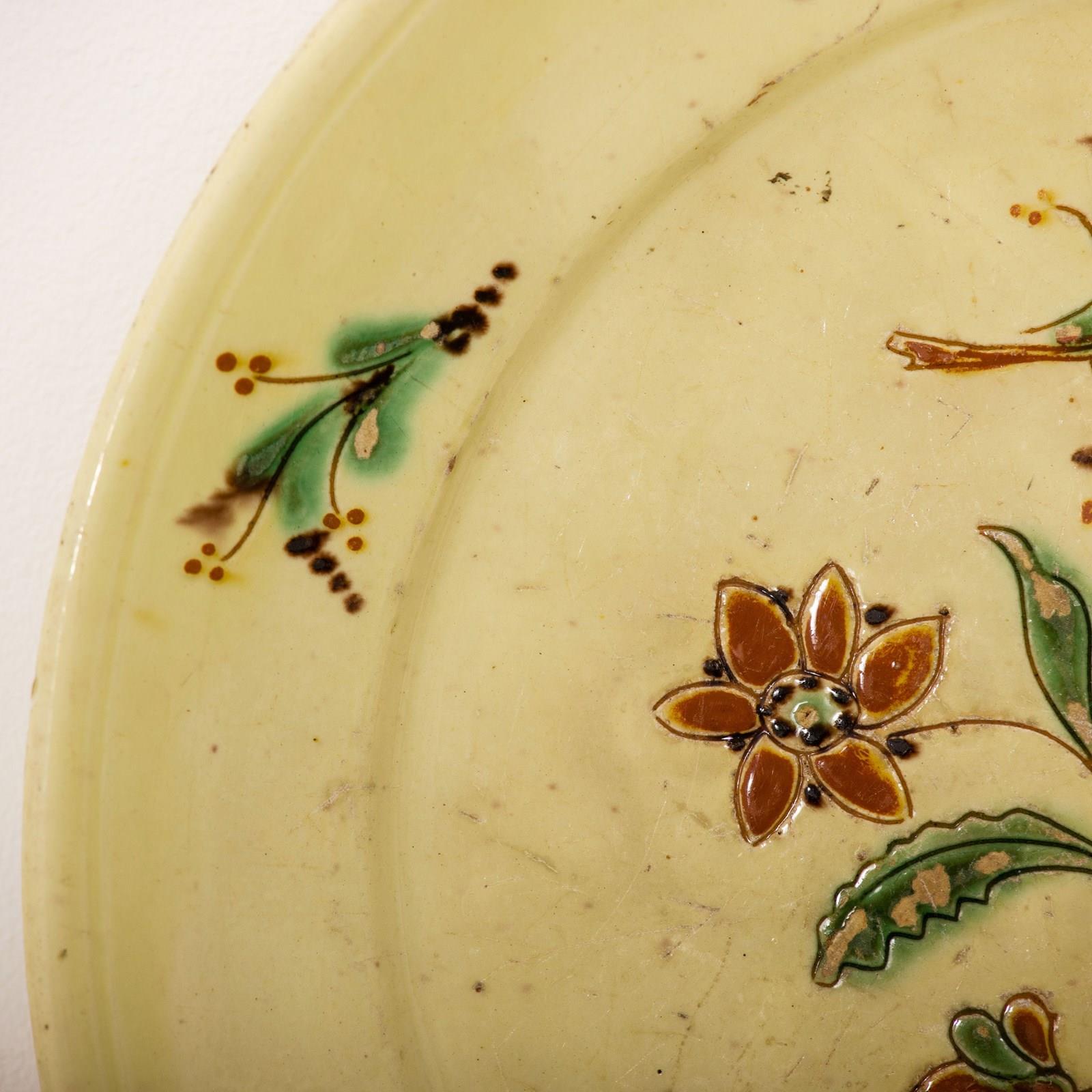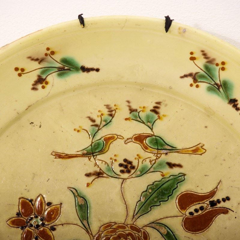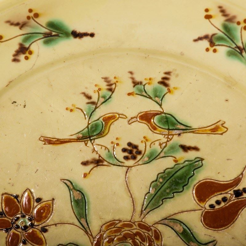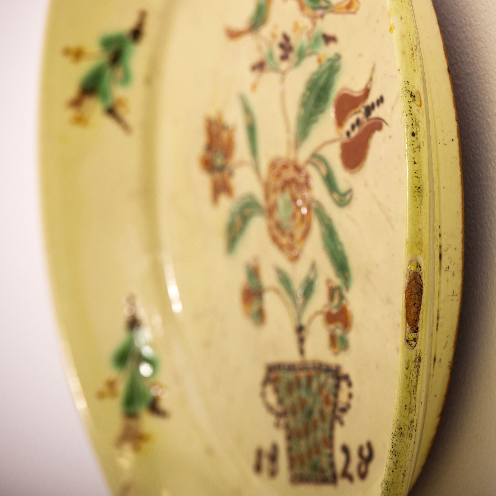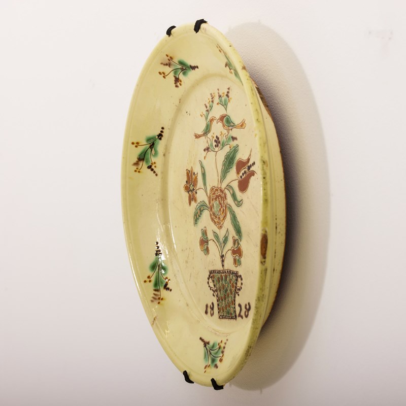Early 19th-Century French Slipware Sgraffito Marriage Plate, Dated 1828 A charming and highly symbolic early 19th-century French slipware sgraffito marriage plate, decorated on a traditional yellow ground and dated 1828. Attributed to France, probably Sorrus. The plate depicts a joyous celebratory scene bordered with incised floral sprays or boutonnieres. At its center is a twin-handled urn filled with flowers, including a rose and a tulip-powerful symbols in floriography. The rose represents love, passion, and devotion, while the tulip signifies perfect or unconditional love and deep commitment. Above, nestled in the branches, are a pair of tourtereaux or lovebirds, emblematic of lifelong partnership, fidelity, and tenderness, inspired by their well-known bonding behaviors of pairing, preening, and affection. Rich in romantic symbolism and folk artistry, this plate is a beautiful and evocative example of early 19th-century French marriage ceramics and would make a compelling addition to any collection of folk art, slipware, or historic matrimonial objects.