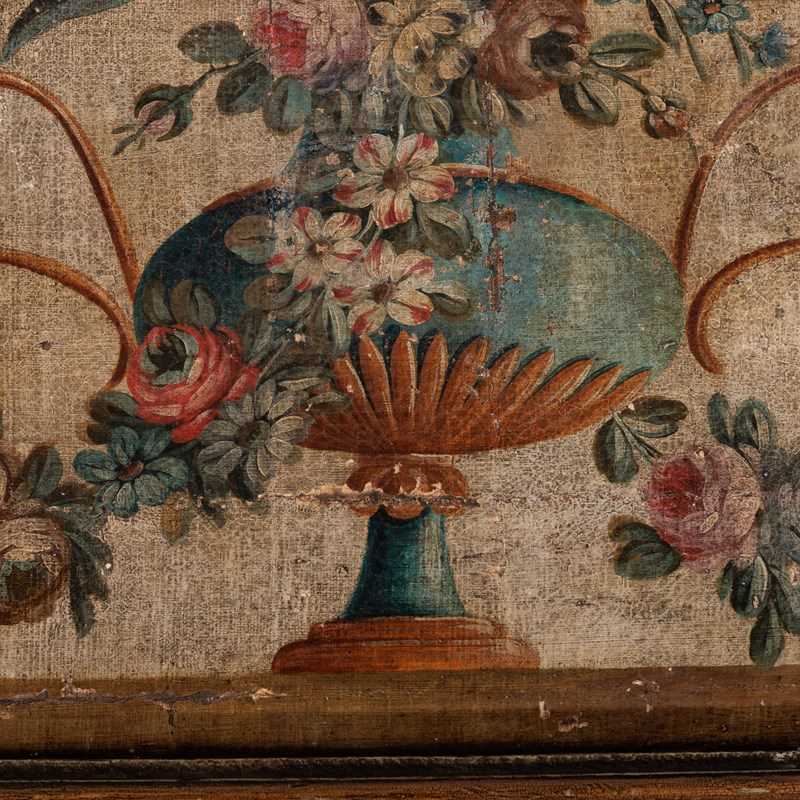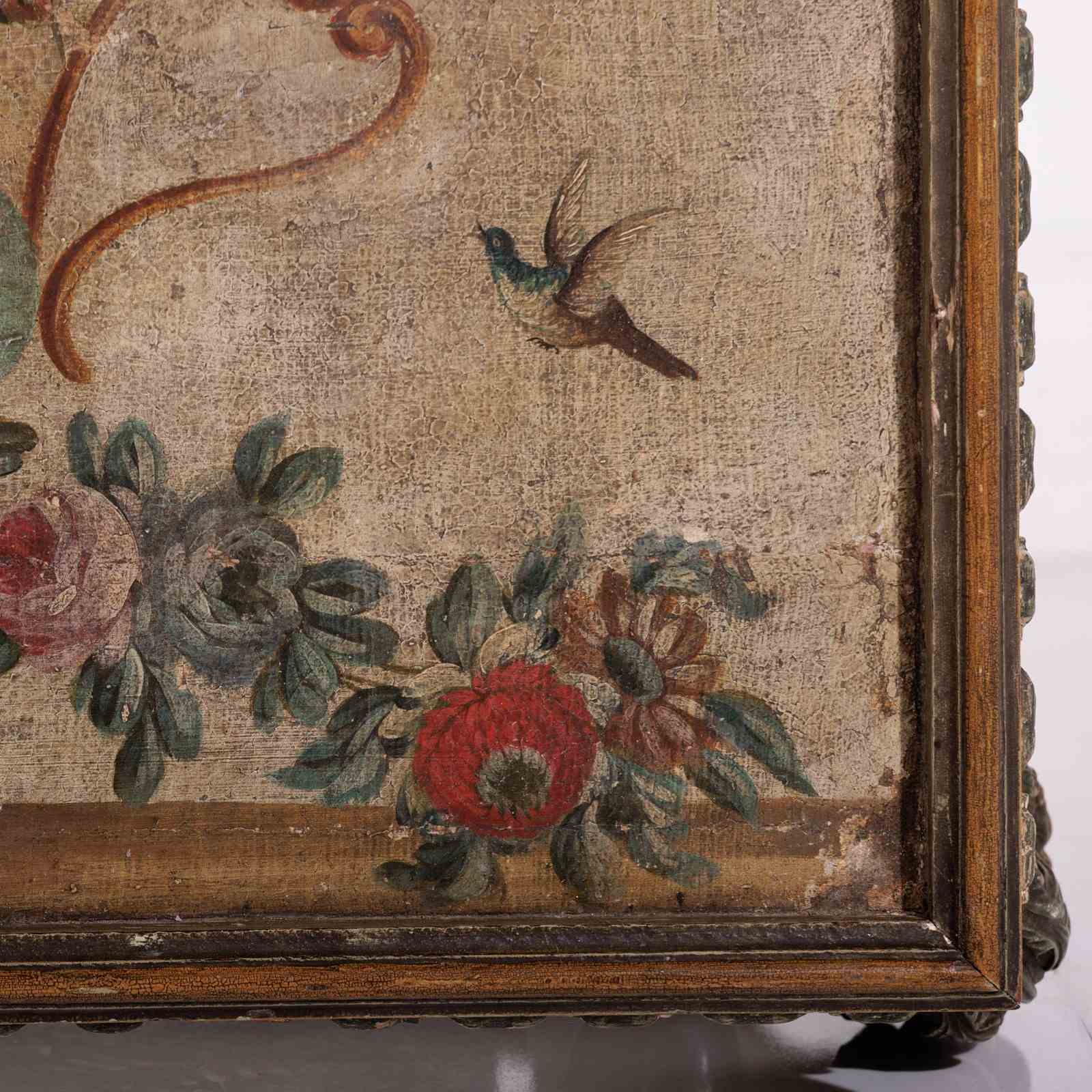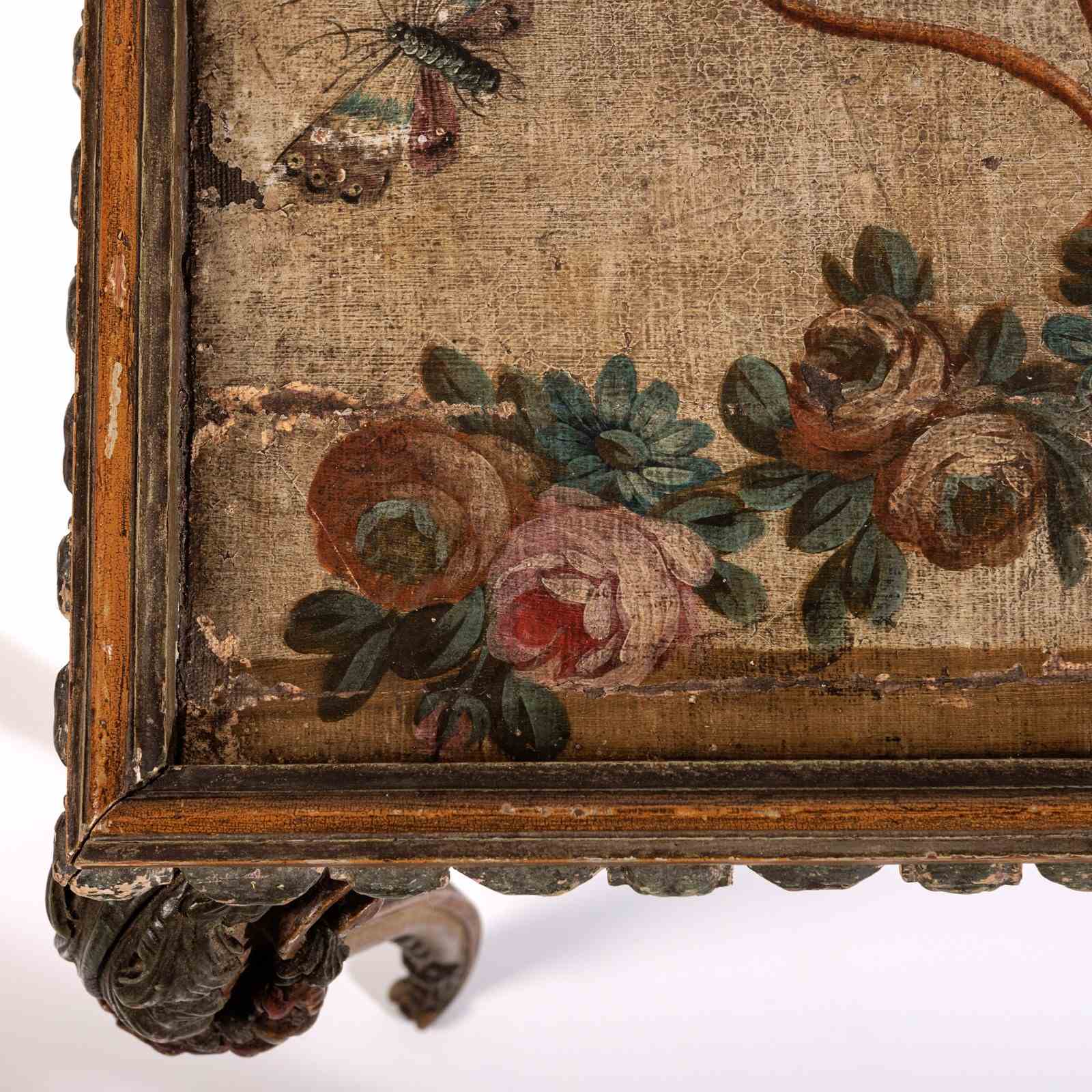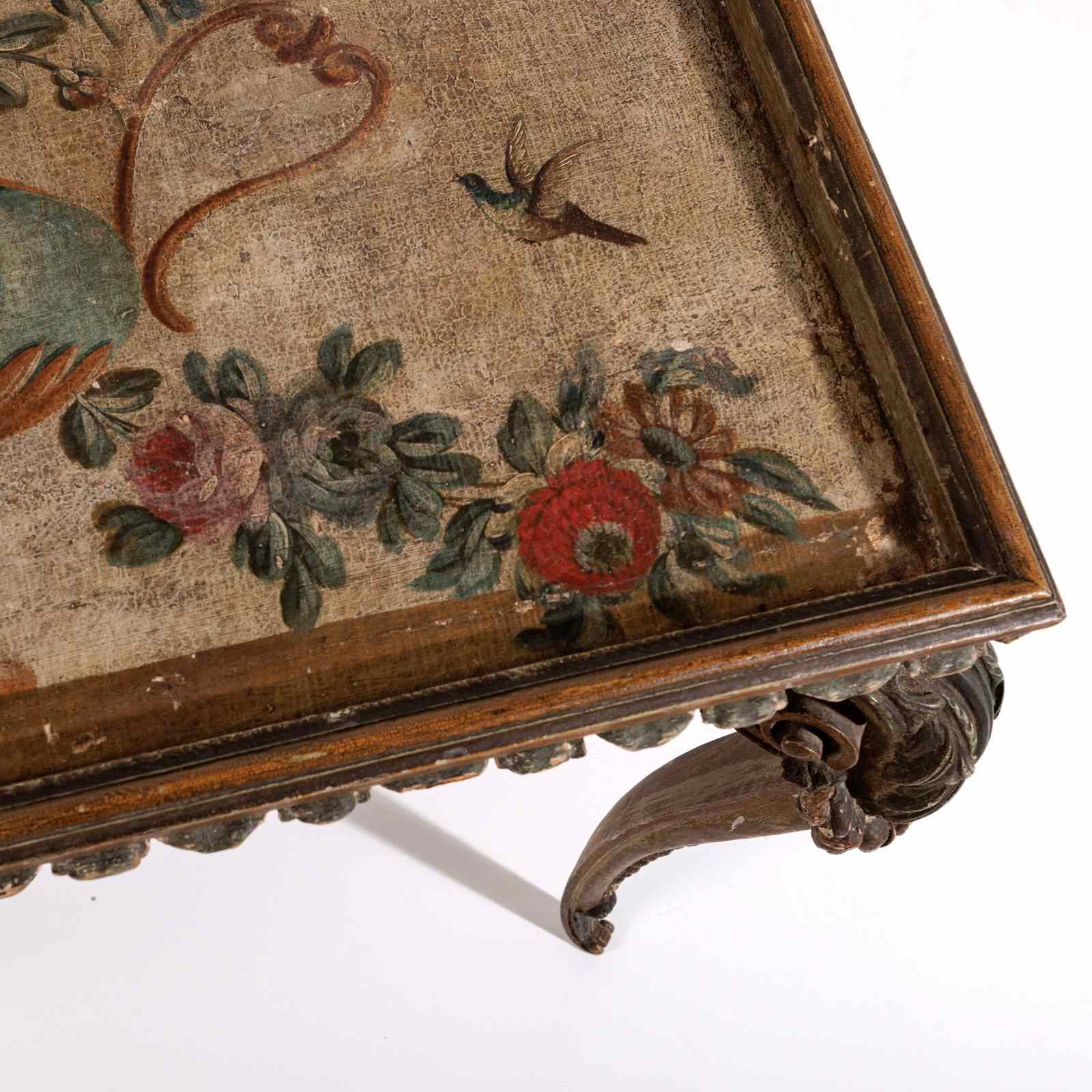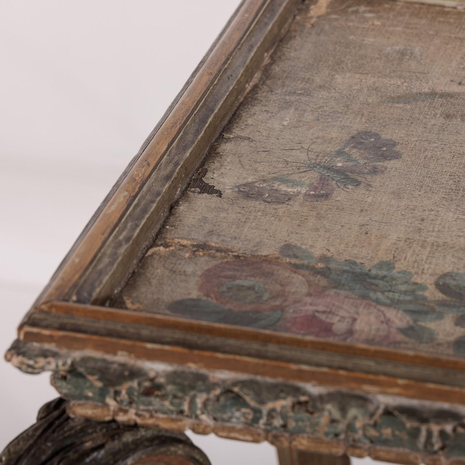 Extraordinary 18th Century Painted side table, Delicate scroll legs, carved in draped garlands. The surface a remarkable painted Urn or vase of flowers, with butterflies, birds and insects. Weat commensurate with age. France Circa 1780.