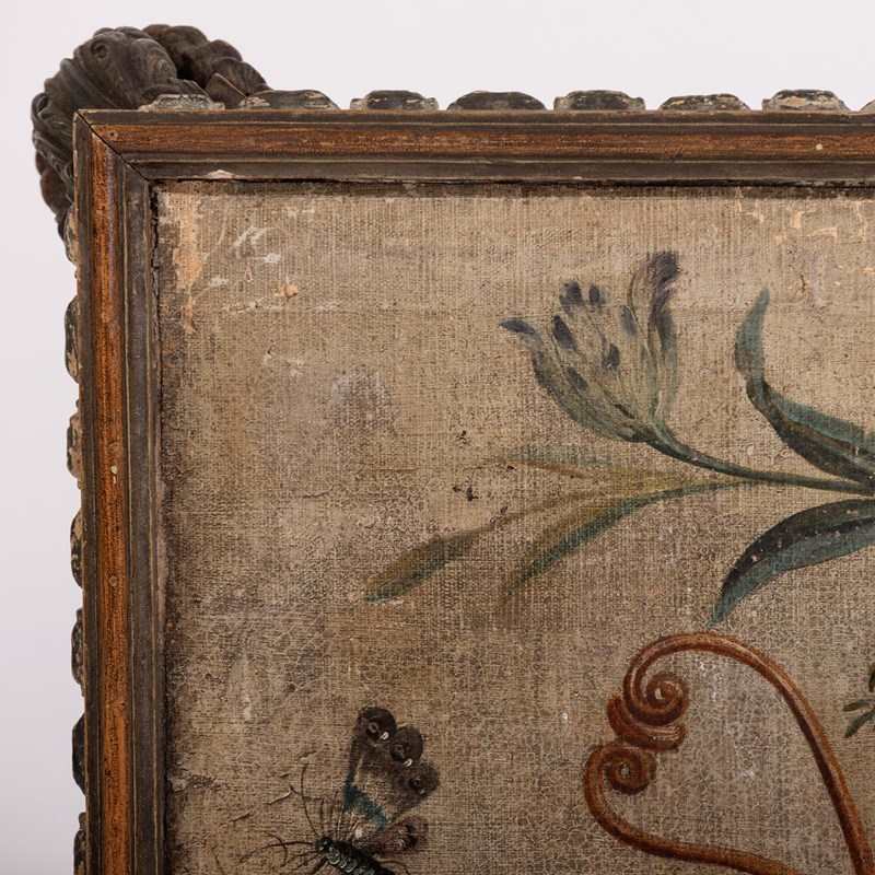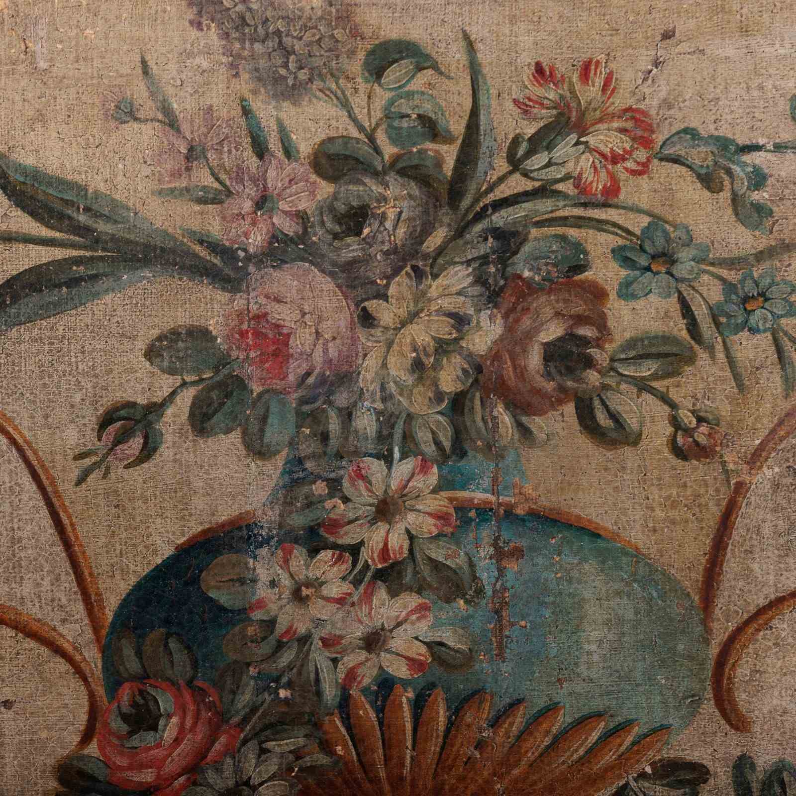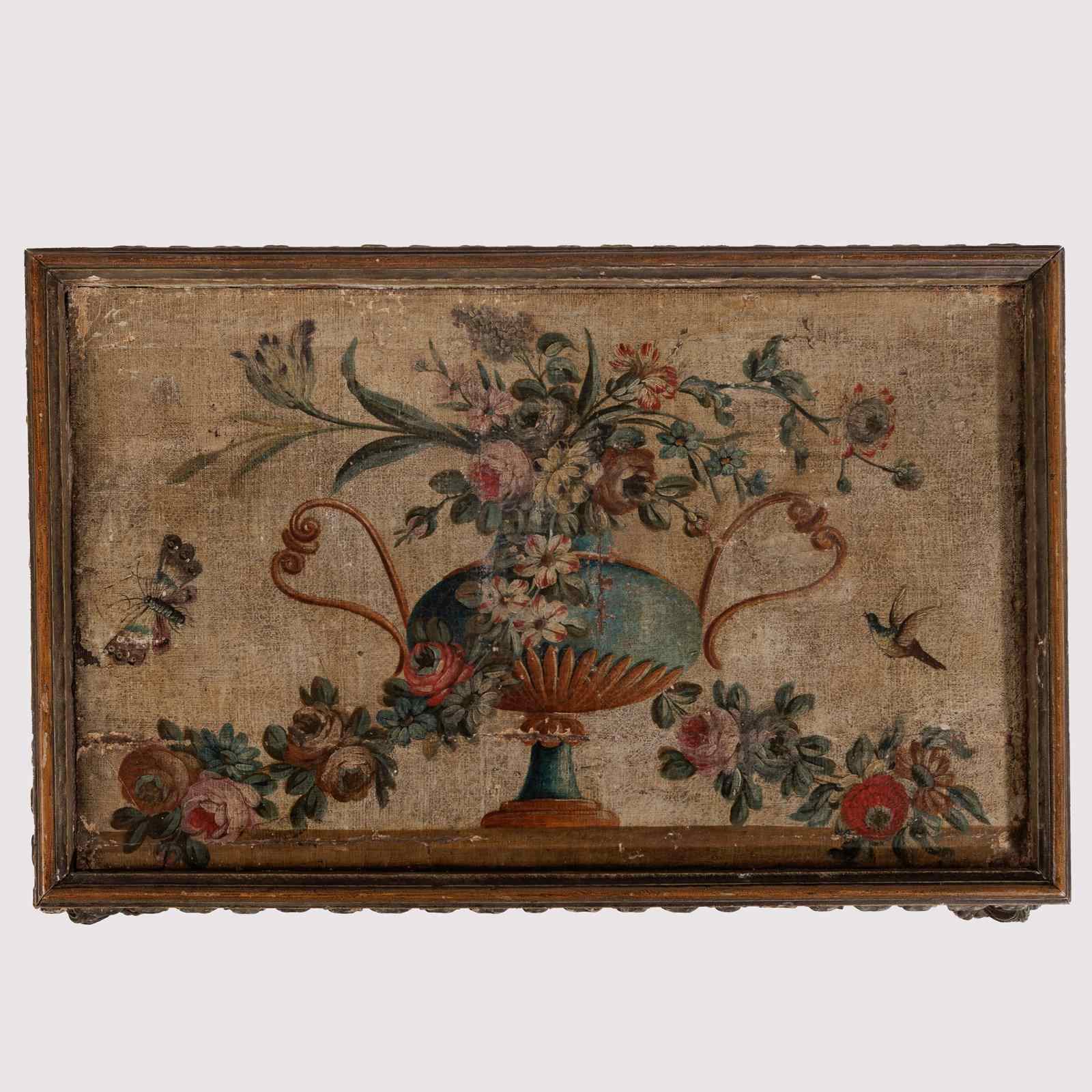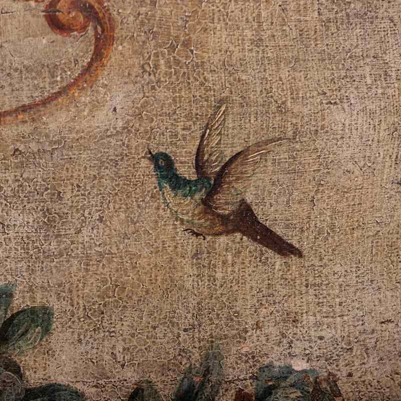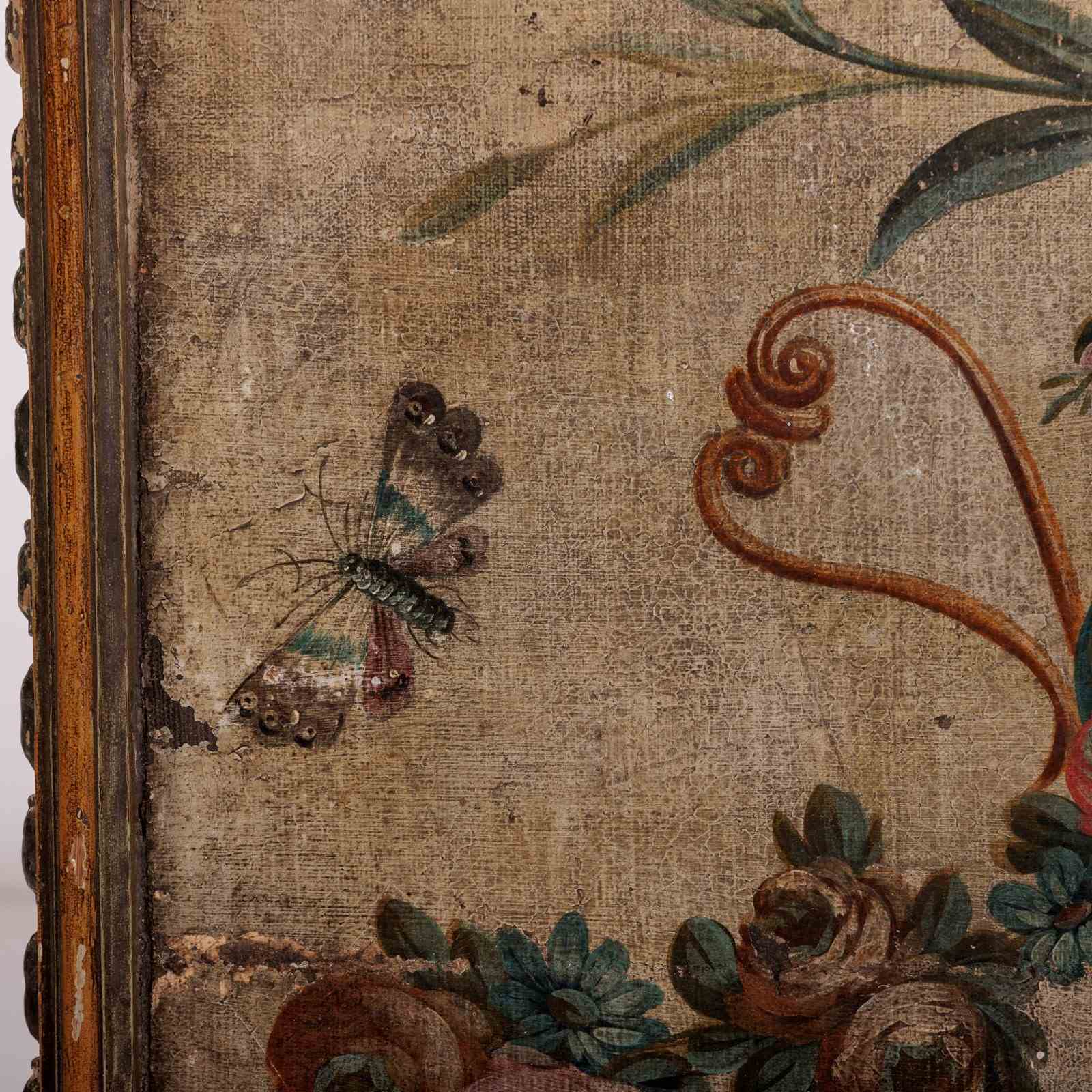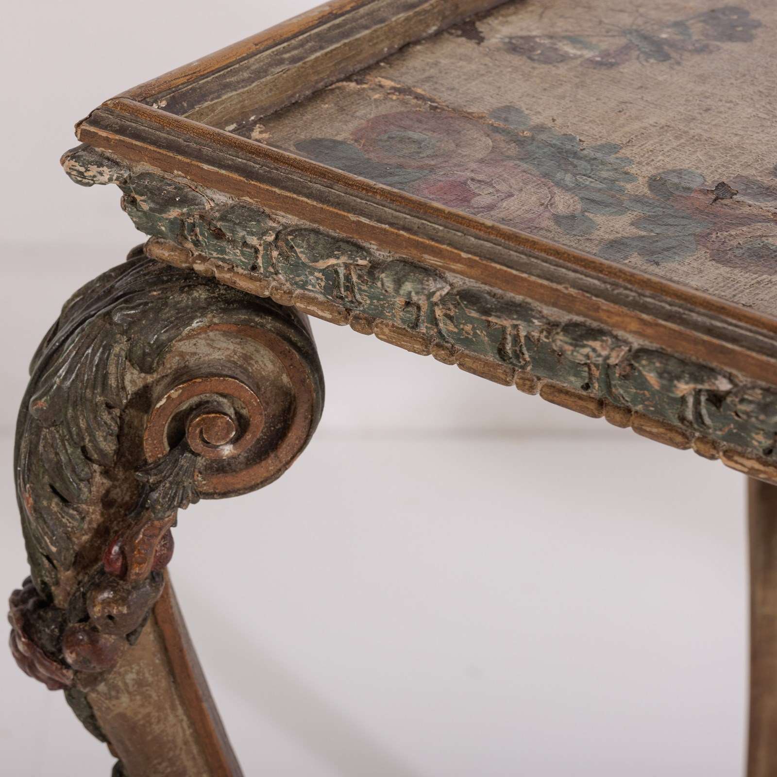 Extraordinary 18th Century Painted side table, Delicate scroll legs, carved in draped garlands. The surface a remarkable painted Urn or vase of flowers, with butterflies, birds and insects. Weat commensurate with age. France Circa 1780.