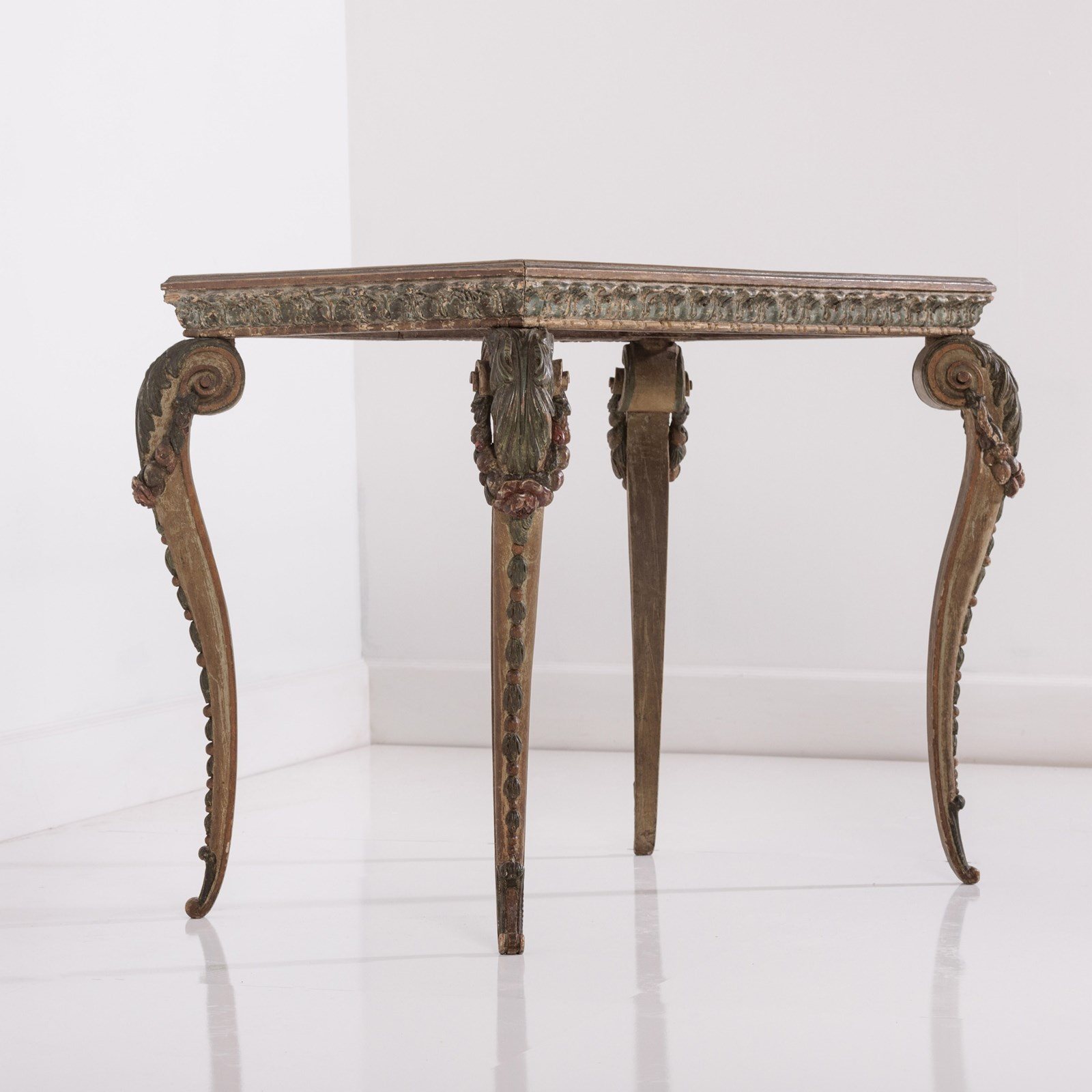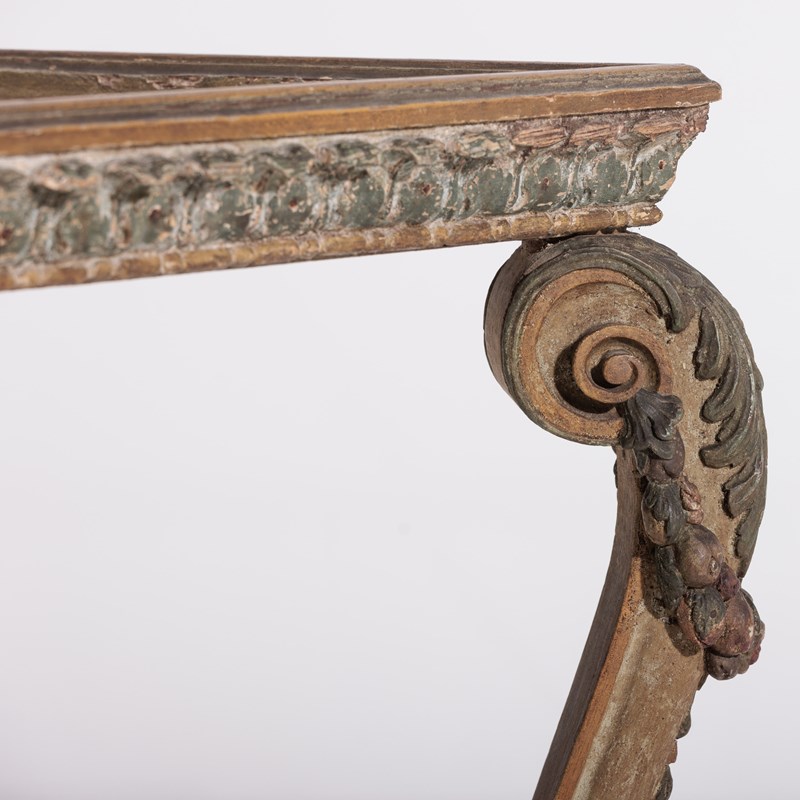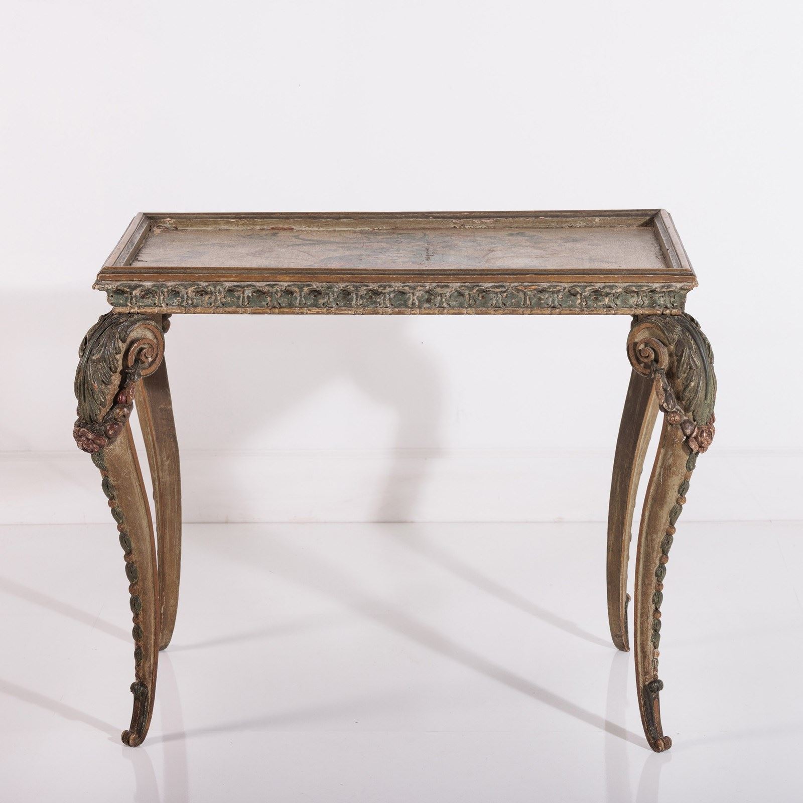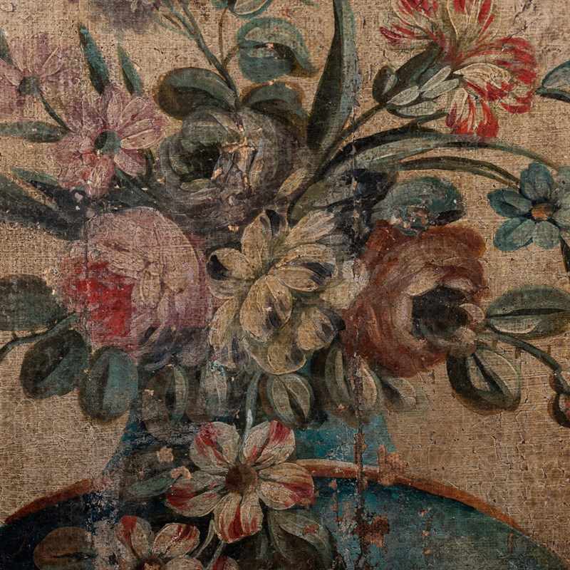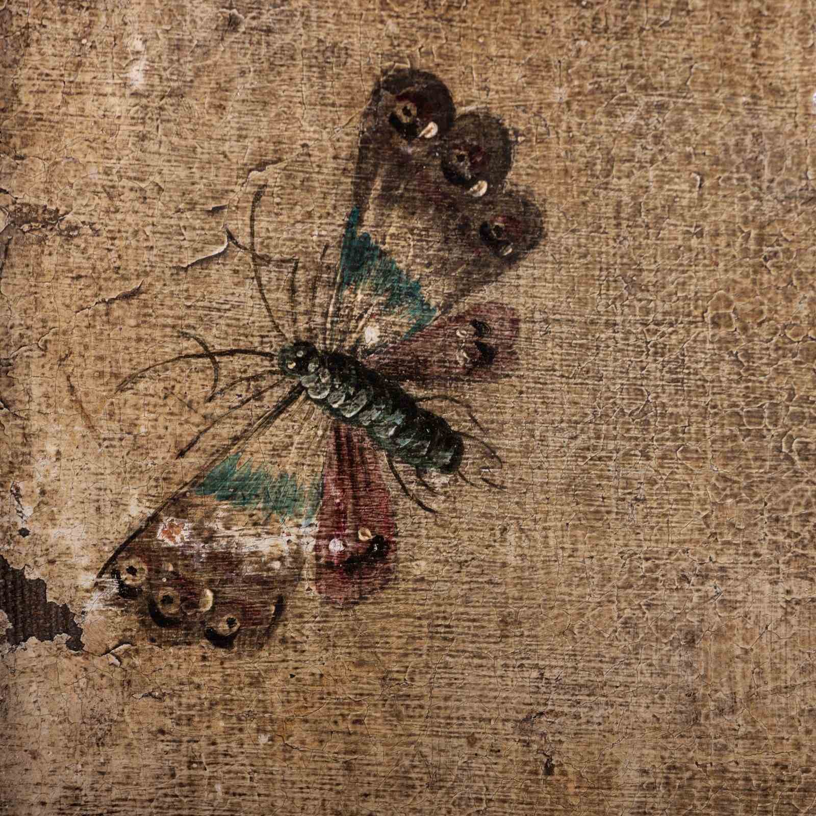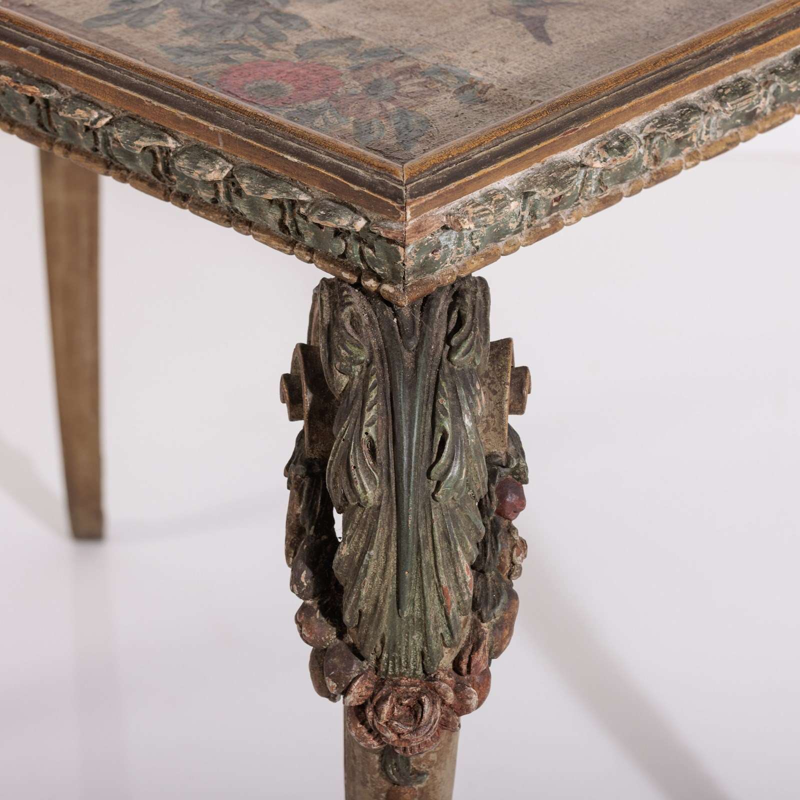 Extraordinary 18th Century Painted side table, Delicate scroll legs, carved in draped garlands. The surface a remarkable painted Urn or vase of flowers, with butterflies, birds and insects. Weat commensurate with age. France Circa 1780.