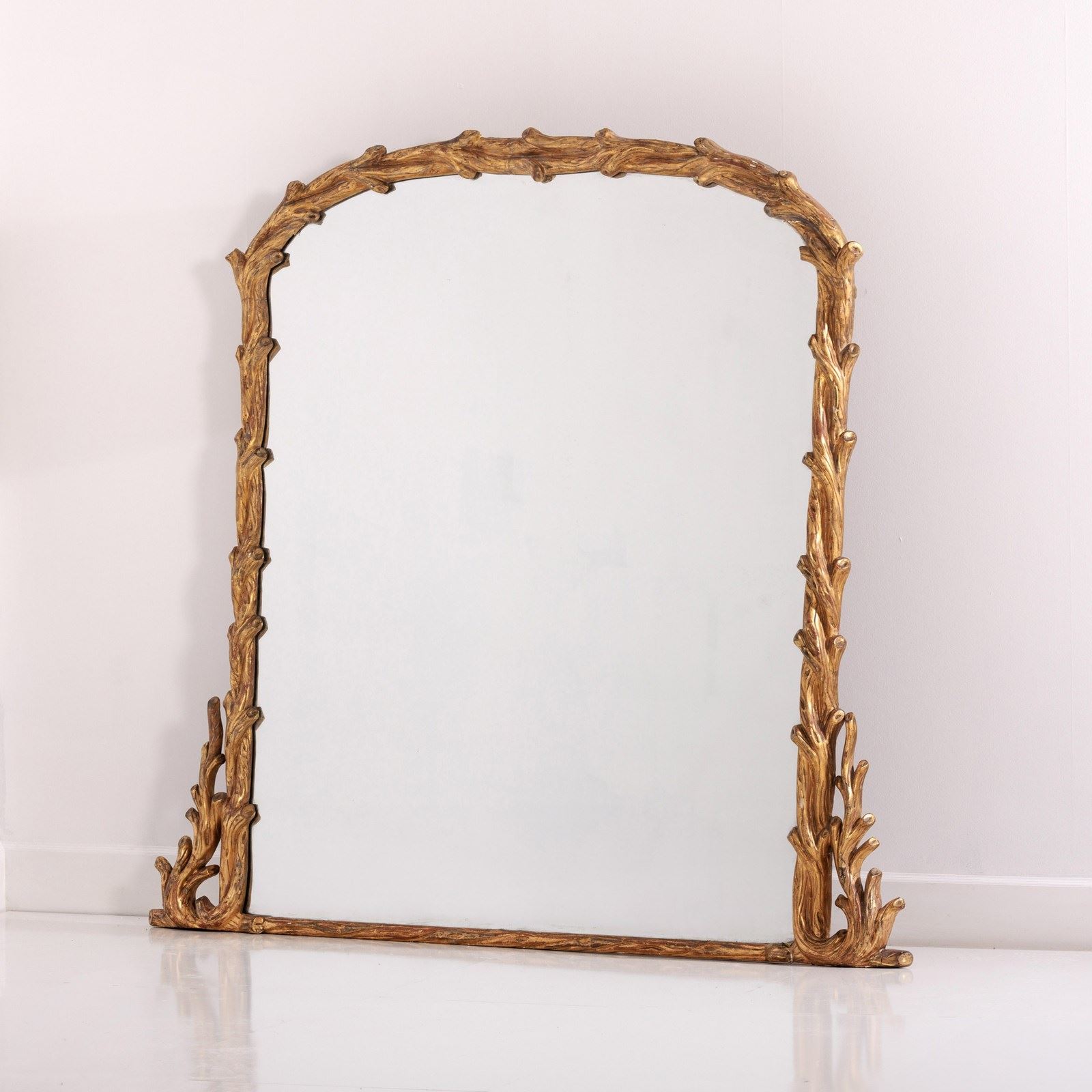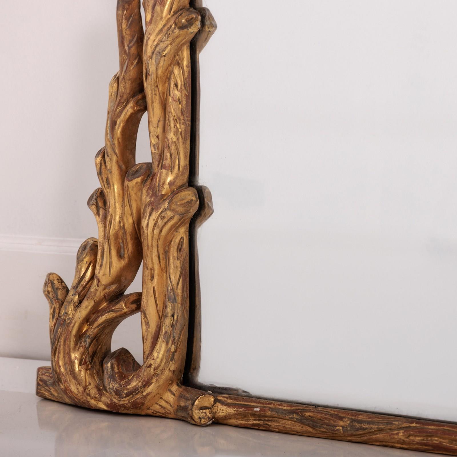 Large Naturalistic Faux Bois Giltwood Overmantle Mirror. Excellent original clean mirror plate, sparkling mercury glass comes alive once it catches the light. Super statement mirror. England, Circa 1840..