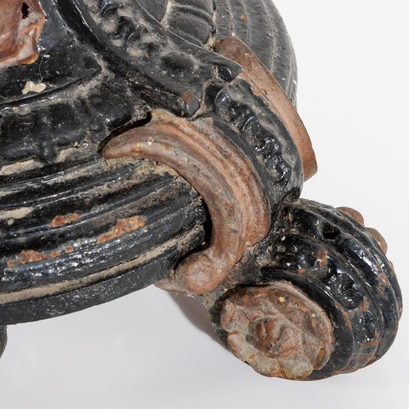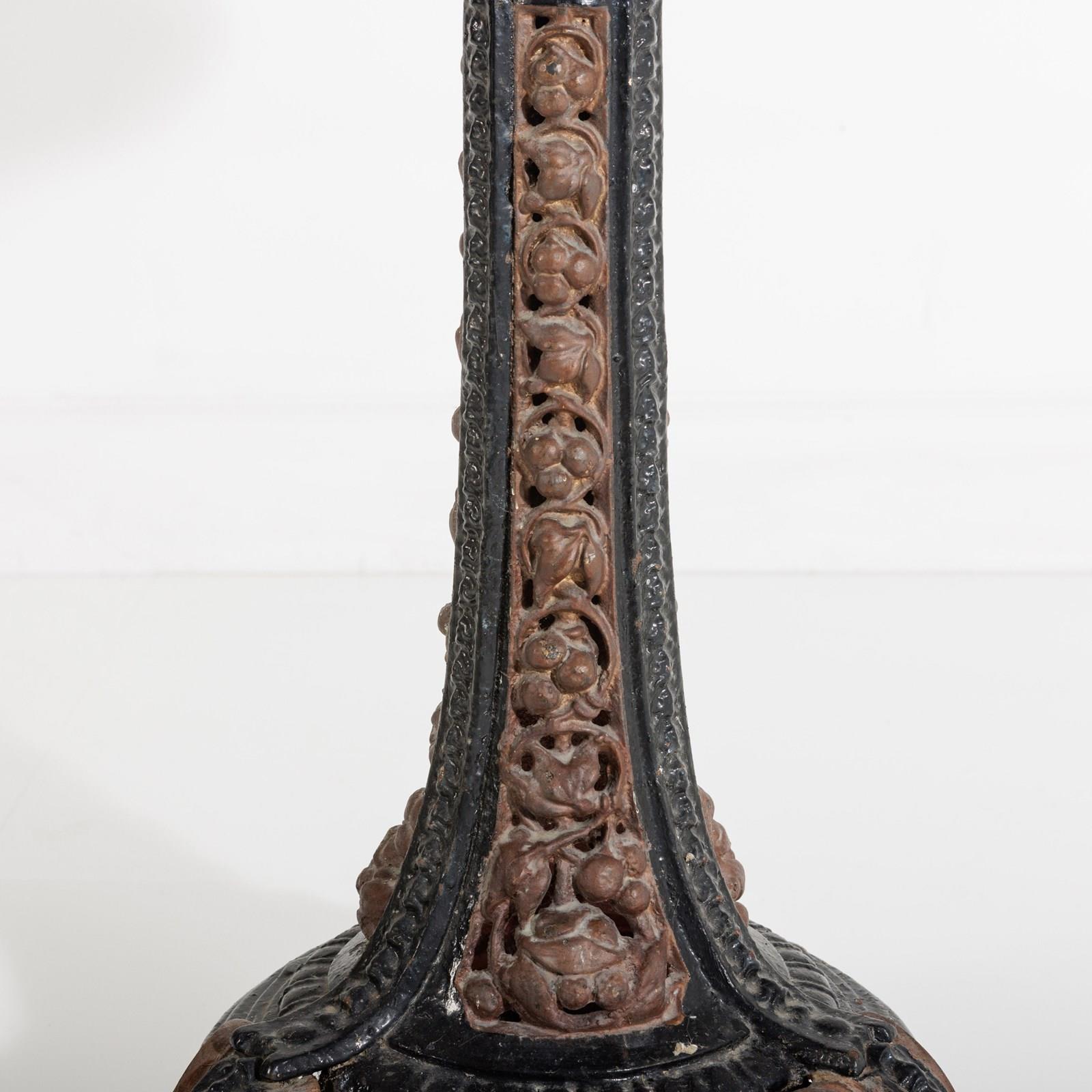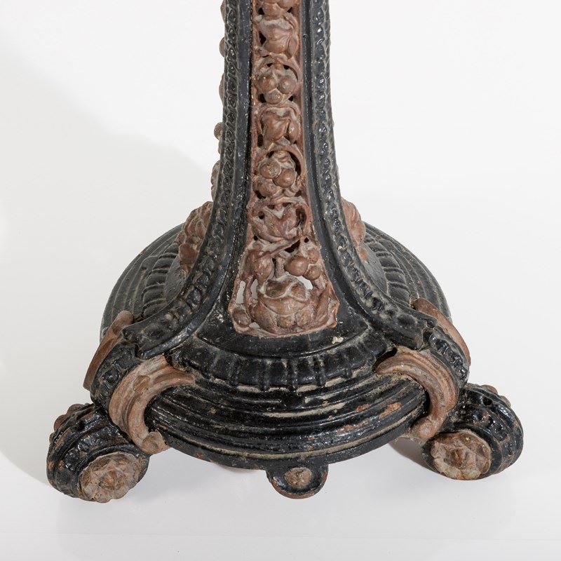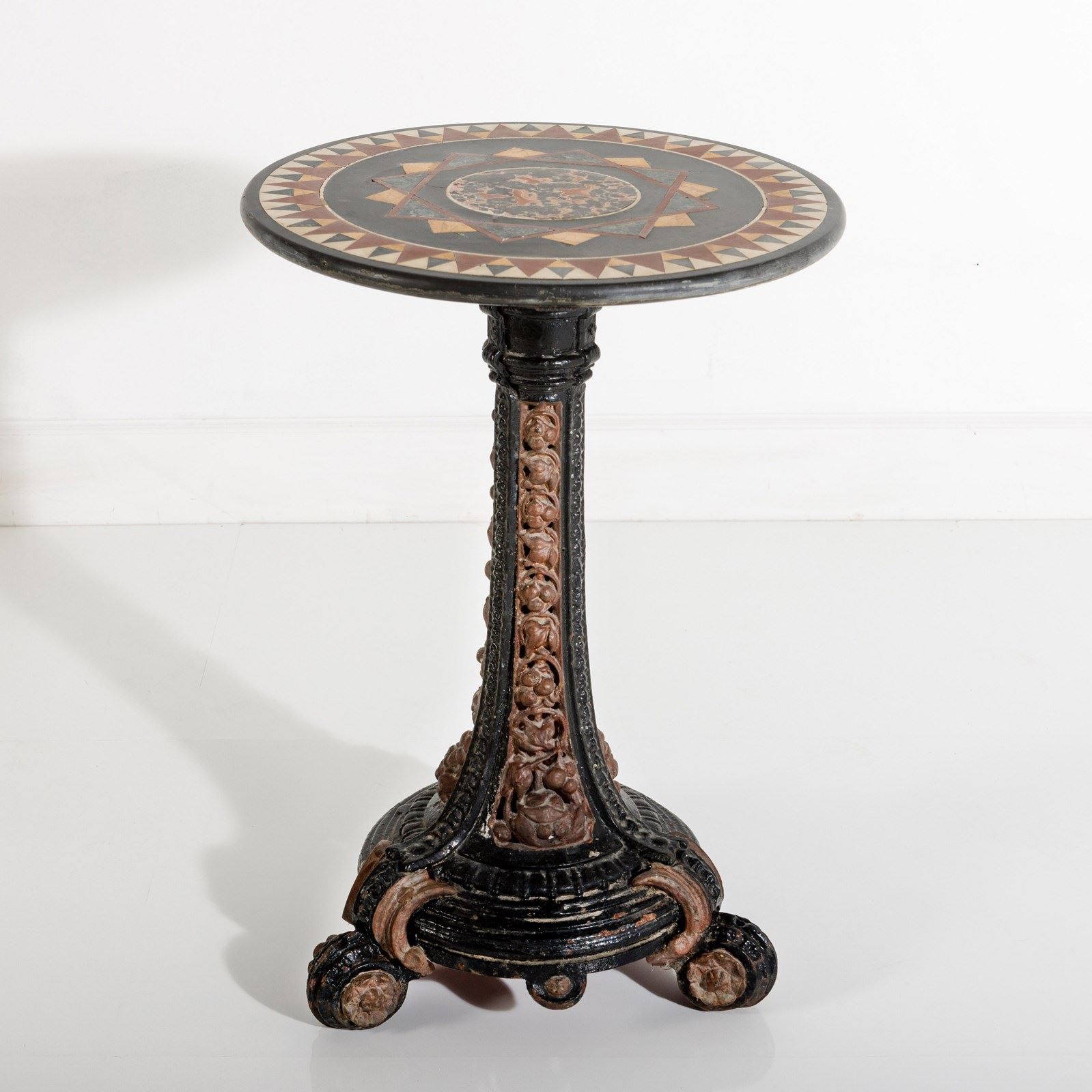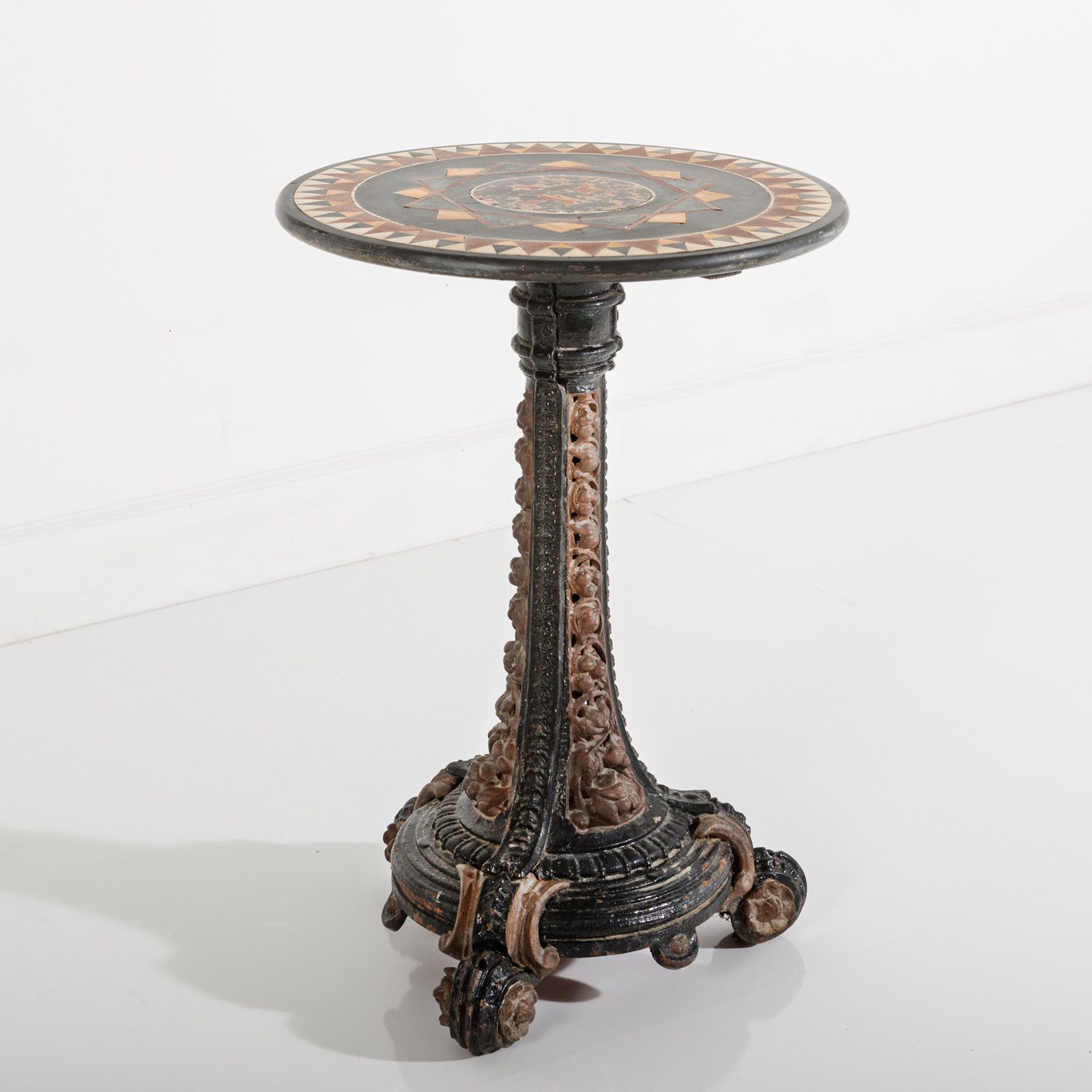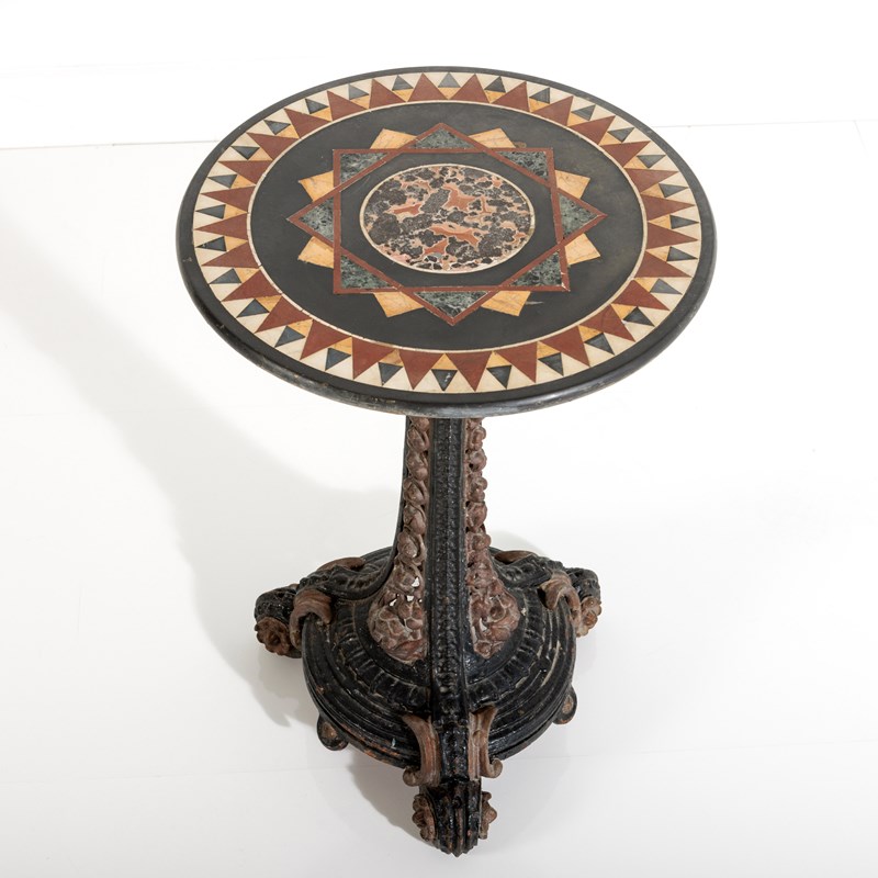Late 19th or Early 20th Century Italian Grand Tour Pietra Dura Specimen Marble Table, Mounted to an English, Painted Cast Iron Coalbrookedale Table Base. Wear commensurate, Minor restorations, with age excellent geometric pattern. Circa 1890.