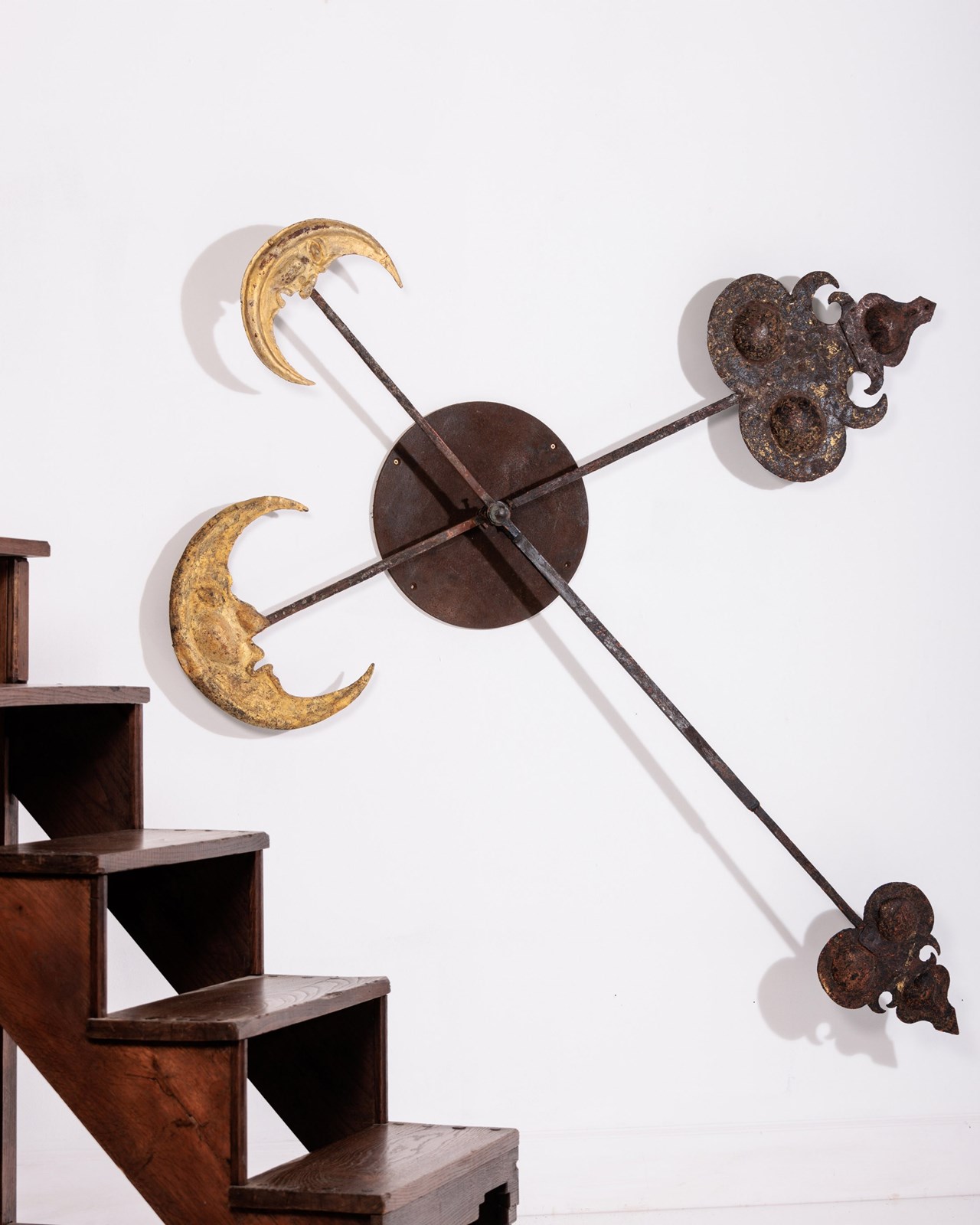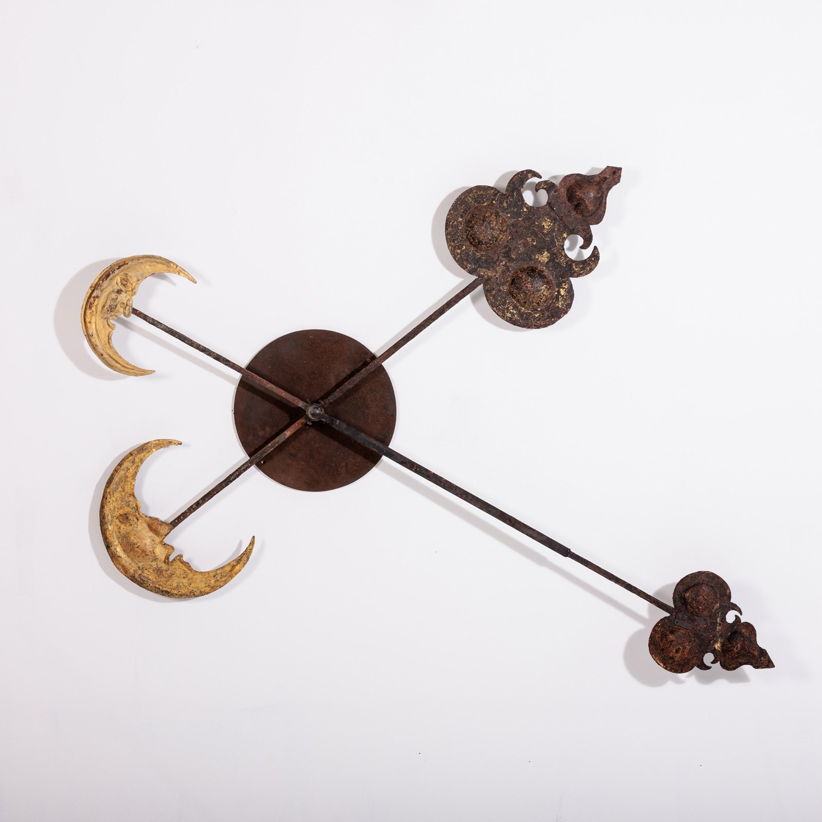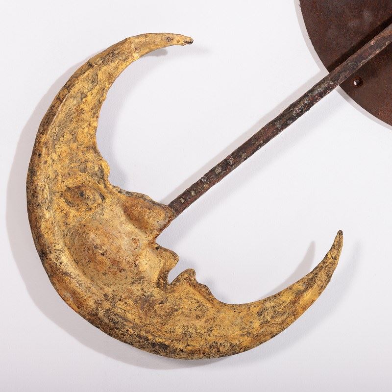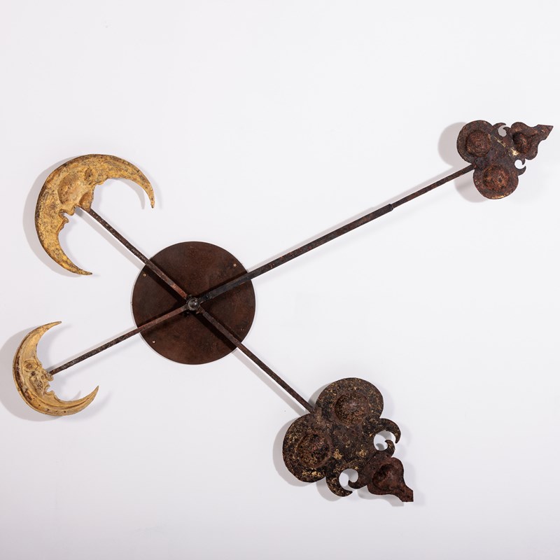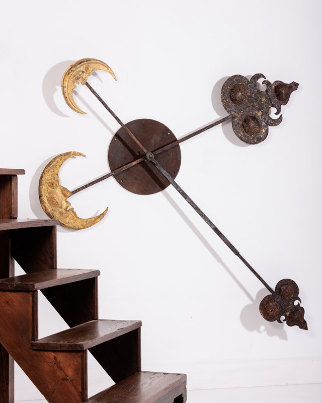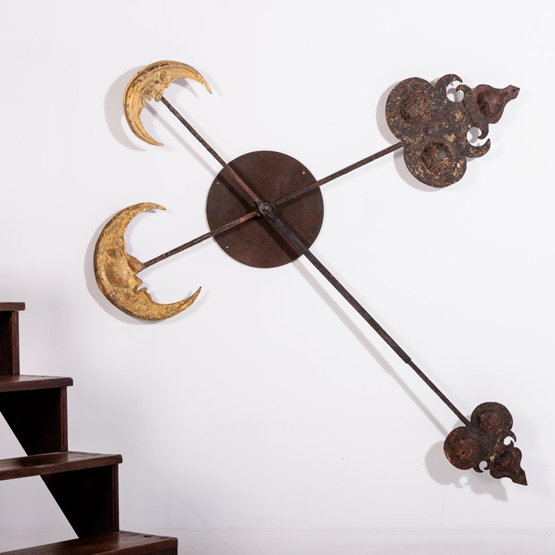 Huge and Enchanting Late 19th Century Moon Face Clock Tower Hands. This striking pair of huge iron and tole tower clock hands exude historic grandeur, featuring gilded moon faces on one side and directional arrows on the other. Their impressive scale suggests they once adorned a monumental tower clock, guiding the passage of time with elegance. The gilded moon faces, now softened by age, contrast beautifully with the time worn patina of the iron. Although the moon faces are the star of the show the intricate silhouette of the directional arrows add a dynamic touch. These hands embody a perfect blend of craftsmanship, artistry, function and history. Pointed hands, with Gilt Moon faces. Iron and Tole. Rare and impressive. Bespoke made mounting plate to display and move hands into any position for display. France Circa 1860.