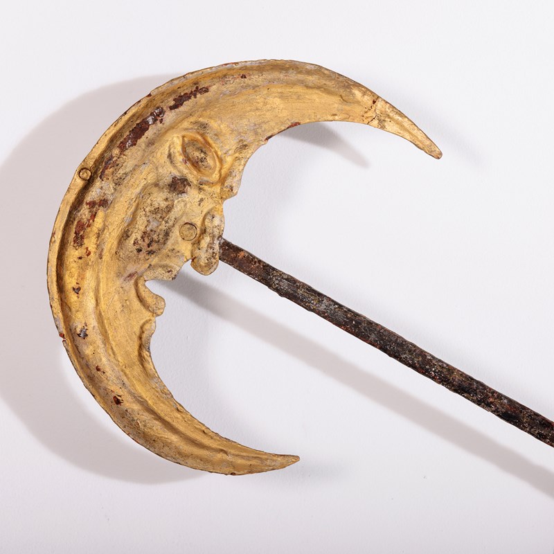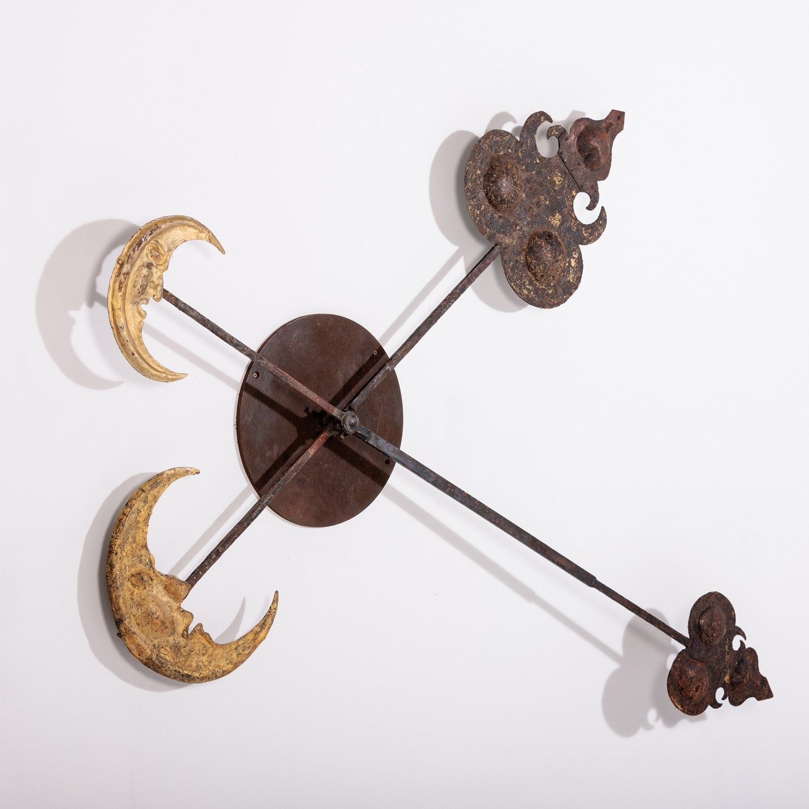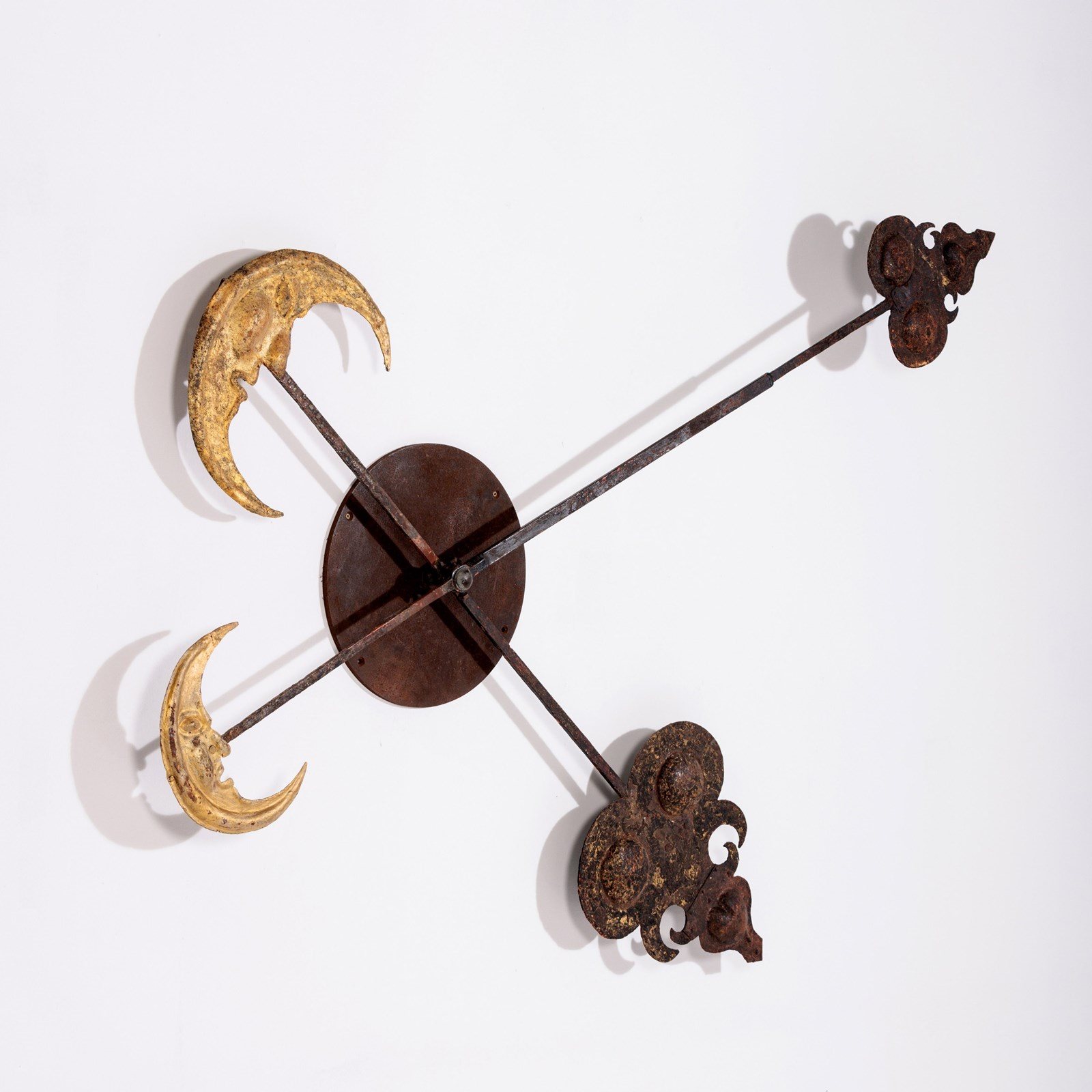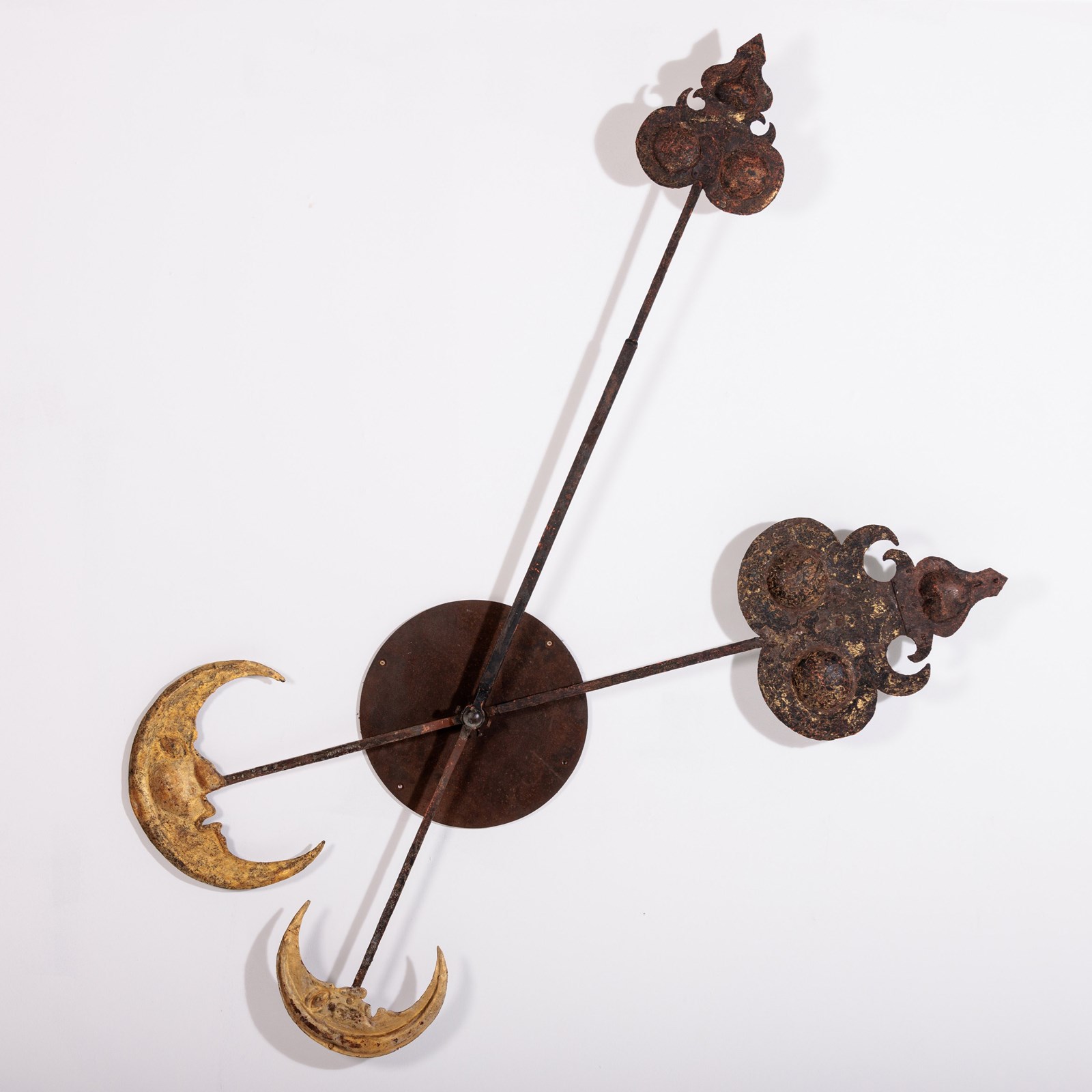 Huge and Enchanting Late 19th Century Moon Face Clock Tower Hands. This striking pair of huge iron and tole tower clock hands exude historic grandeur, featuring gilded moon faces on one side and directional arrows on the other. Their impressive scale suggests they once adorned a monumental tower clock, guiding the passage of time with elegance. The gilded moon faces, now softened by age, contrast beautifully with the time worn patina of the iron. Although the moon faces are the star of the show the intricate silhouette of the directional arrows add a dynamic touch. These hands embody a perfect blend of craftsmanship, artistry, function and history. Pointed hands, with Gilt Moon faces. Iron and Tole. Rare and impressive. Bespoke made mounting plate to display and move hands into any position for display. France Circa 1860.