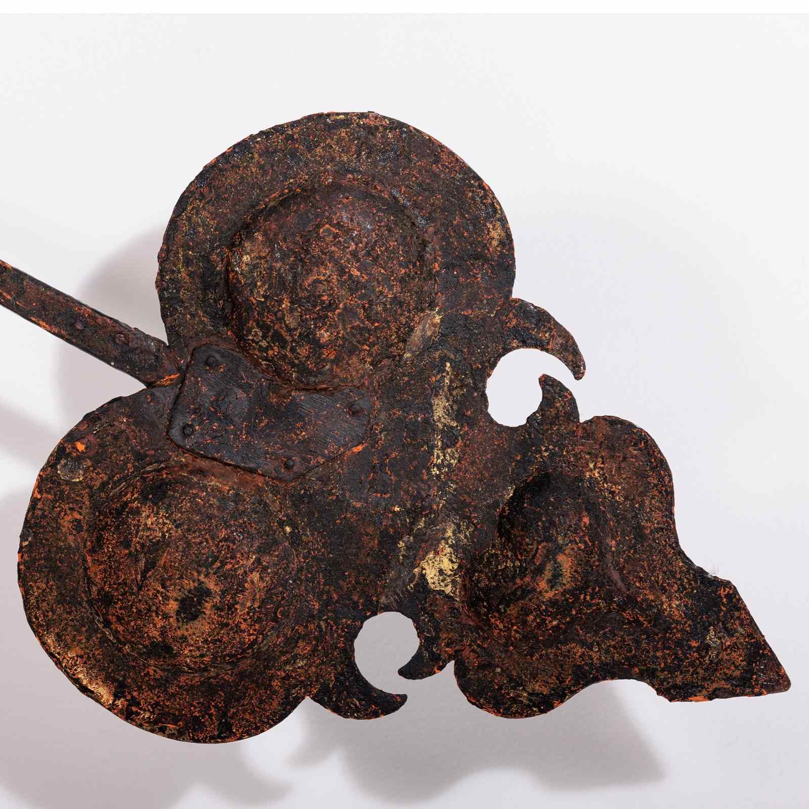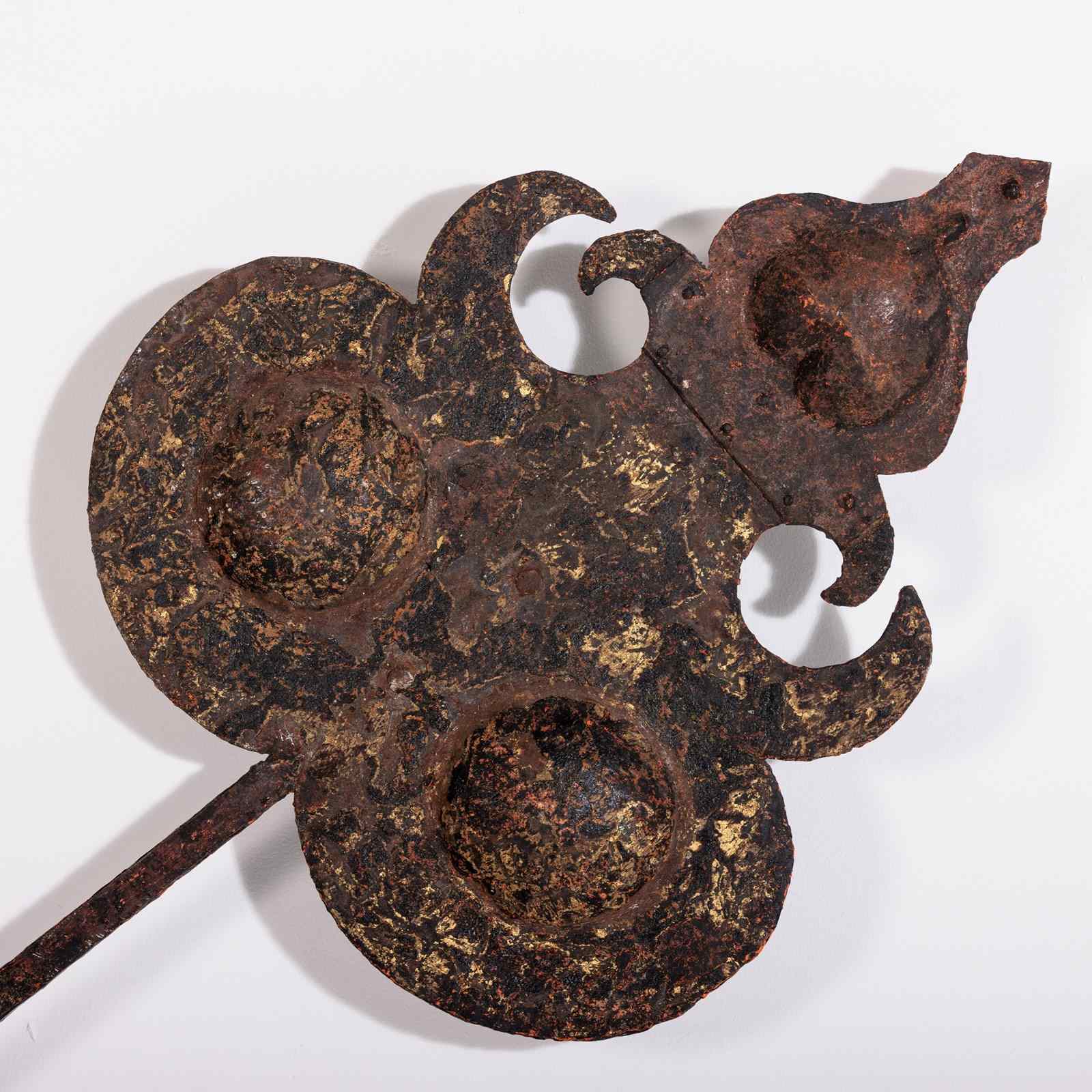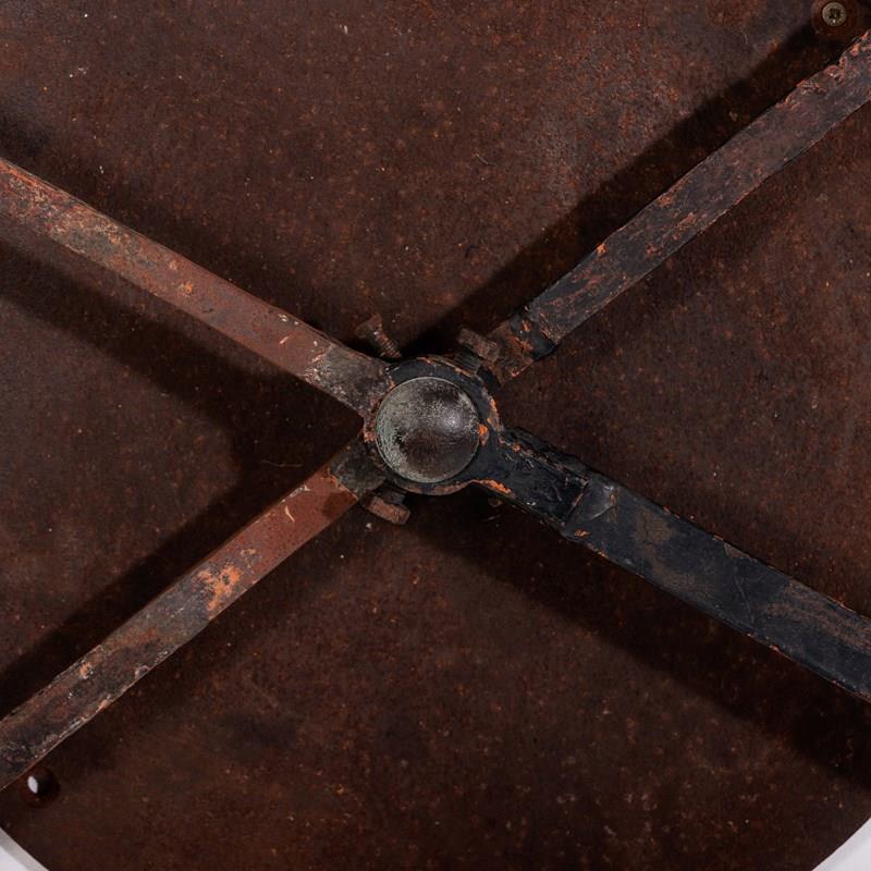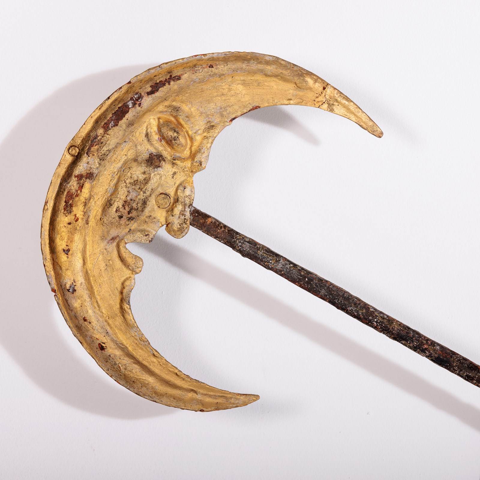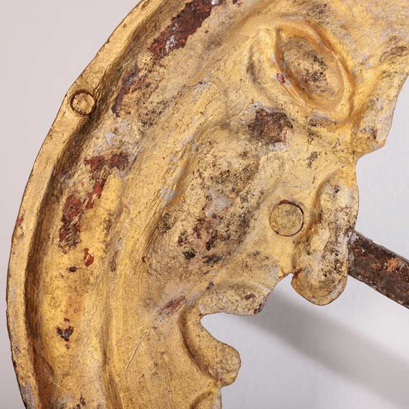 Huge and Enchanting Late 19th Century Moon Face Clock Tower Hands. This striking pair of huge iron and tole tower clock hands exude historic grandeur, featuring gilded moon faces on one side and directional arrows on the other. Their impressive scale suggests they once adorned a monumental tower clock, guiding the passage of time with elegance. The gilded moon faces, now softened by age, contrast beautifully with the time worn patina of the iron. Although the moon faces are the star of the show the intricate silhouette of the directional arrows add a dynamic touch. These hands embody a perfect blend of craftsmanship, artistry, function and history. Pointed hands, with Gilt Moon faces. Iron and Tole. Rare and impressive. Bespoke made mounting plate to display and move hands into any position for display. France Circa 1860.