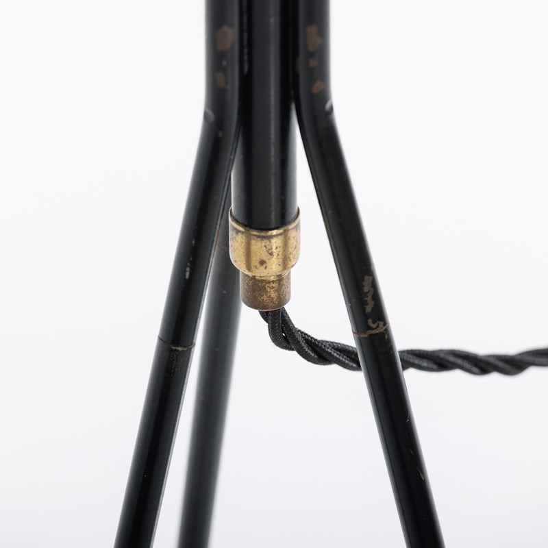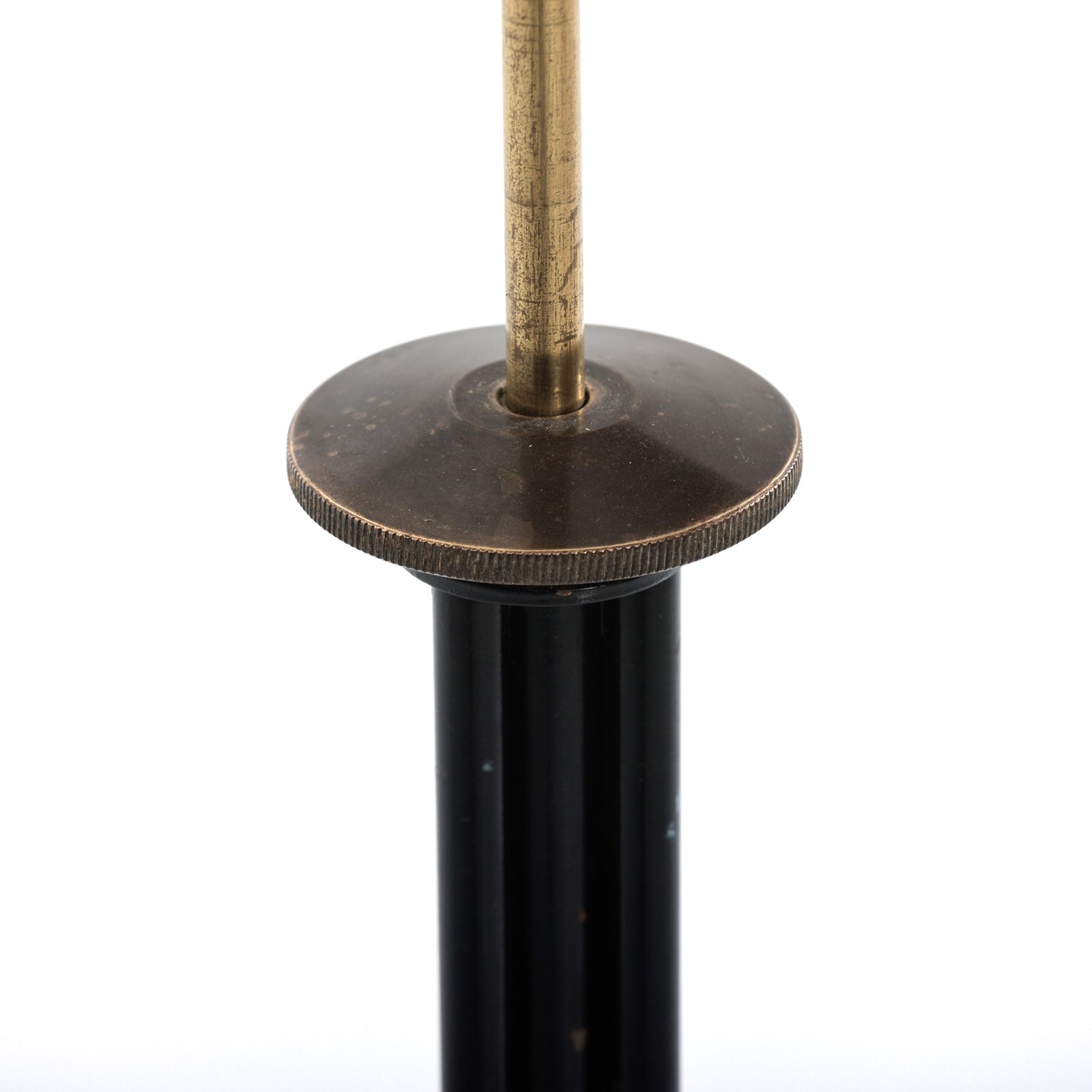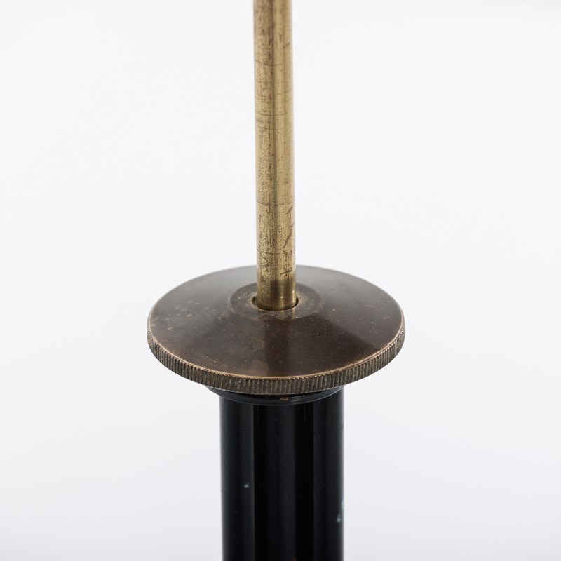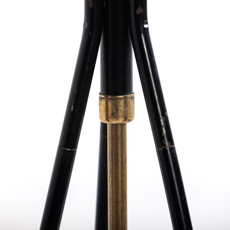 Striking Mid Century telescopic tripod floor lamp. The central brass column rises and falls with a well patinated brass bezel. Standing on fixed tripod legs with brass details. Italy, Circa 1950. Measurements at highest setting.