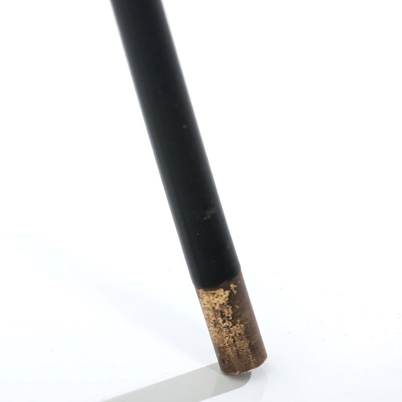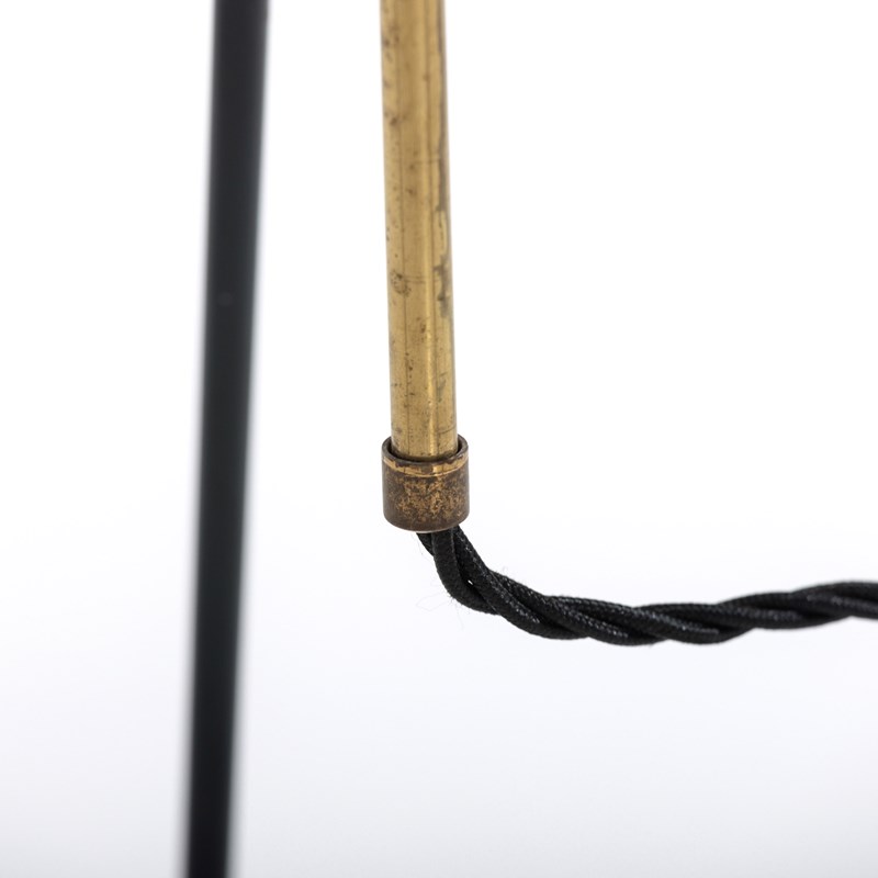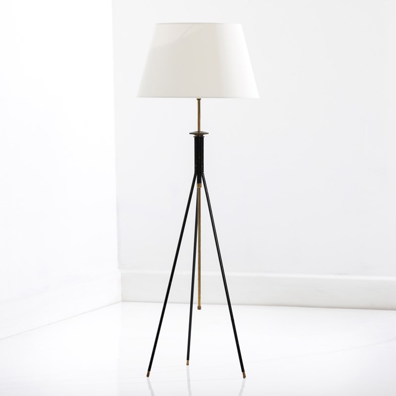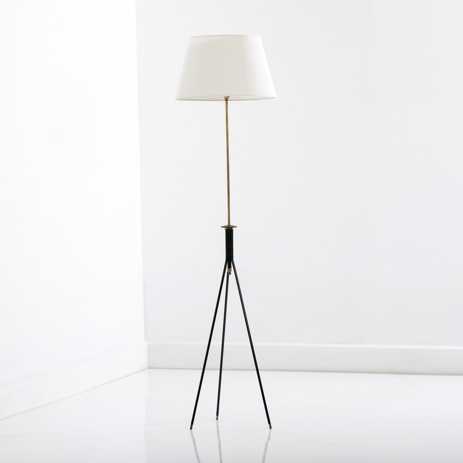 Striking Mid Century telescopic tripod floor lamp. The central brass column rises and falls with a well patinated brass bezel. Standing on fixed tripod legs with brass details. Italy, Circa 1950. Measurements at highest setting.