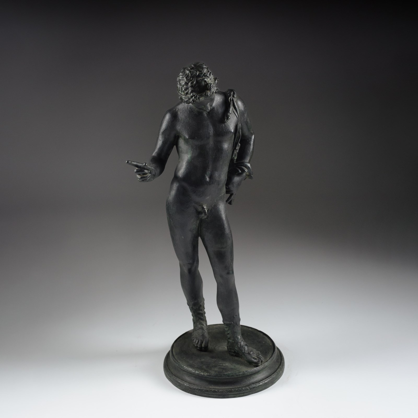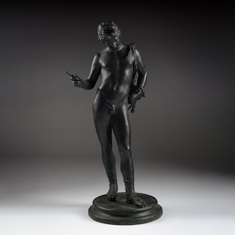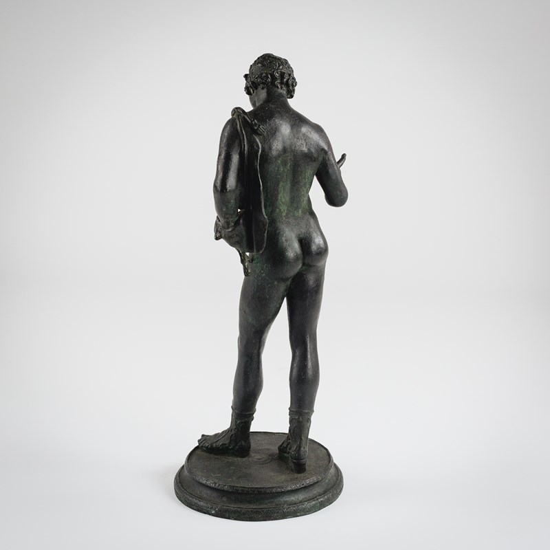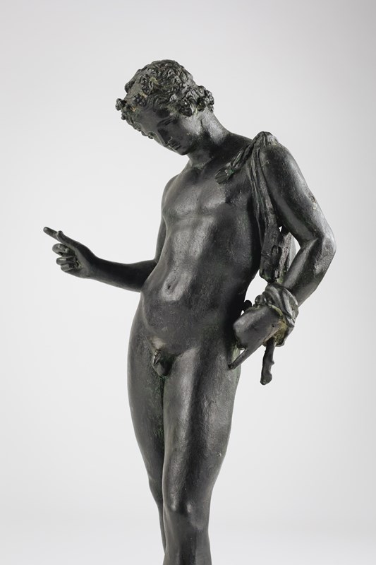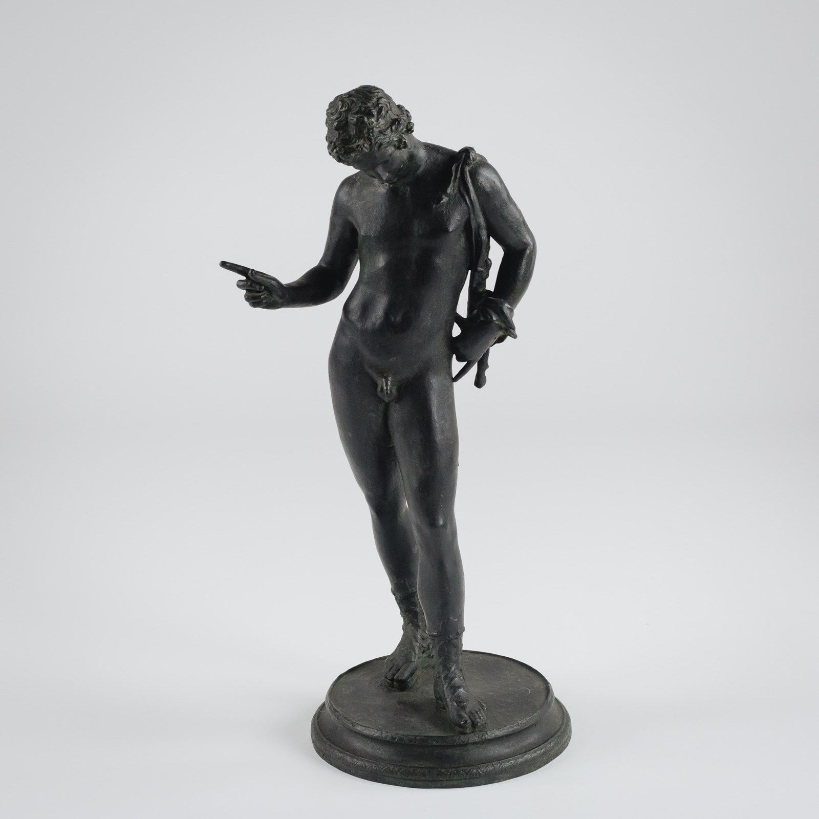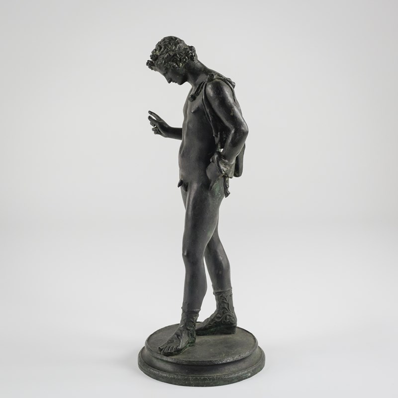 Bronze Figure of Narcissus Italy, late 19th century After the Antique Cast in bronze with a rich light verdigris patina, this finely modeled figure represents Narcissus, the beautiful youth of Greek mythology who fell in love with his own reflection. Standing in a relaxed contrapposto pose, the youth gazes downward, his expression serene and introspective. The elegant proportions, idealized features, and sensuous modeling of the body recall the celebrated Roman marble found at Pompeii, now in the Museo Archeologico Nazionale, Naples. Such bronzes were highly prized souvenirs of the Grand Tour-journeys undertaken by educated Europeans in the 18th and 19th centuries to study the art and antiquities of classical civilization. This example reflects both the technical excellence of Italian foundries and the enduring fascination with ancient ideals of beauty and contemplation. Material: Bronze Provenance: Grand Tour, Italy Model: After the ancient Narcissus of Pompeii