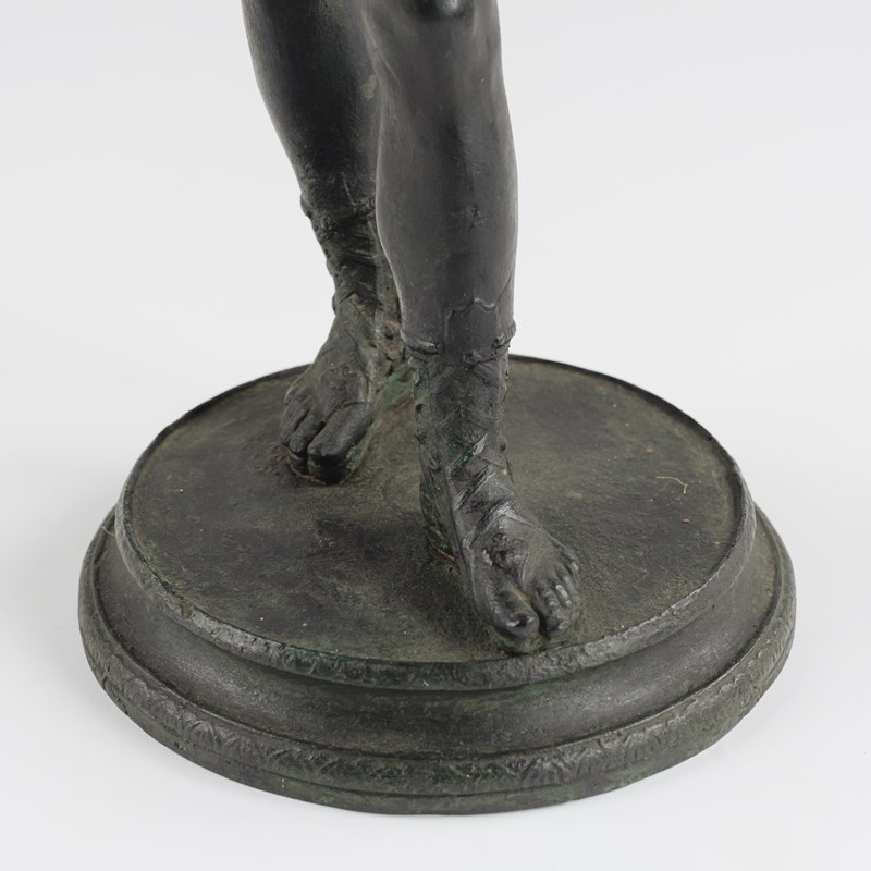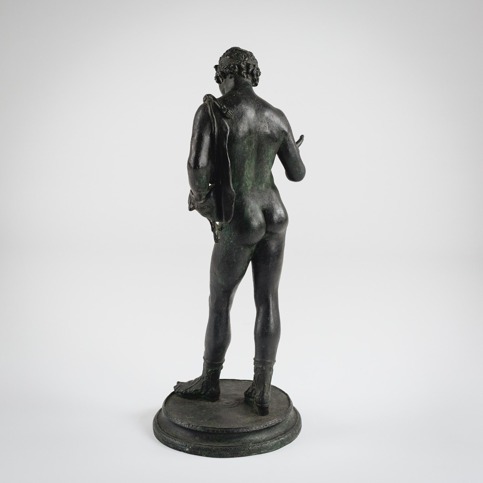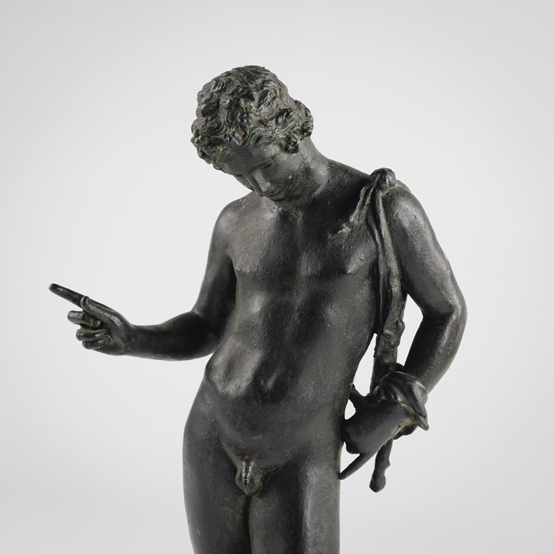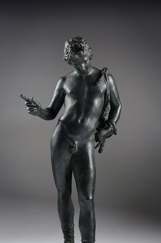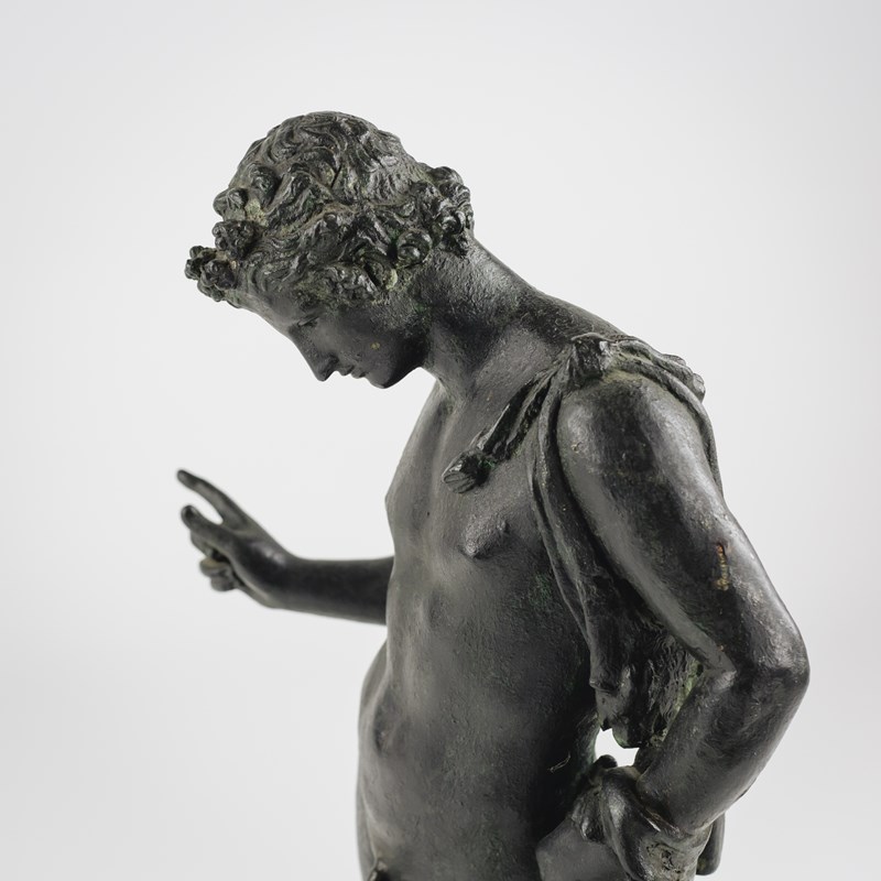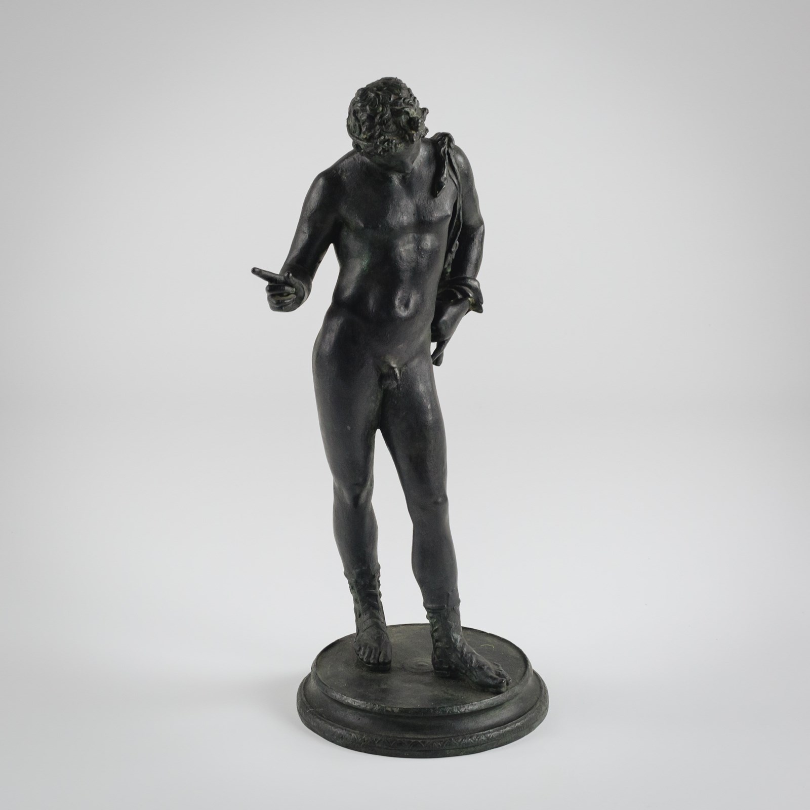 Bronze Figure of Narcissus Italy, late 19th century After the Antique Cast in bronze with a rich light verdigris patina, this finely modeled figure represents Narcissus, the beautiful youth of Greek mythology who fell in love with his own reflection. Standing in a relaxed contrapposto pose, the youth gazes downward, his expression serene and introspective. The elegant proportions, idealized features, and sensuous modeling of the body recall the celebrated Roman marble found at Pompeii, now in the Museo Archeologico Nazionale, Naples. Such bronzes were highly prized souvenirs of the Grand Tour-journeys undertaken by educated Europeans in the 18th and 19th centuries to study the art and antiquities of classical civilization. This example reflects both the technical excellence of Italian foundries and the enduring fascination with ancient ideals of beauty and contemplation. Material: Bronze Provenance: Grand Tour, Italy Model: After the ancient Narcissus of Pompeii