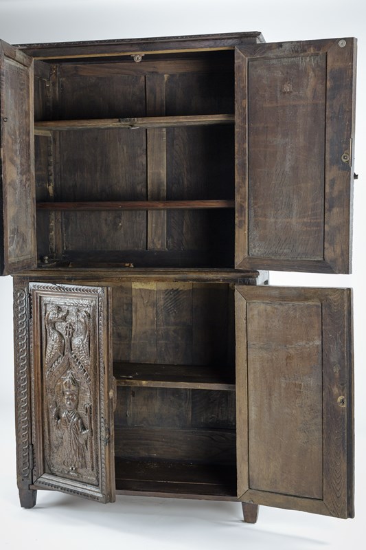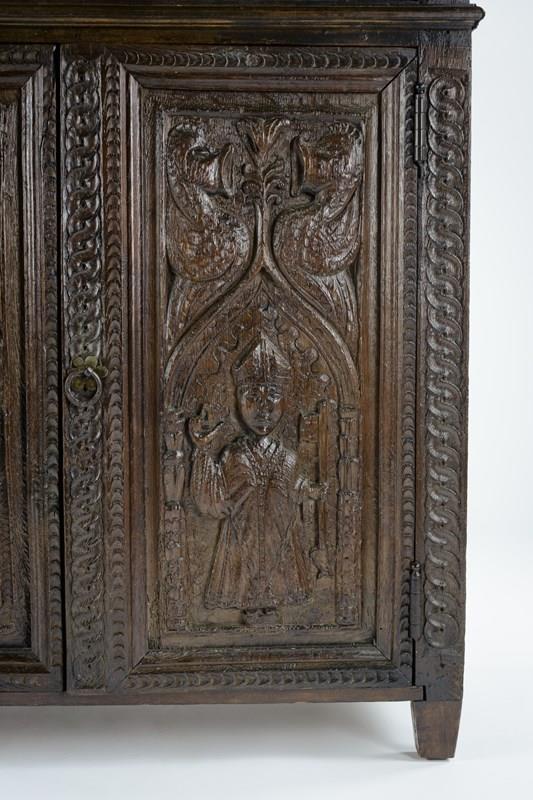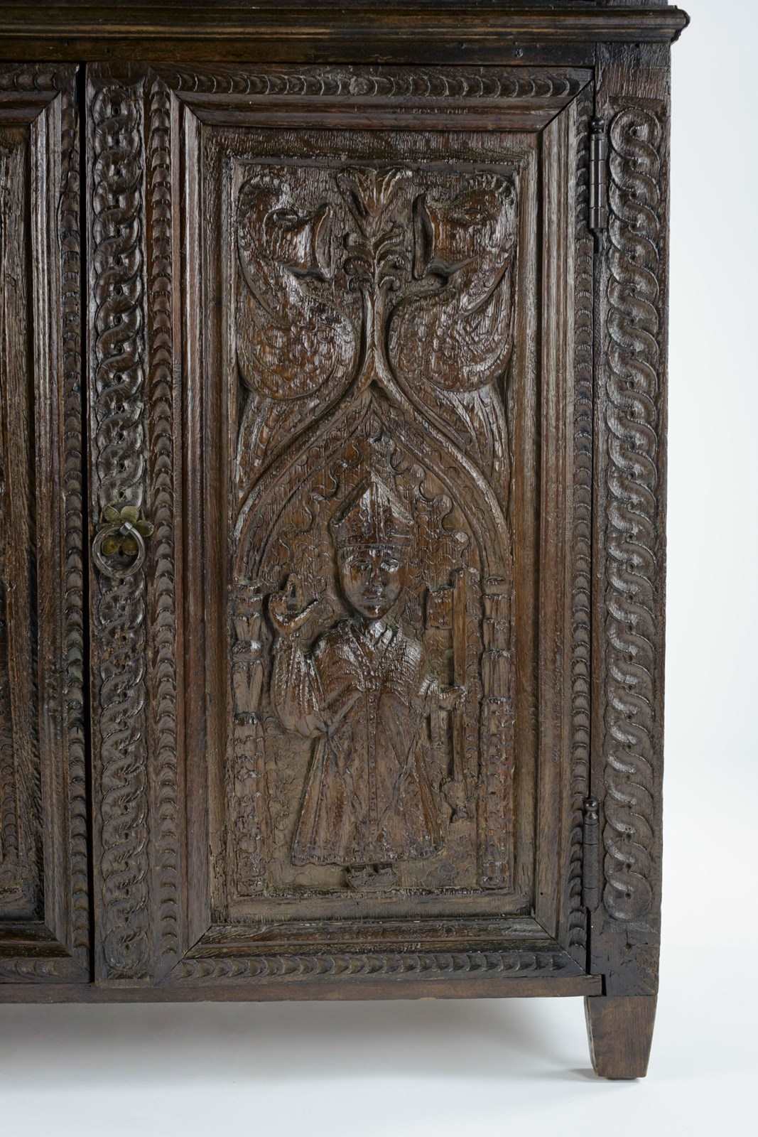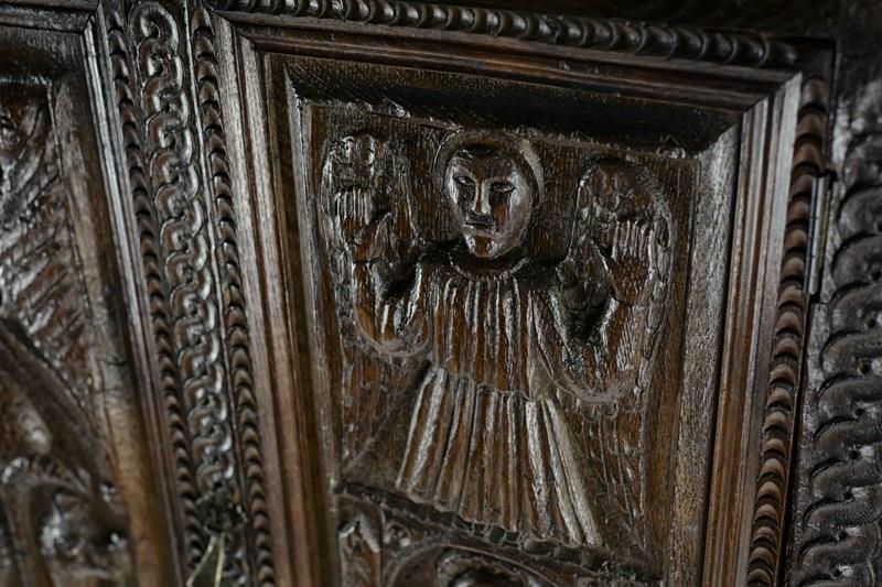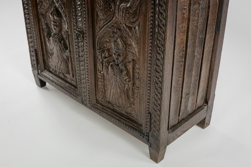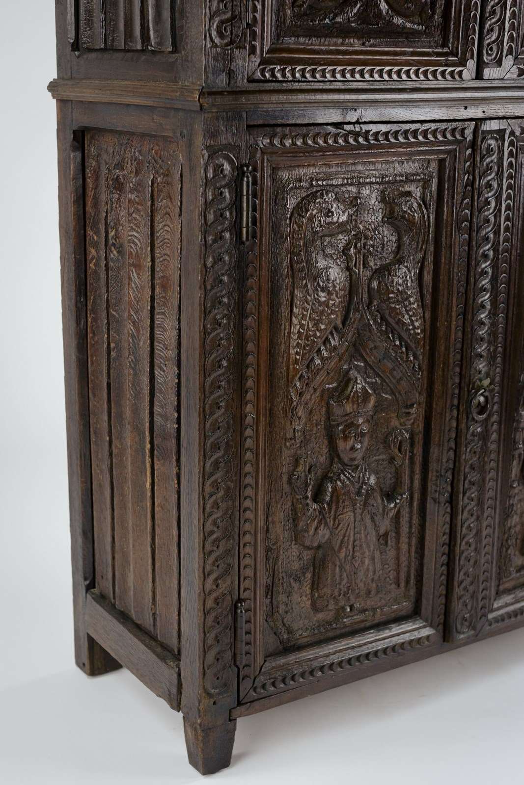 Small, Impressive Oak Cupboard. 19th Century construction using 16th & 17th Century oak panels carved in deep relief of angels and bishops. Panels originally from Chateau outside Grignon, Cote D'or. France. France Circa 1890.