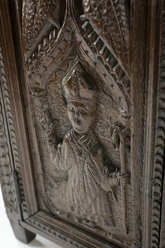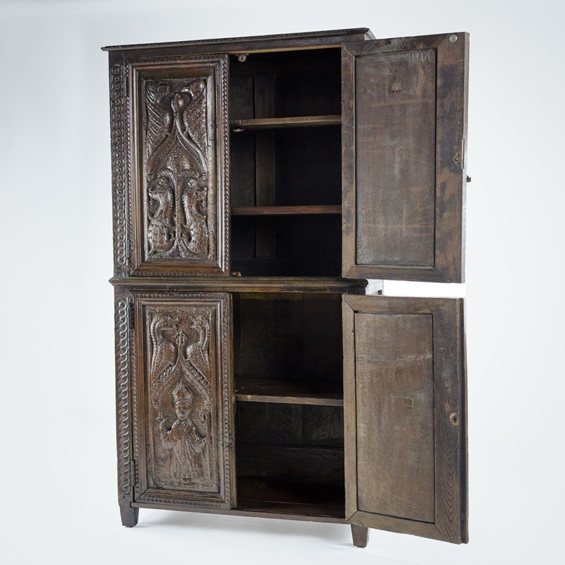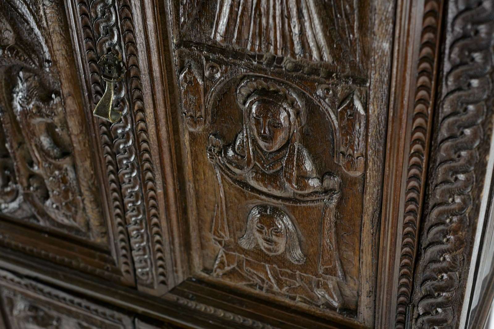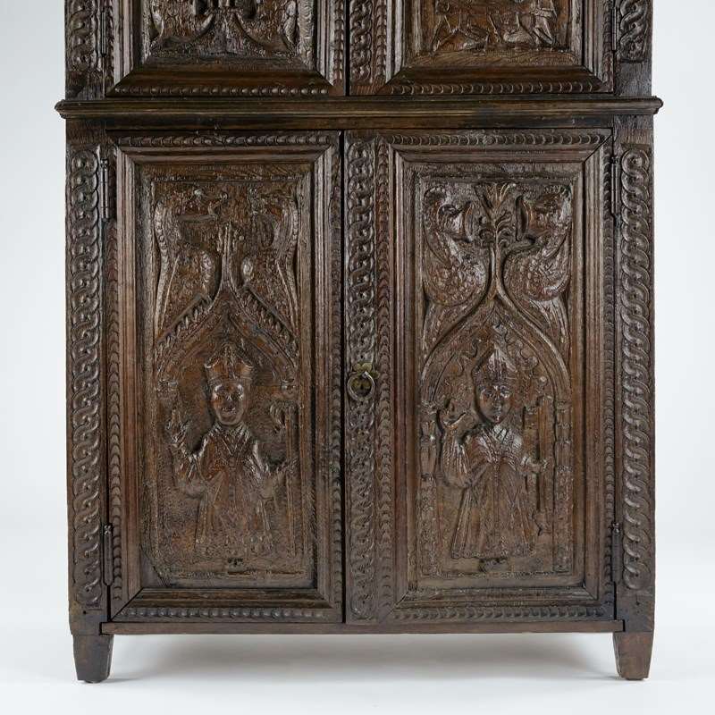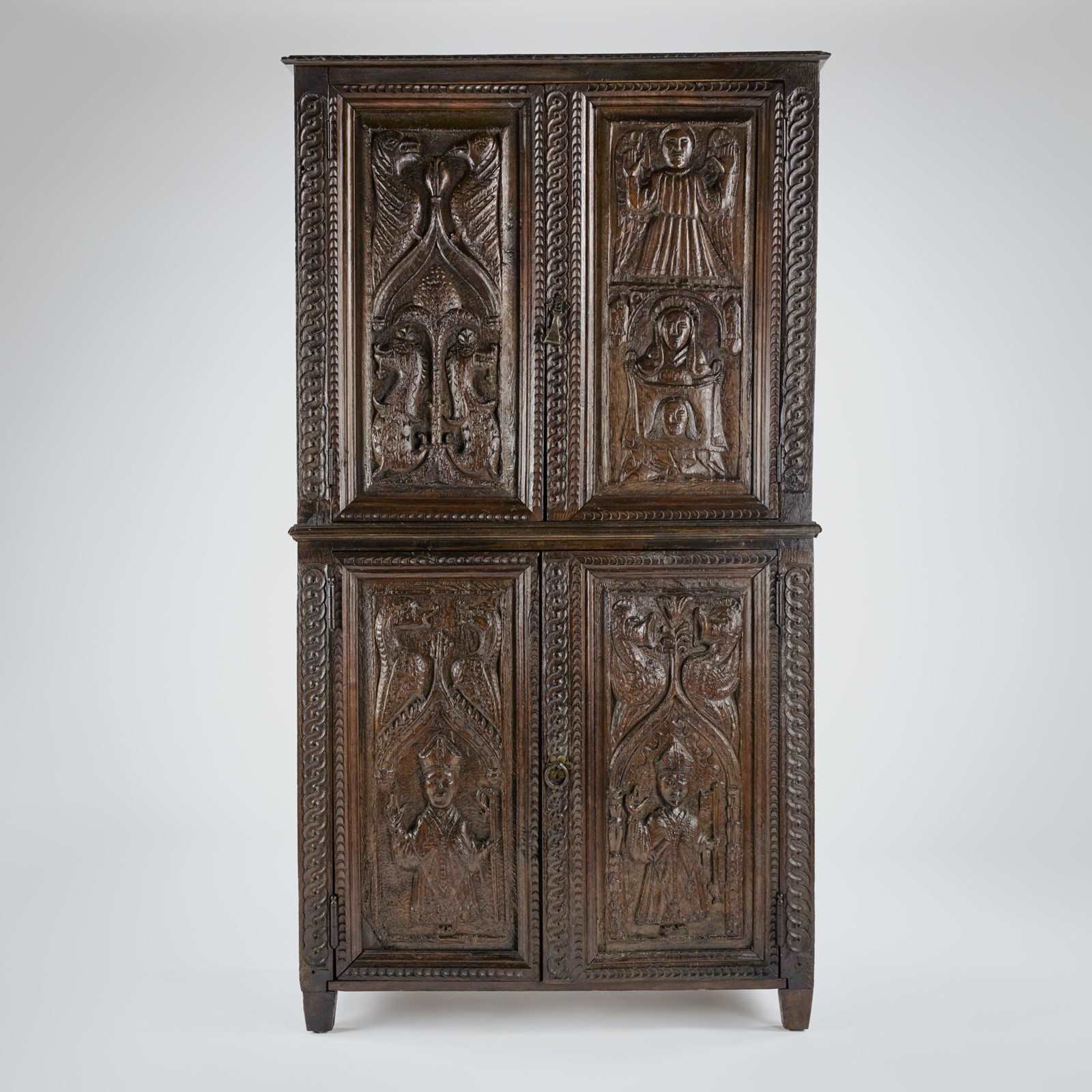 Small, Impressive Oak Cupboard. 19th Century construction using 16th & 17th Century oak panels carved in deep relief of angels and bishops. Panels originally from Chateau outside Grignon, Cote D'or. France. France Circa 1890.