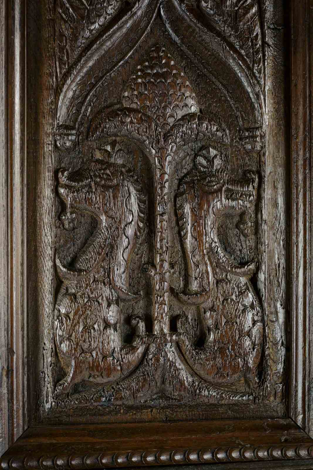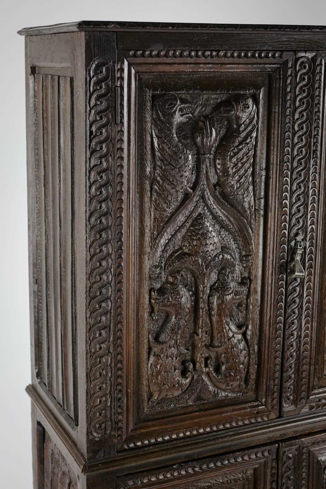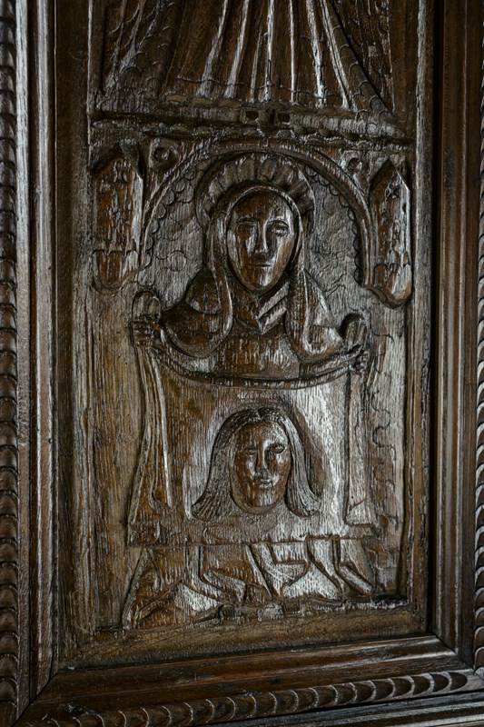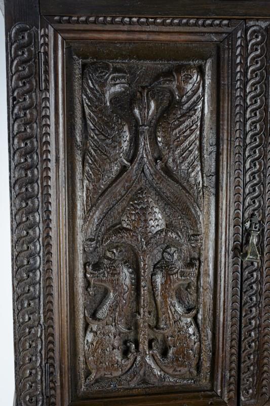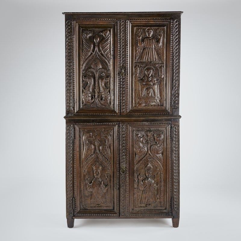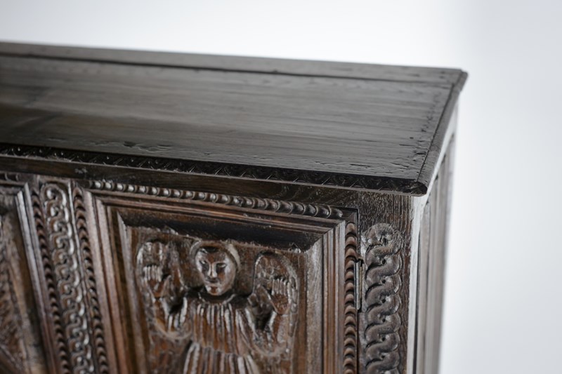 Small, Impressive Oak Cupboard. 19th Century construction using 16th & 17th Century oak panels carved in deep relief of angels and bishops. Panels originally from Chateau outside Grignon, Cote D'or. France. France Circa 1890.